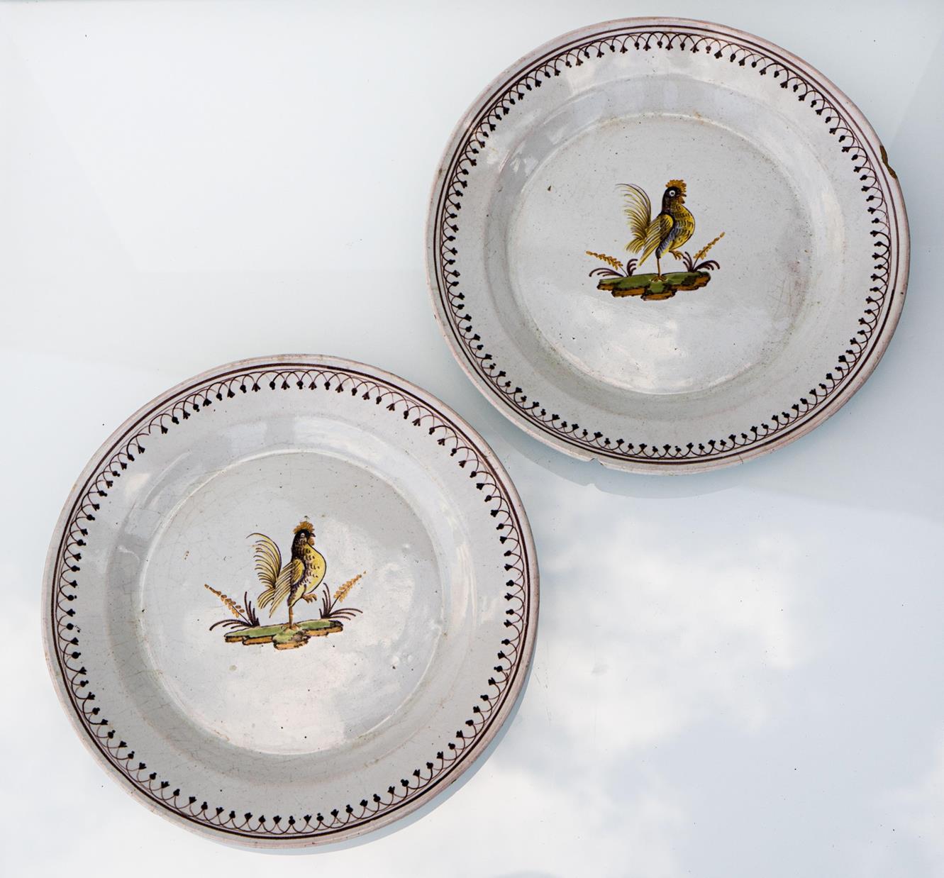 Coppia di piatti con gallo dipinto al centro. Manifattura della Real Fabbrica di Capodimonte degli inizi del XIX secolo
