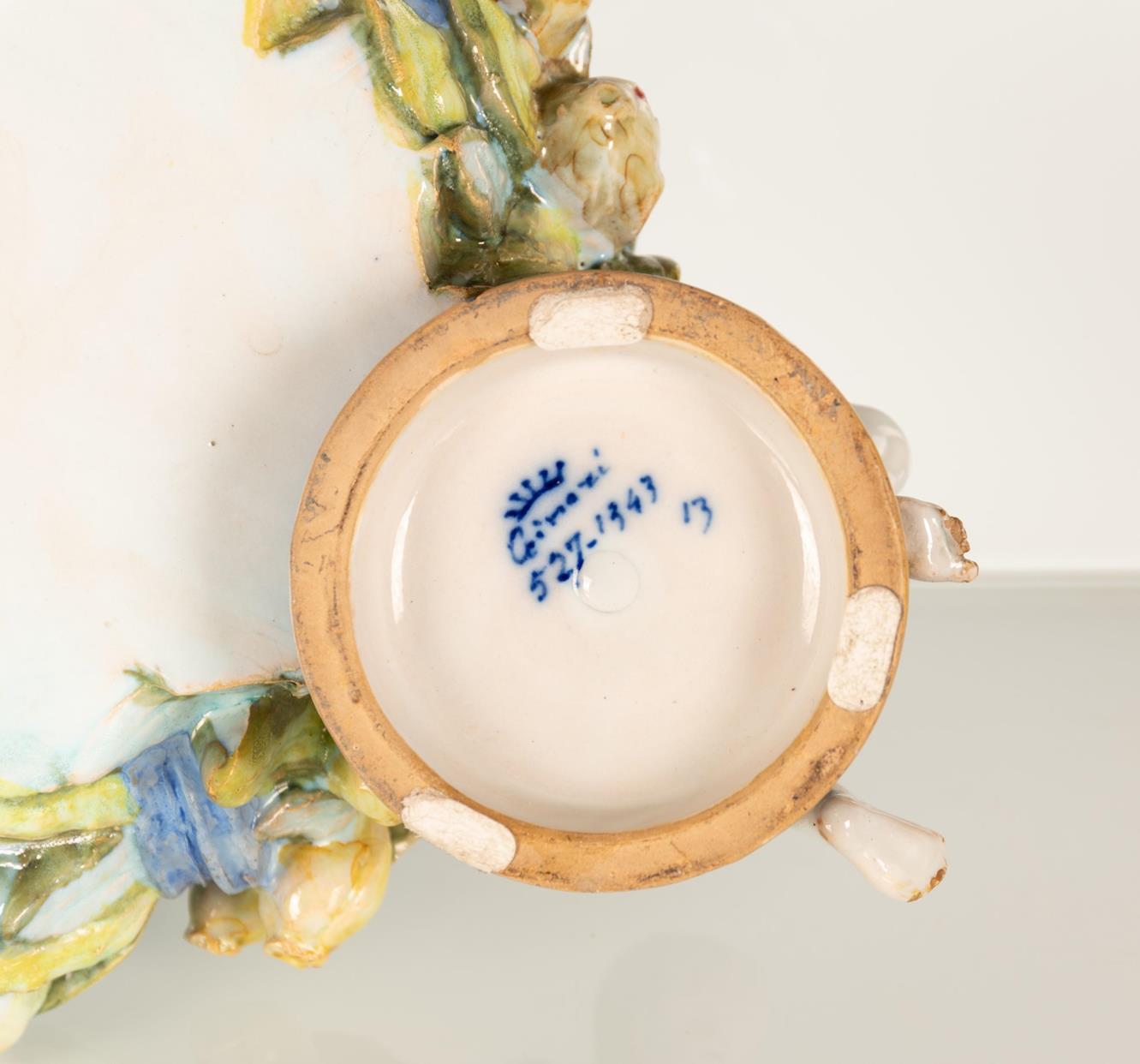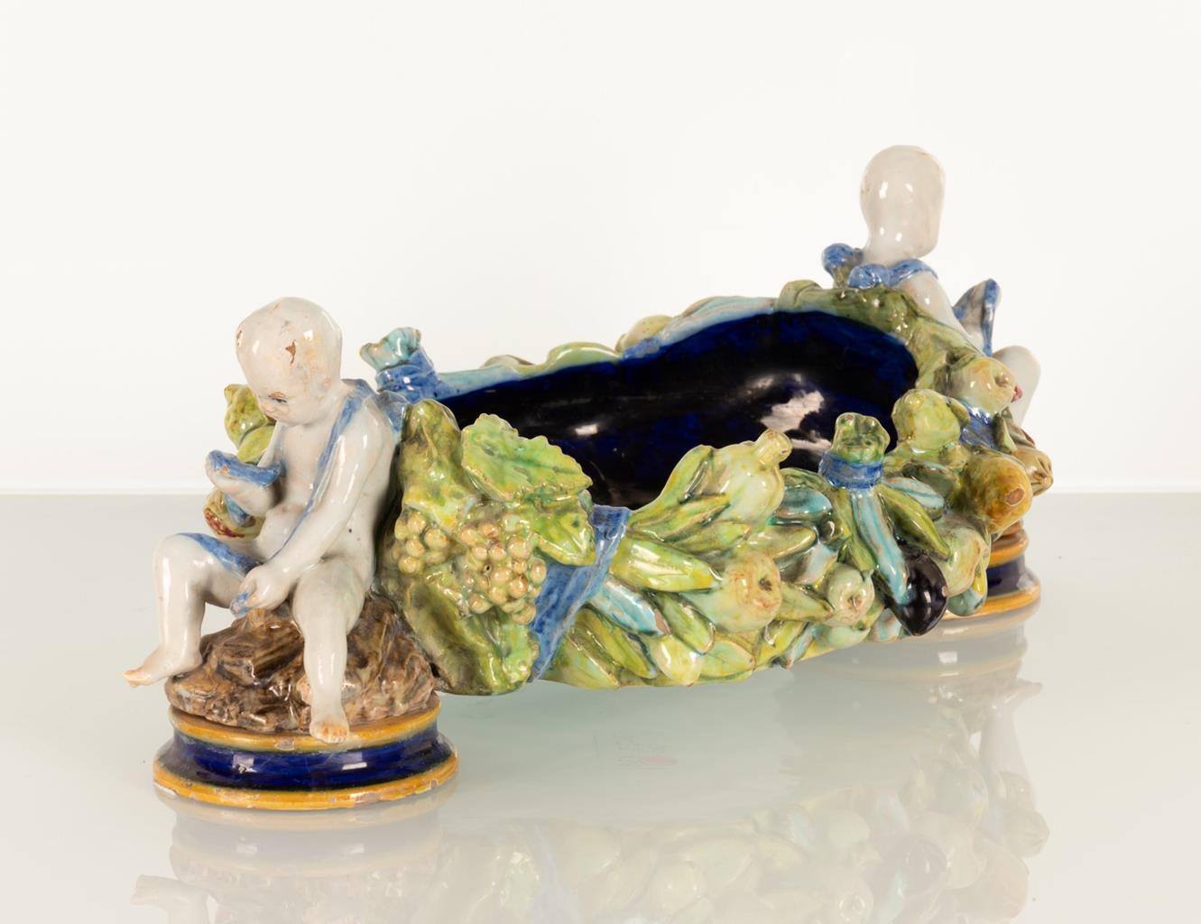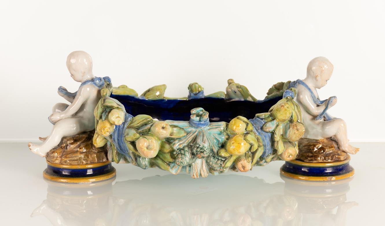 Lot 302 | Centrotavola di gusto robbiano neoquattrocentesco con ai lati due putti in maiolica bianca modellati a tutt tondo che trattengono una ghirlanda di frutta