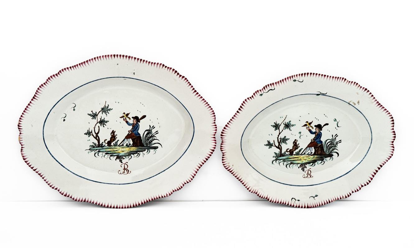 Coppia di piatti a fiamminga con scena di cacciatore, cane e uccello.