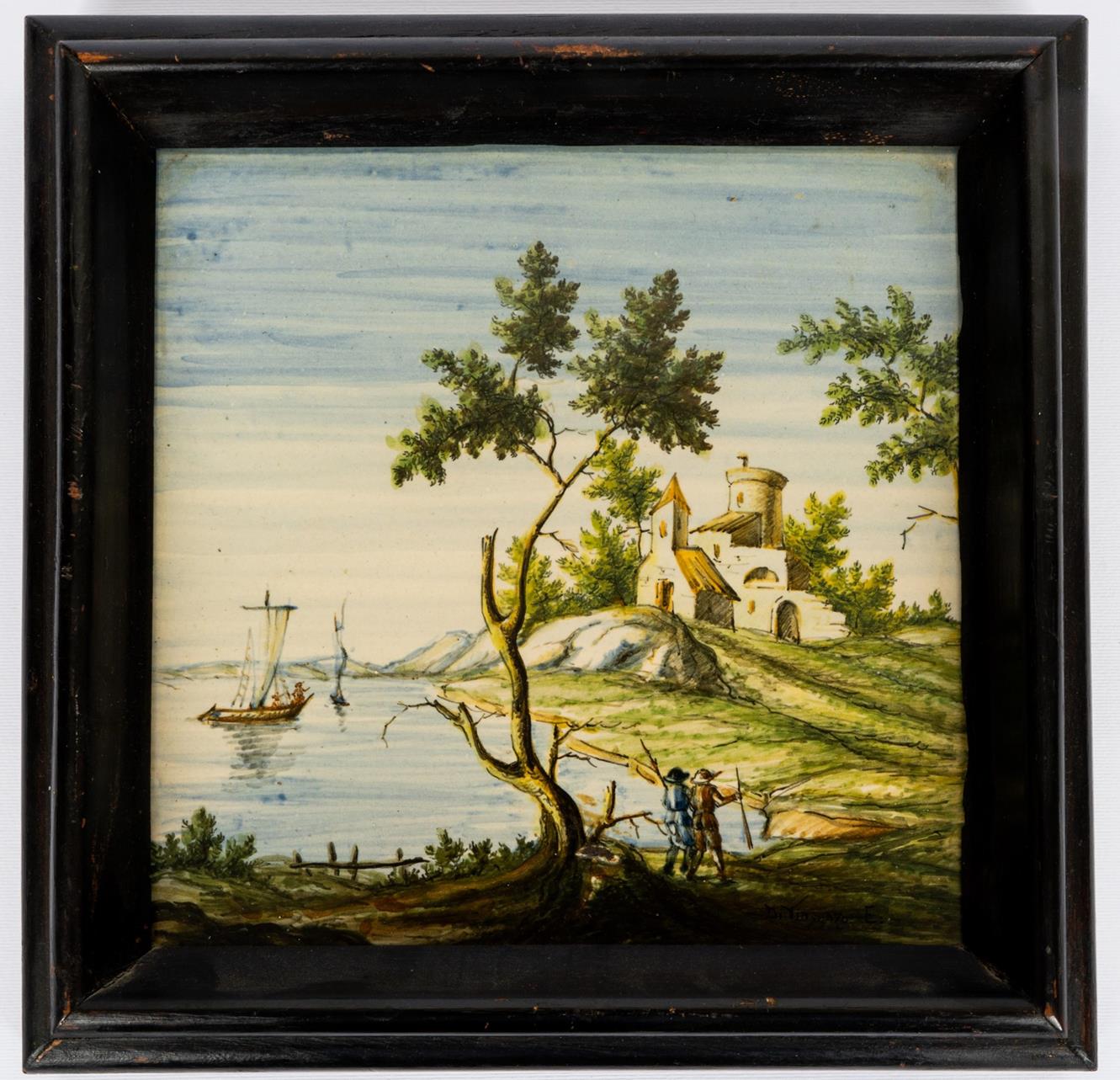 Lot 306 | Mattonella maiolicata raffigurante baia con navi a vela e militi in paesaggio rurale. Firmato E. di Vincenzo