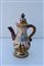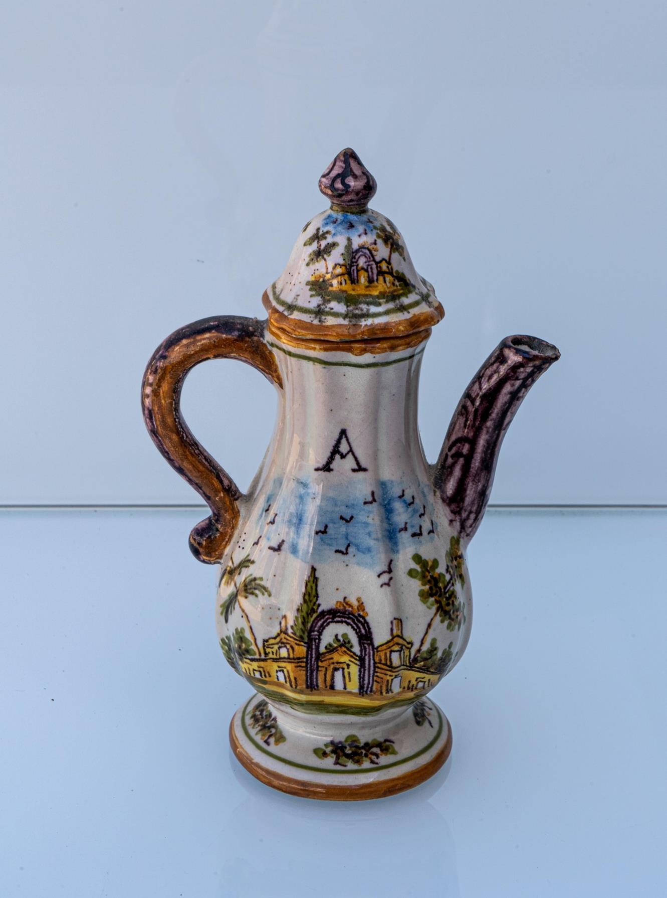 Piccola caffettiera con lettera "A" e decoro con paesaggio e ruderi. Manifattura Molaroni, Pesaro XVIII secolo
