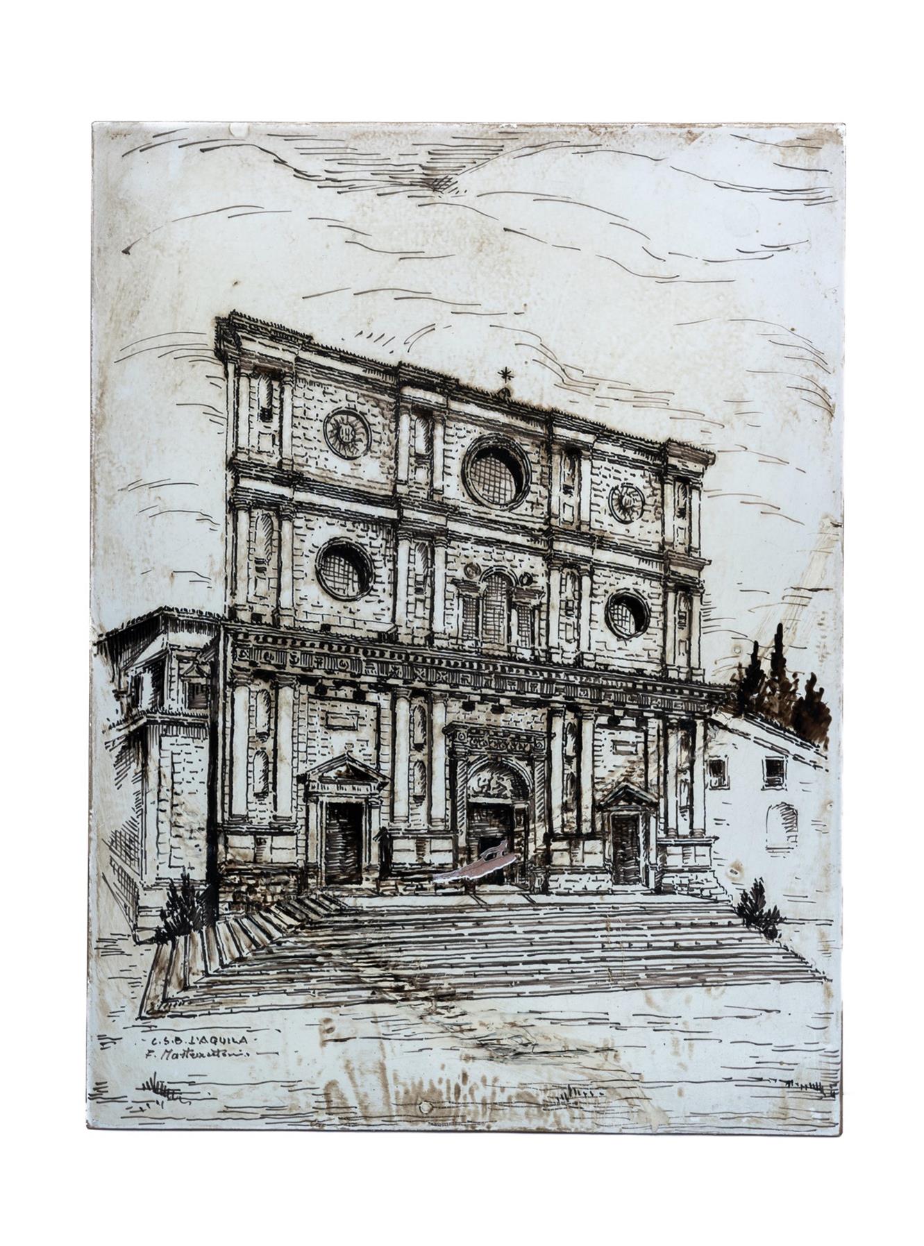 Lot 316 | Mattonella maiolicata in monocromia rappresentante la Basilica di San Bernardino a L'Aquila, tratta da un'incisione del 1899 Manifattura aquilana del XX secolo