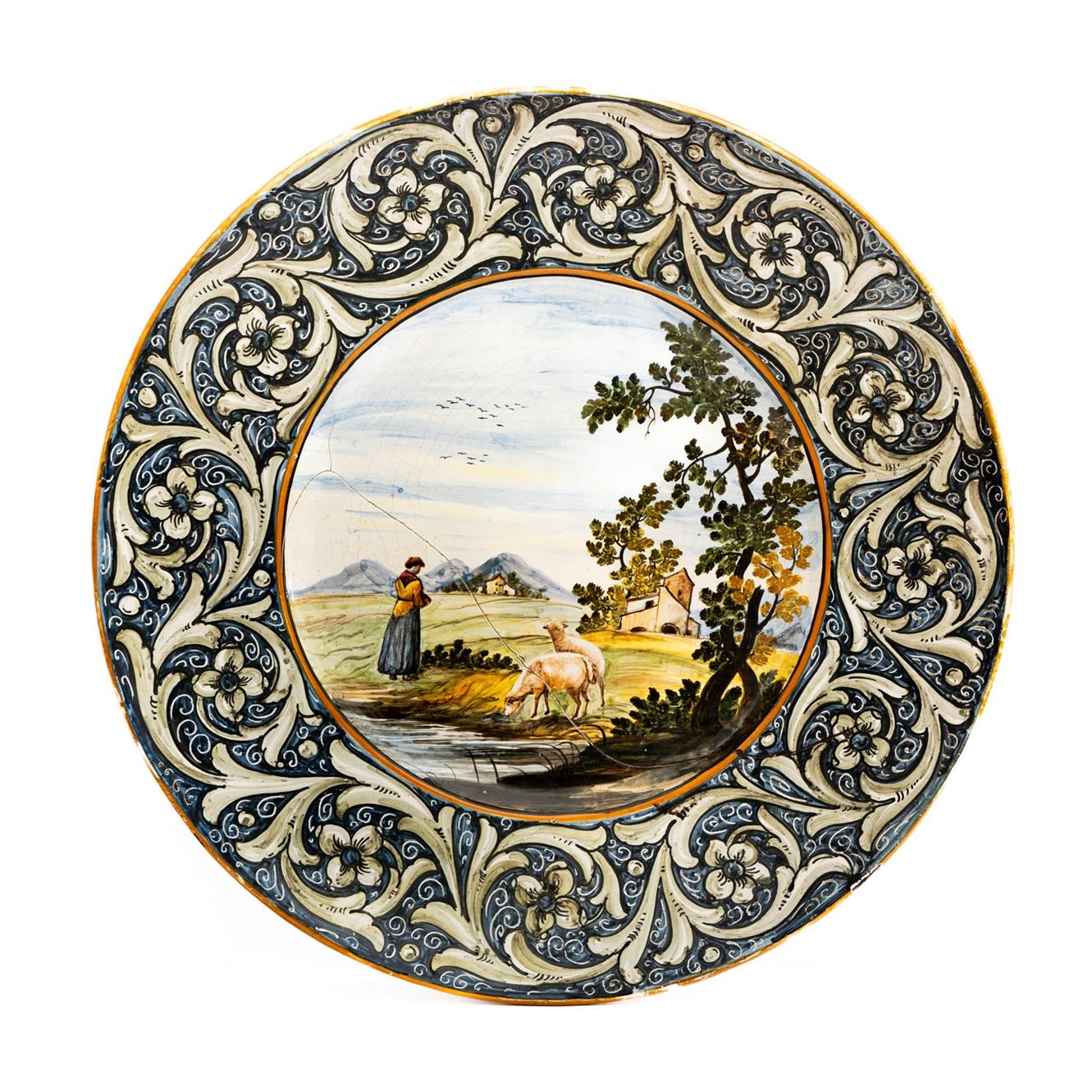 Grande piatto di Castelli. Manifattura Stella con decoro a girali fogliati sulla tesa e paesaggio agreste con donna e pecore sul greto del fiume