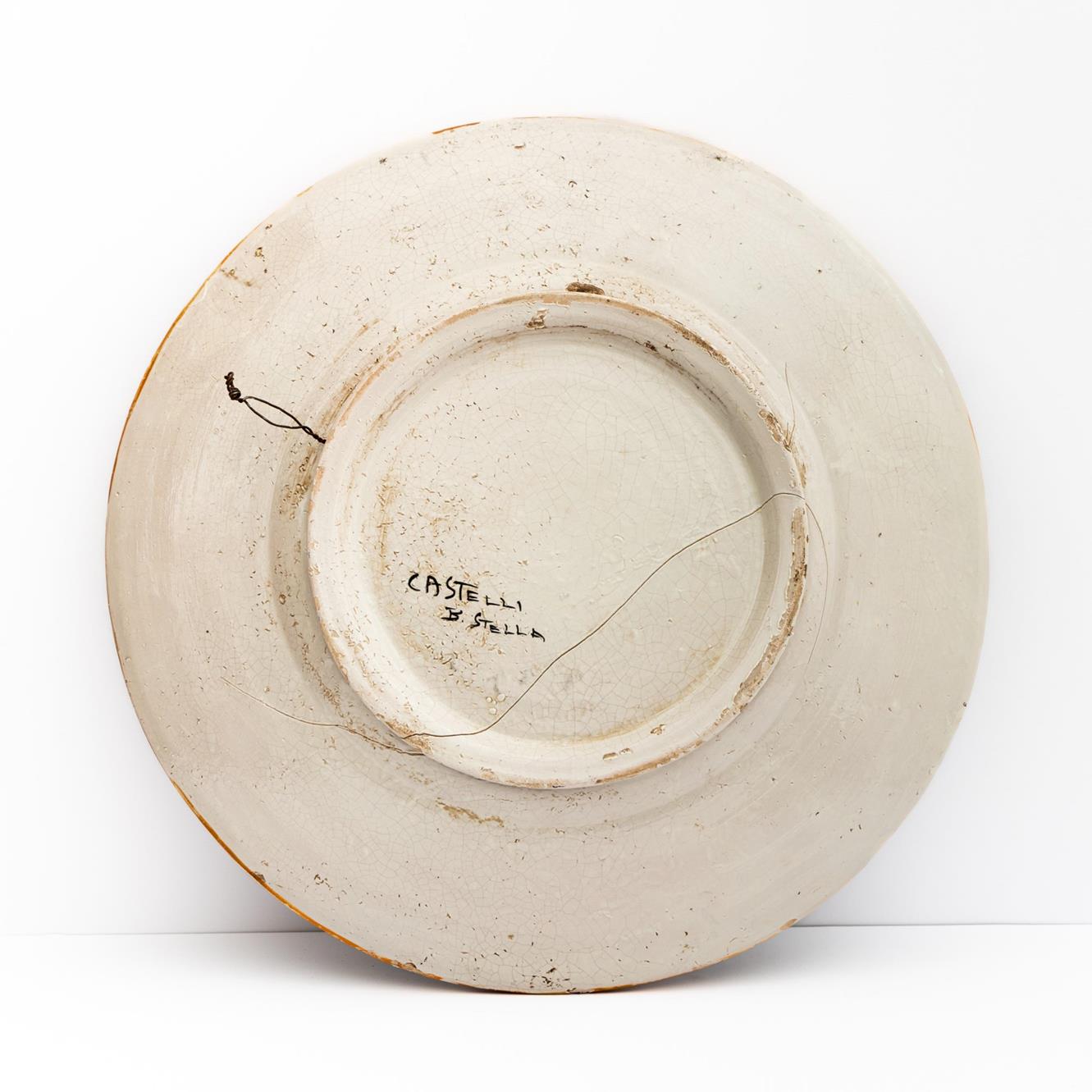 Grande piatto di Castelli. Manifattura Stella con decoro a girali fogliati sulla tesa e paesaggio agreste con donna e pecore sul greto del fiume Manifattura di Castelli della metà del XX secolo