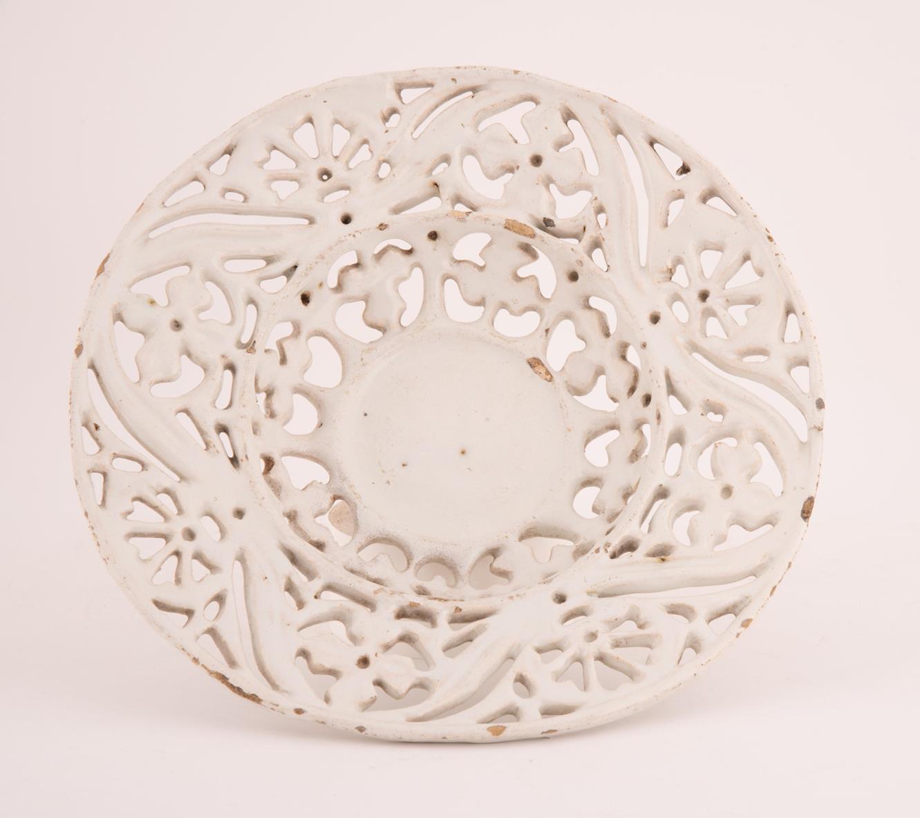 Lot 328 | Crespina in maiolica a fondo bianco e traforata a formare motivo geometrico. Manifattura di Faenza del XVIII secolo