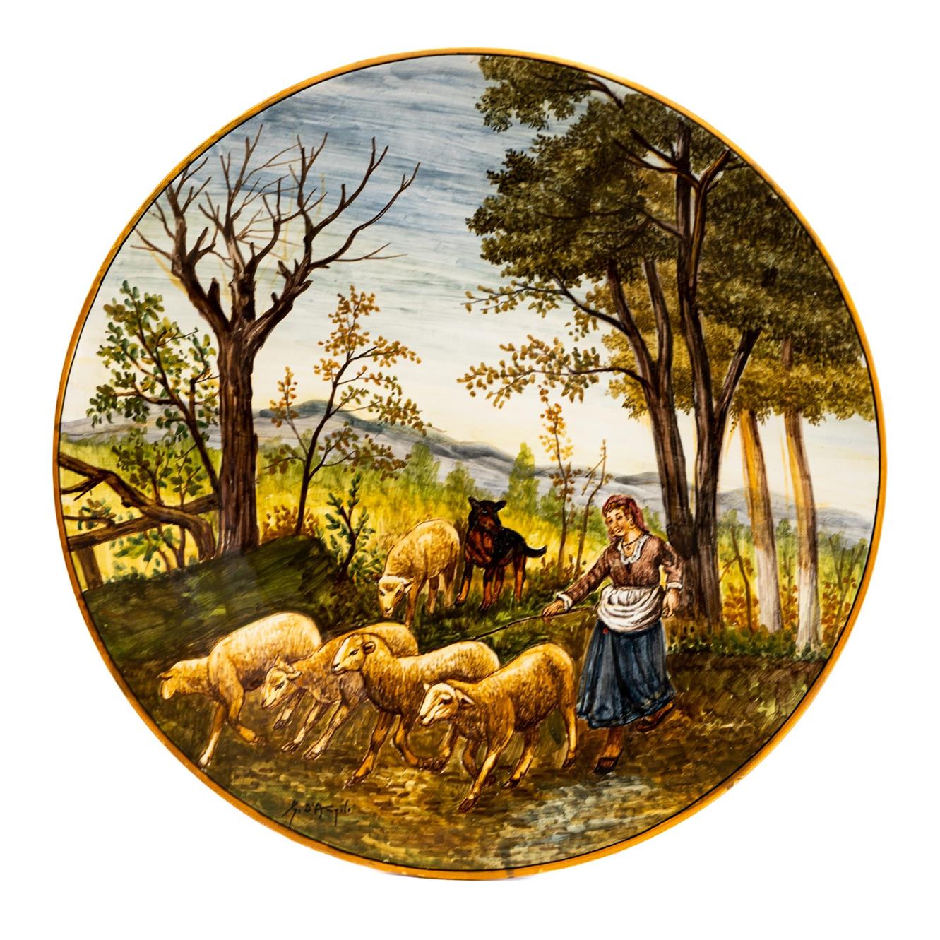 Grande piatto realizzato da Giovanni d'Angelo con pastorella, gregge e cane pastore Manifattura di Rapino della fine del XX secolo