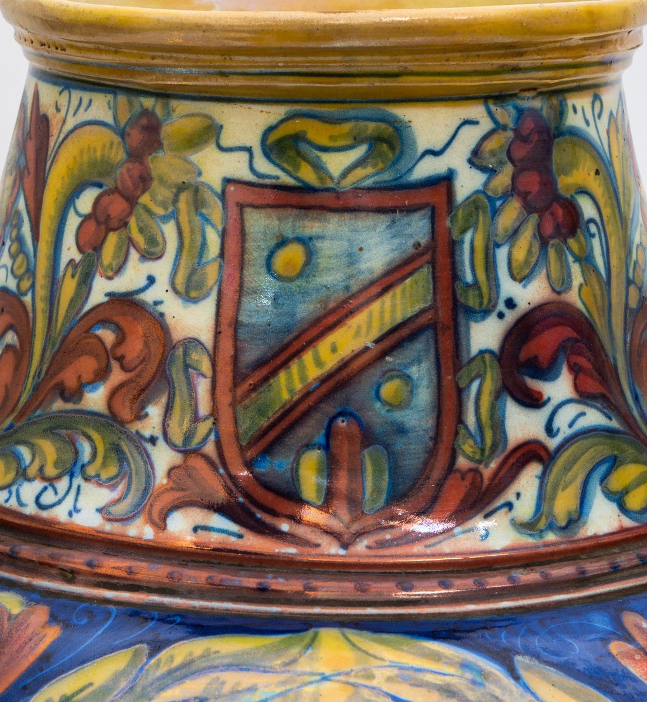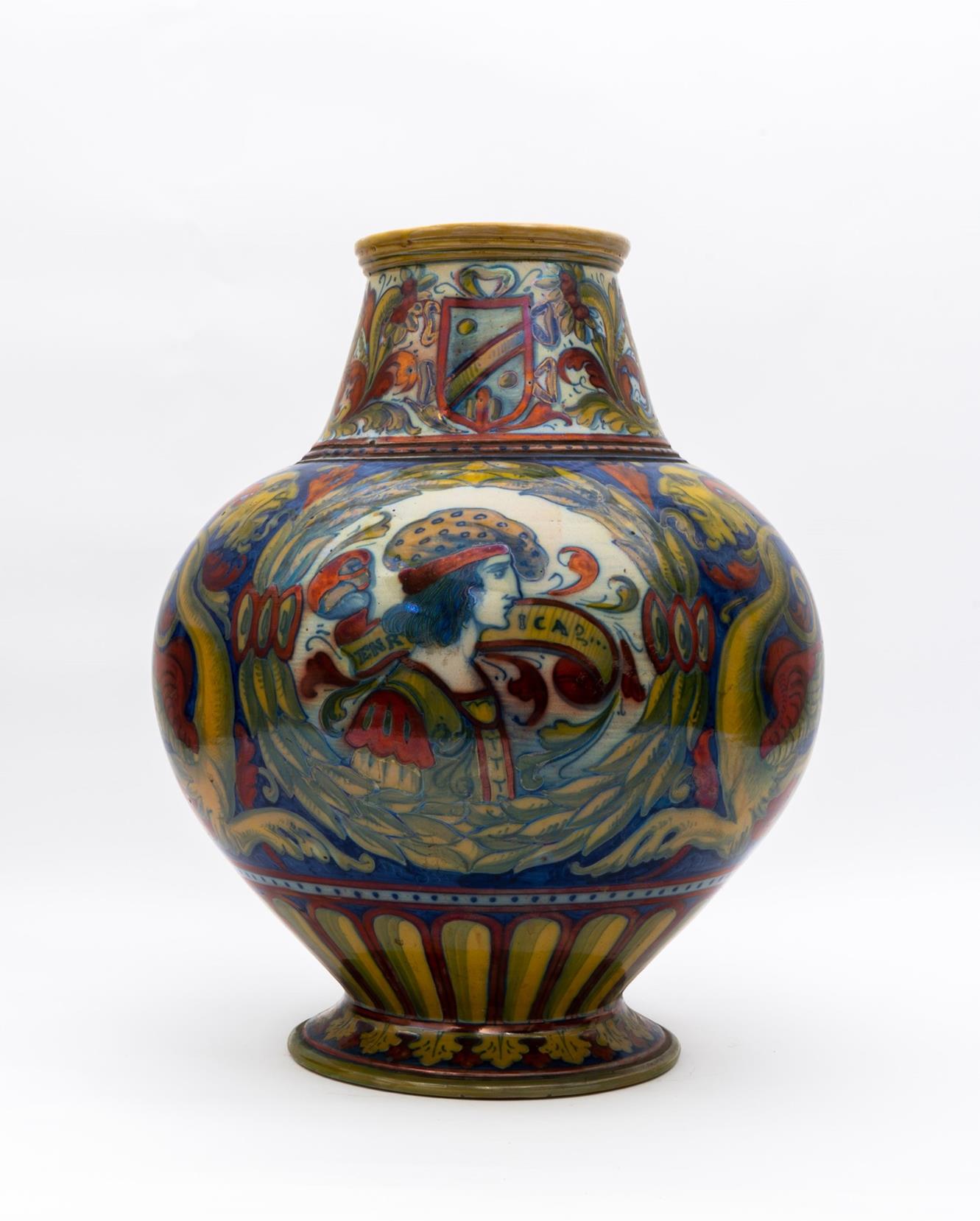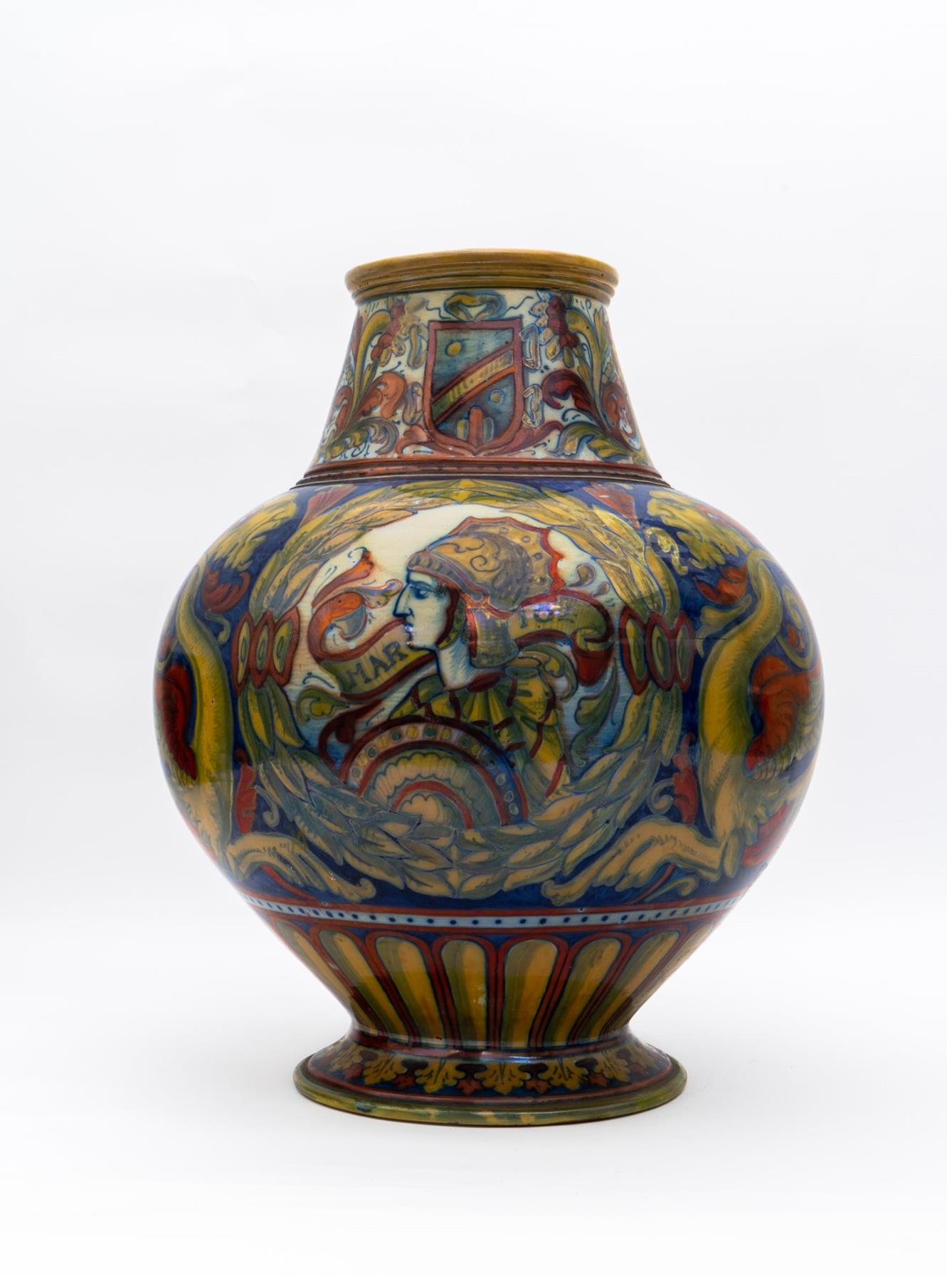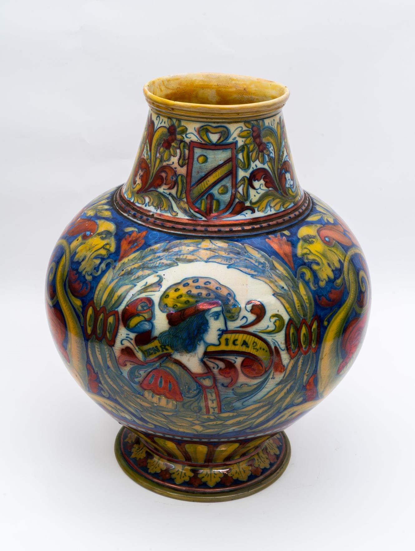Grande vaso a boccia a lustro metallico decorato al fronte con stemma gentilizio sul collo e sul corpo con medaglione centrato con profilo di guerriero e cartiglio "Mario" incorniciato da ghirlanda di foglie di alloro e grottesche di gusto raffaellesco anni Venti del Novecento