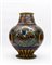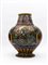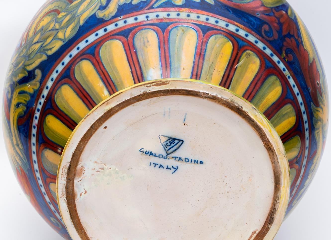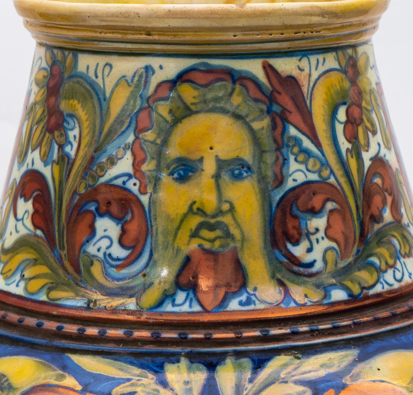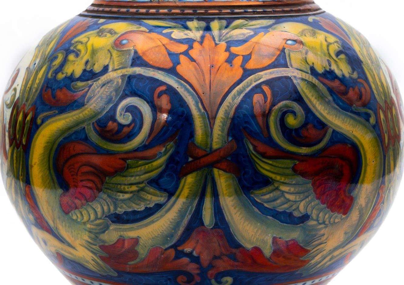 Grande vaso a boccia a lustro metallico decorato al fronte con stemma gentilizio sul collo e sul corpo con medaglione centrato con profilo di guerriero e cartiglio "Mario" incorniciato da ghirlanda di foglie di alloro e grottesche di gusto raffaellesco anni Venti del Novecento