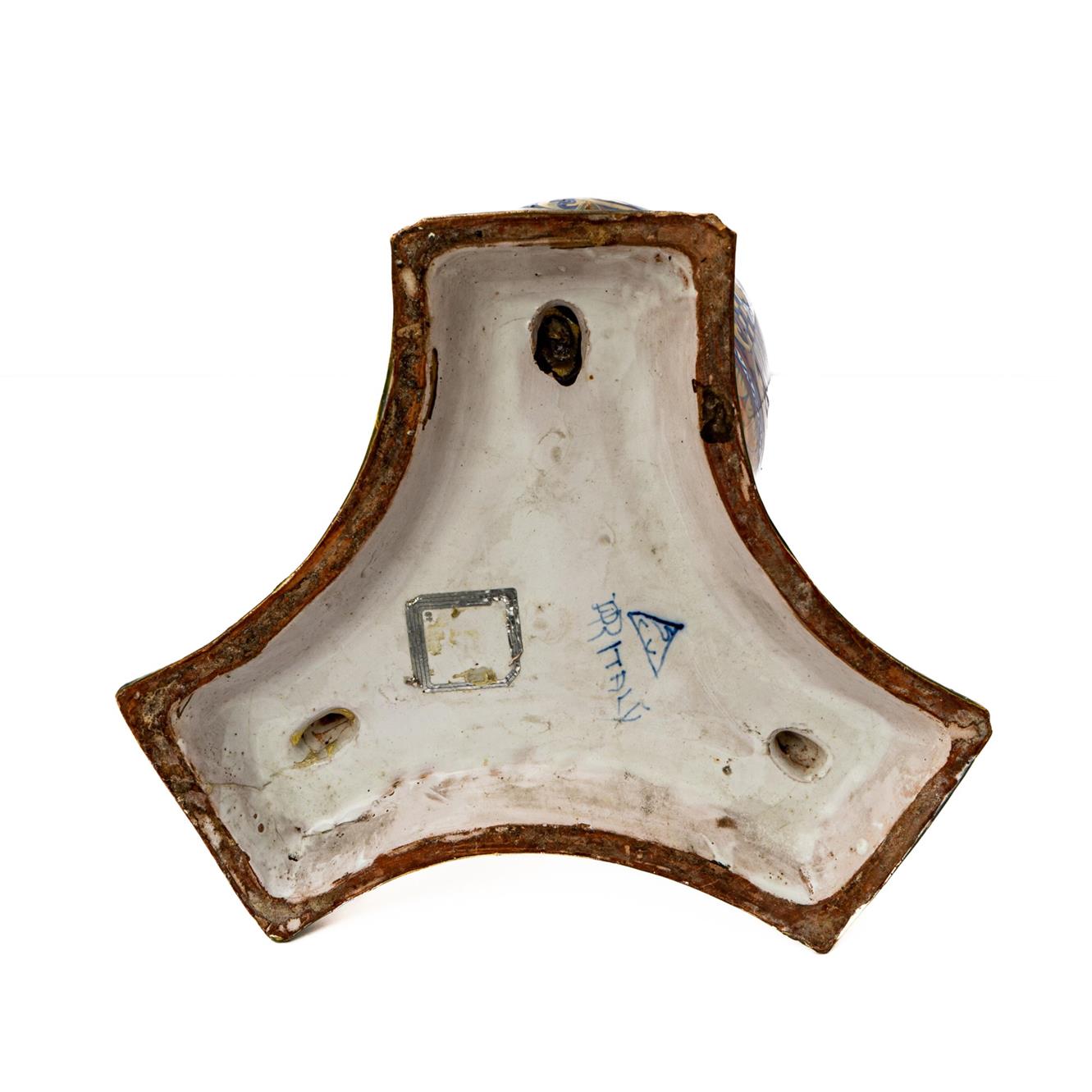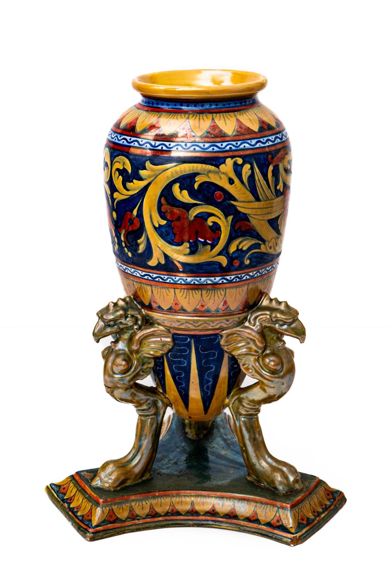 Vaso in maiolioca a lustro metallico a tripode con piedi a guisa di grifoni. Corpo ovoidale con decori a girali fogliati su fondo blu cammeo