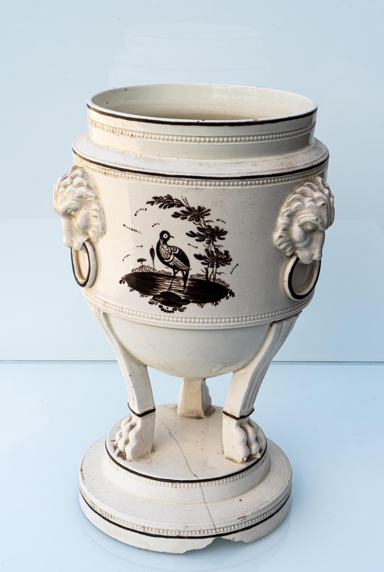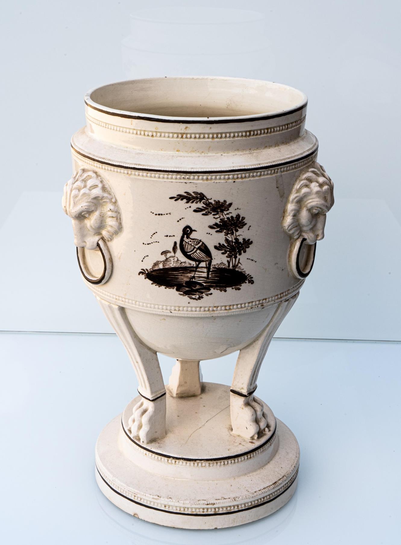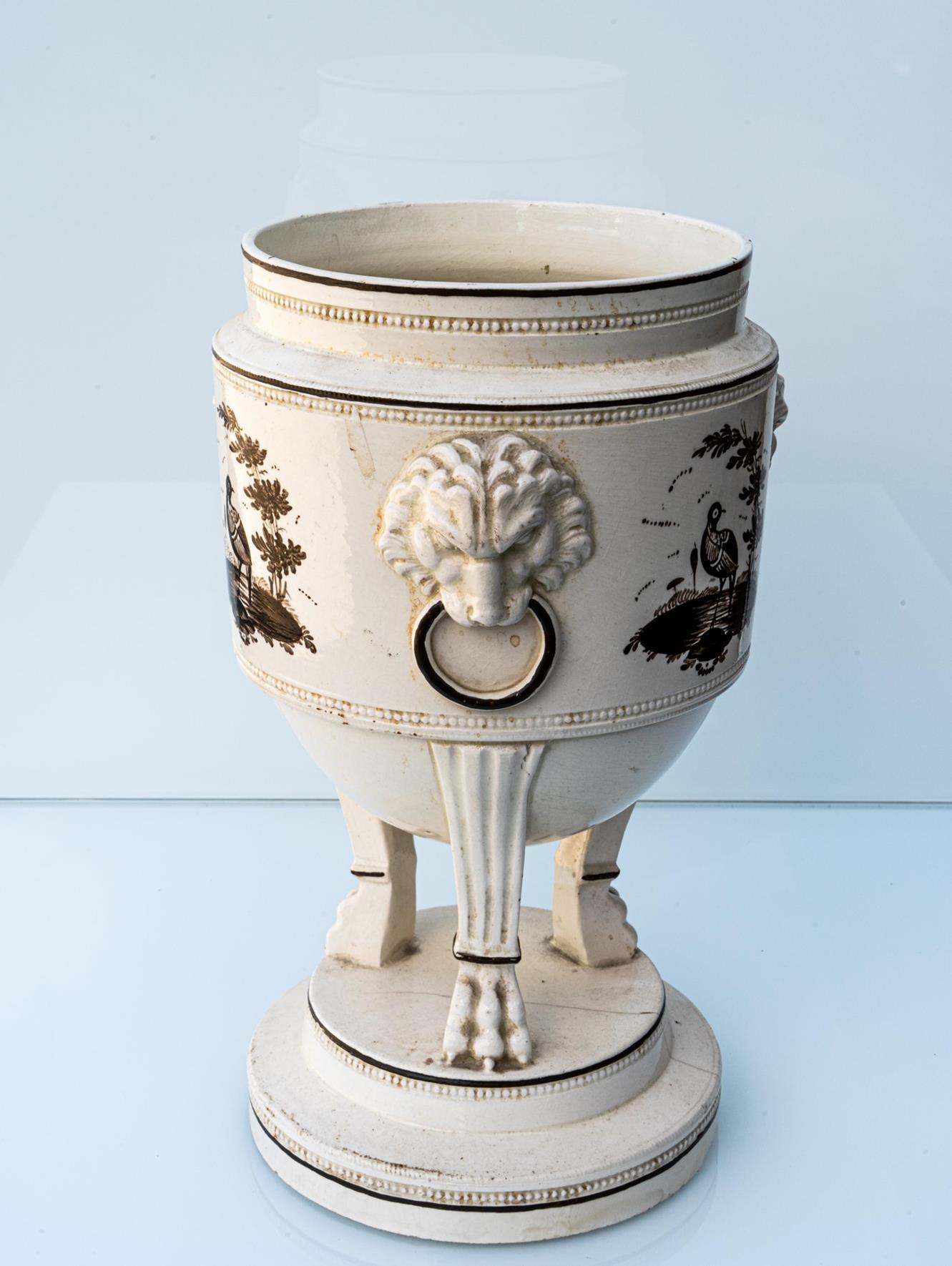 Tripode rinfrescatoio su base, decoro con teste di leone a rilievo e pernici dipinte in terraglia bianca dipinta primo decennio del XIX secolo