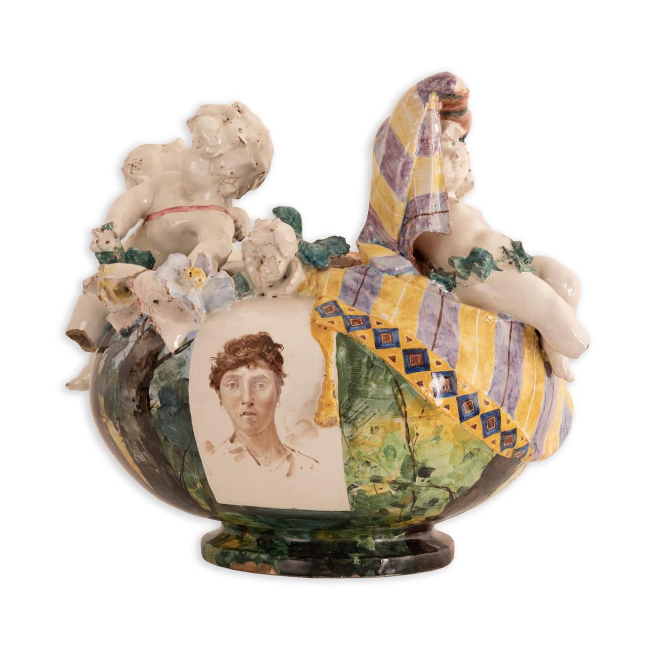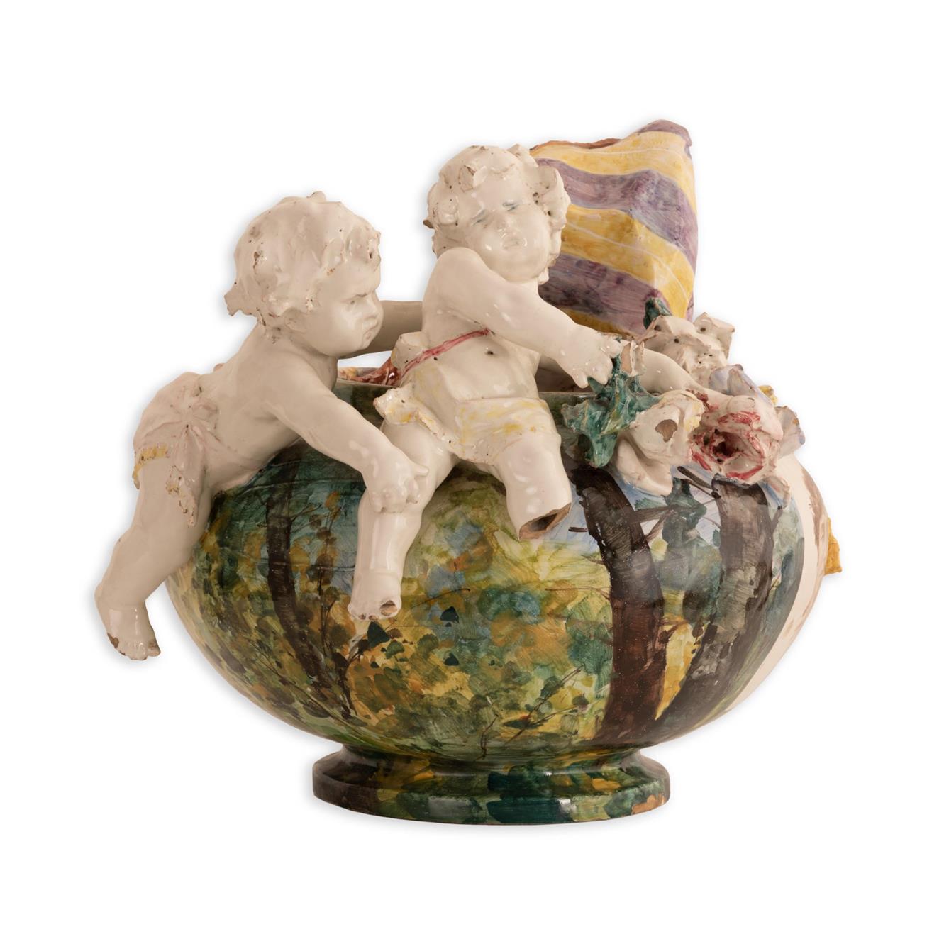 Straordinario vaso da centro con putti e fiori a rilievo interamente dipinto Francesco Paolo Michetti
