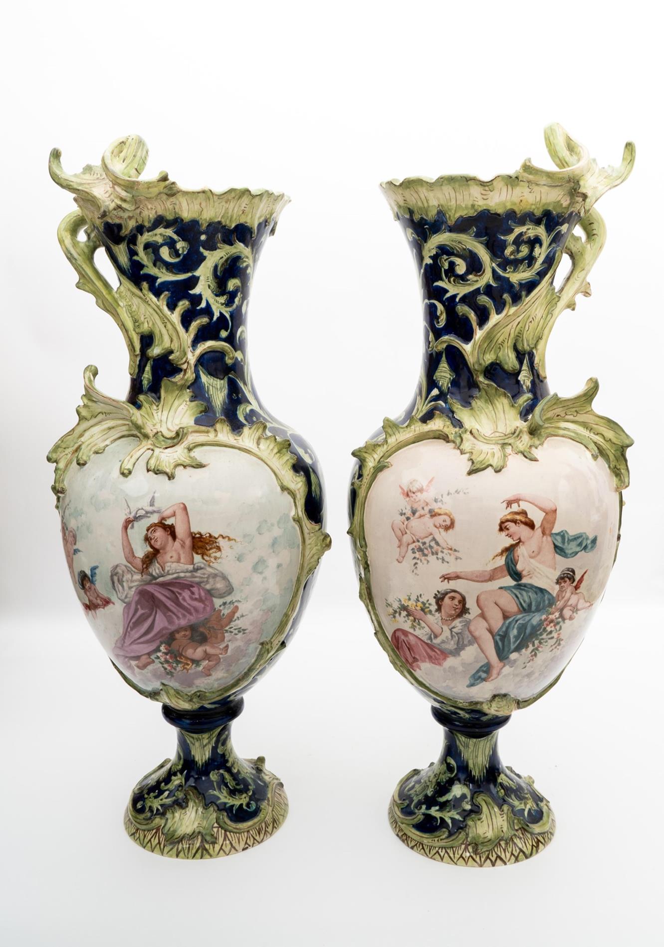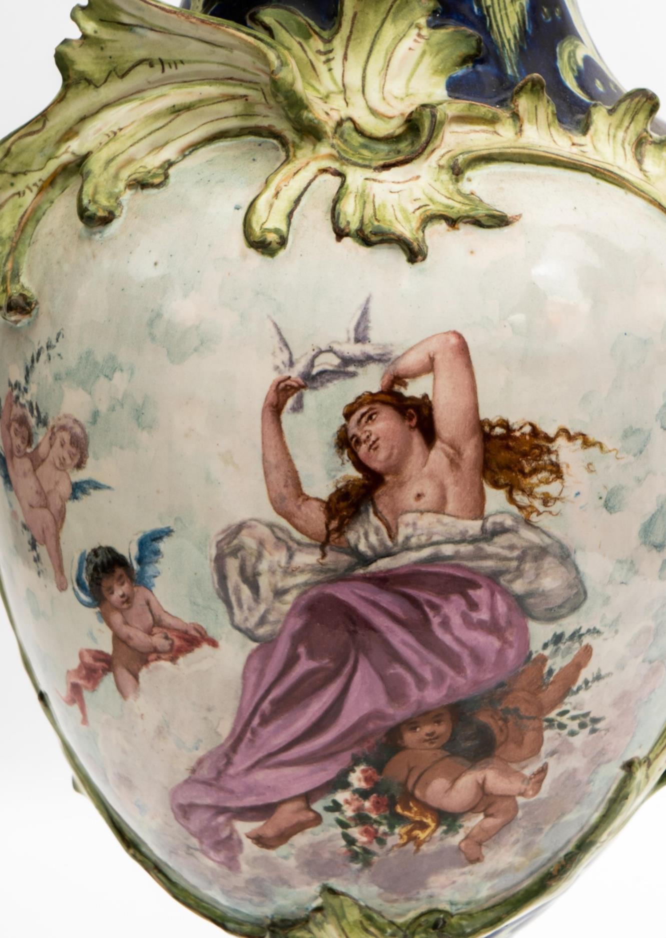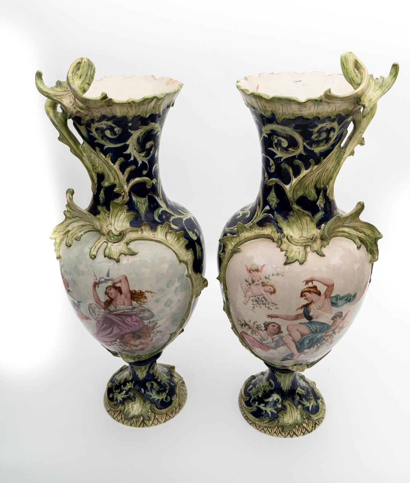 Coppia di vasi con decoro a rilievo di gusto Neorococò centrati da grandi riserve raffiguranti figure allegoriche Manifattura Mollica, Napoli fine del XIX secolo