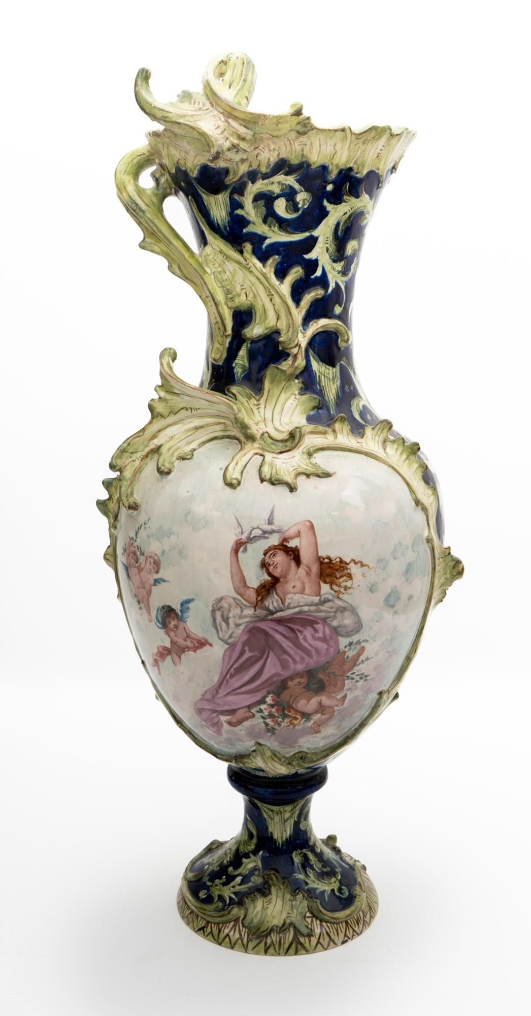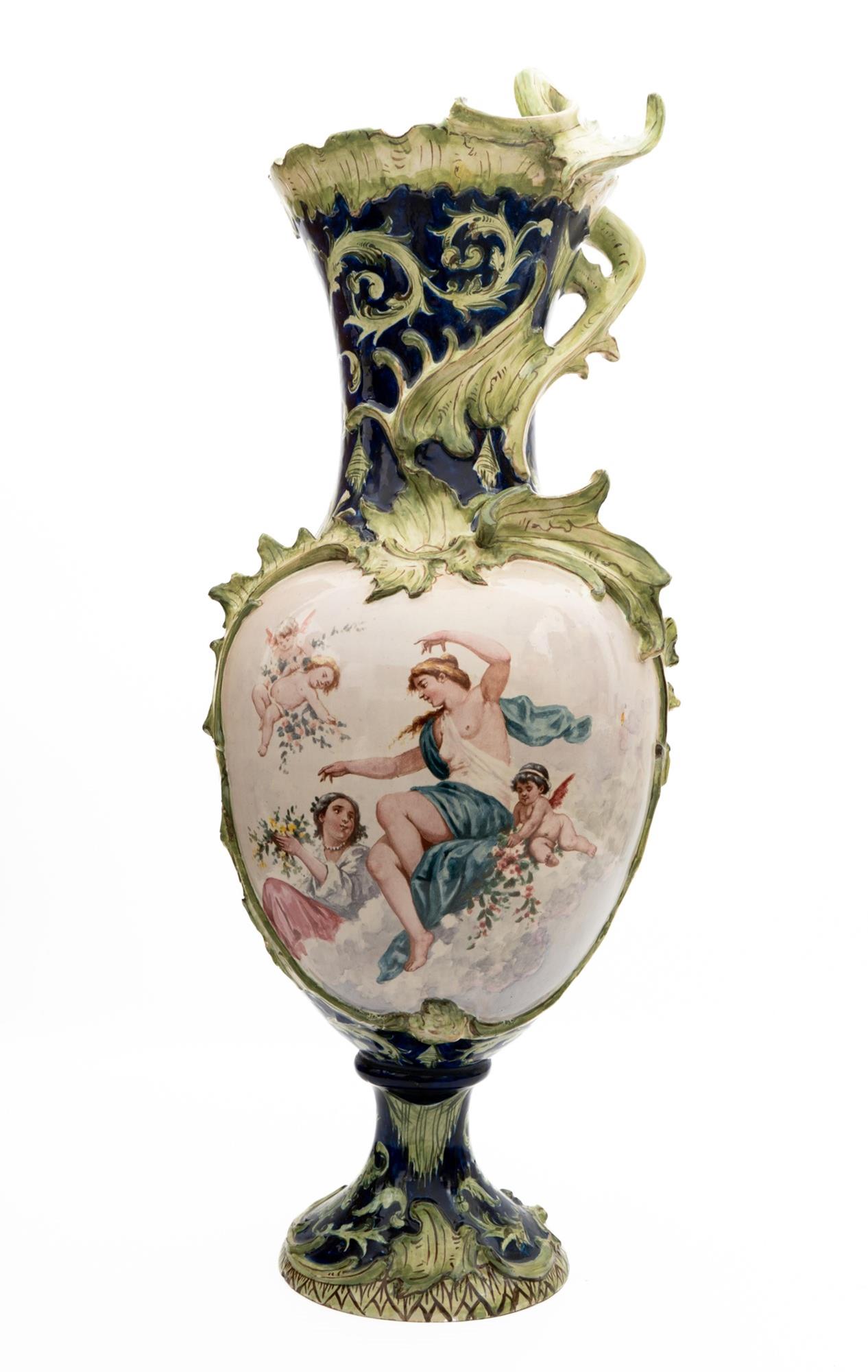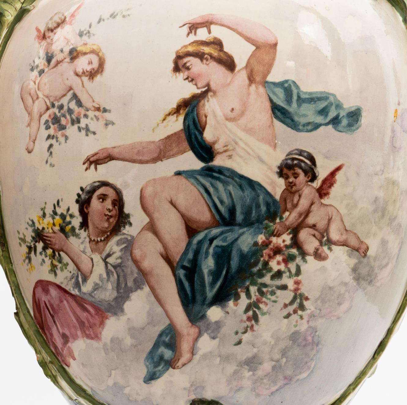 Coppia di vasi con decoro a rilievo di gusto Neorococò centrati da grandi riserve raffiguranti figure allegoriche Manifattura Mollica, Napoli fine del XIX secolo