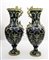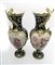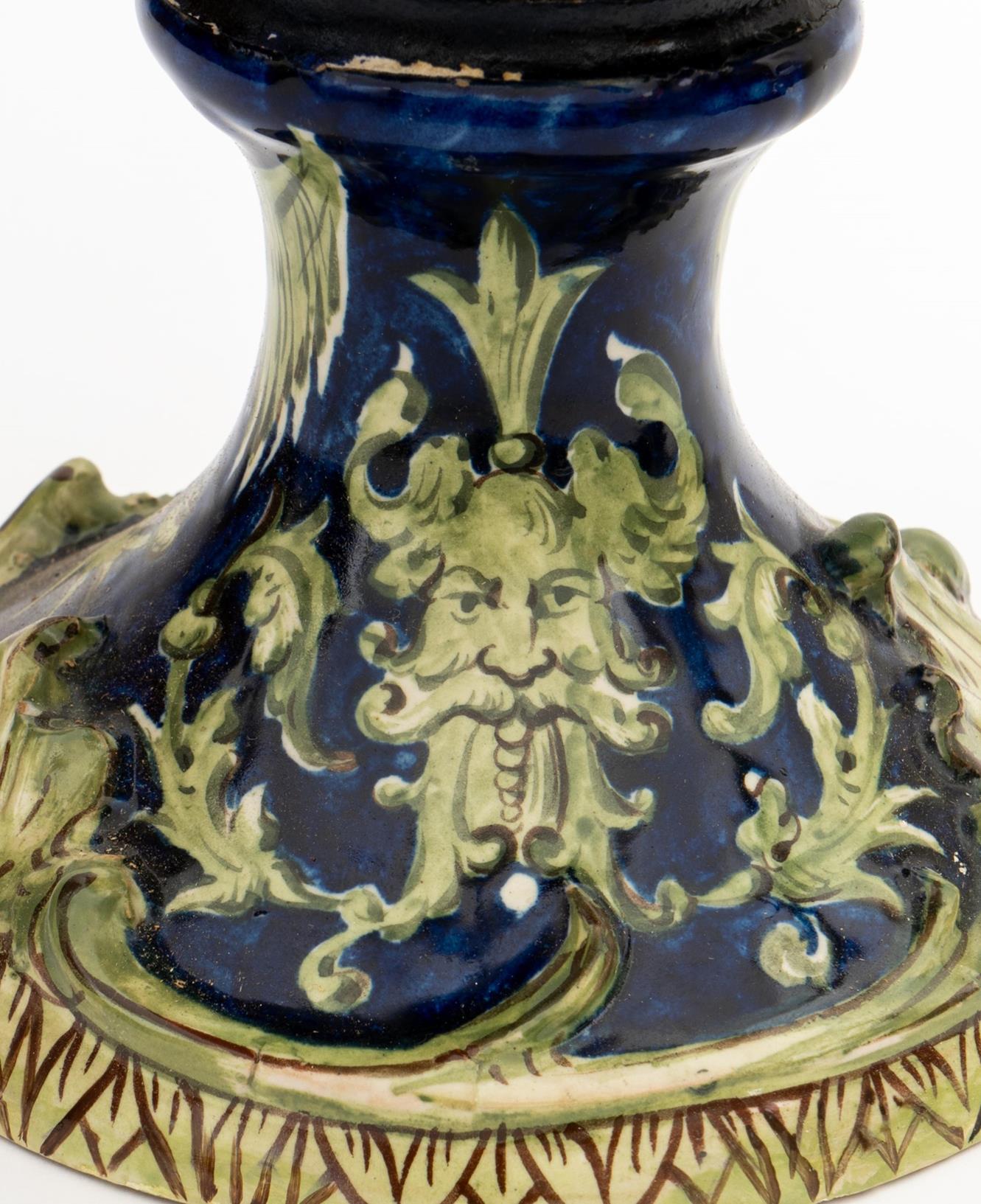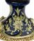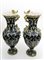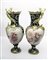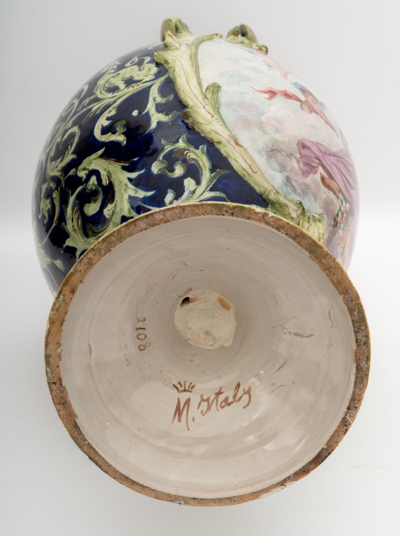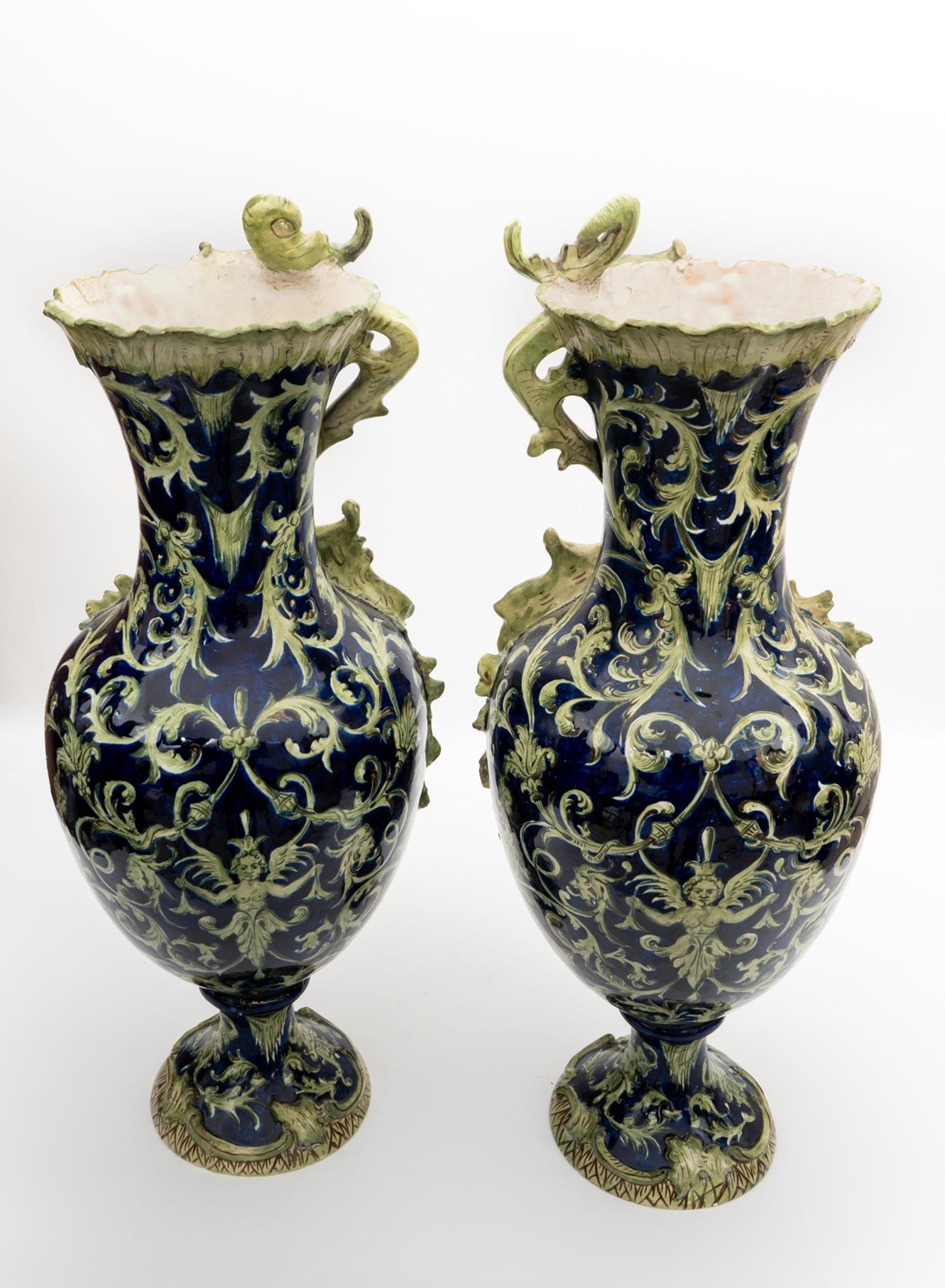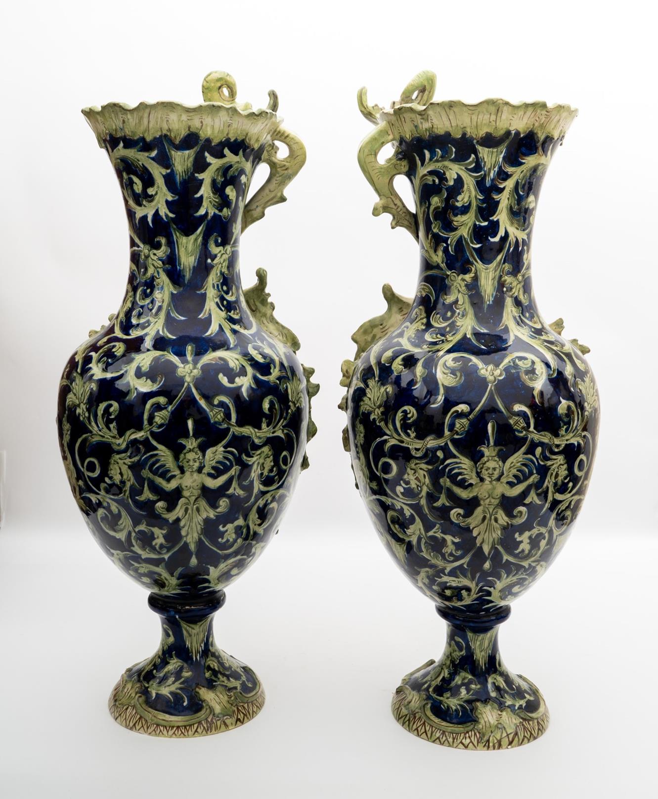 Coppia di vasi con decoro a rilievo di gusto Neorococò centrati da grandi riserve raffiguranti figure allegoriche e al retro con decoro a grottesche verde su fondo blu cammeo.