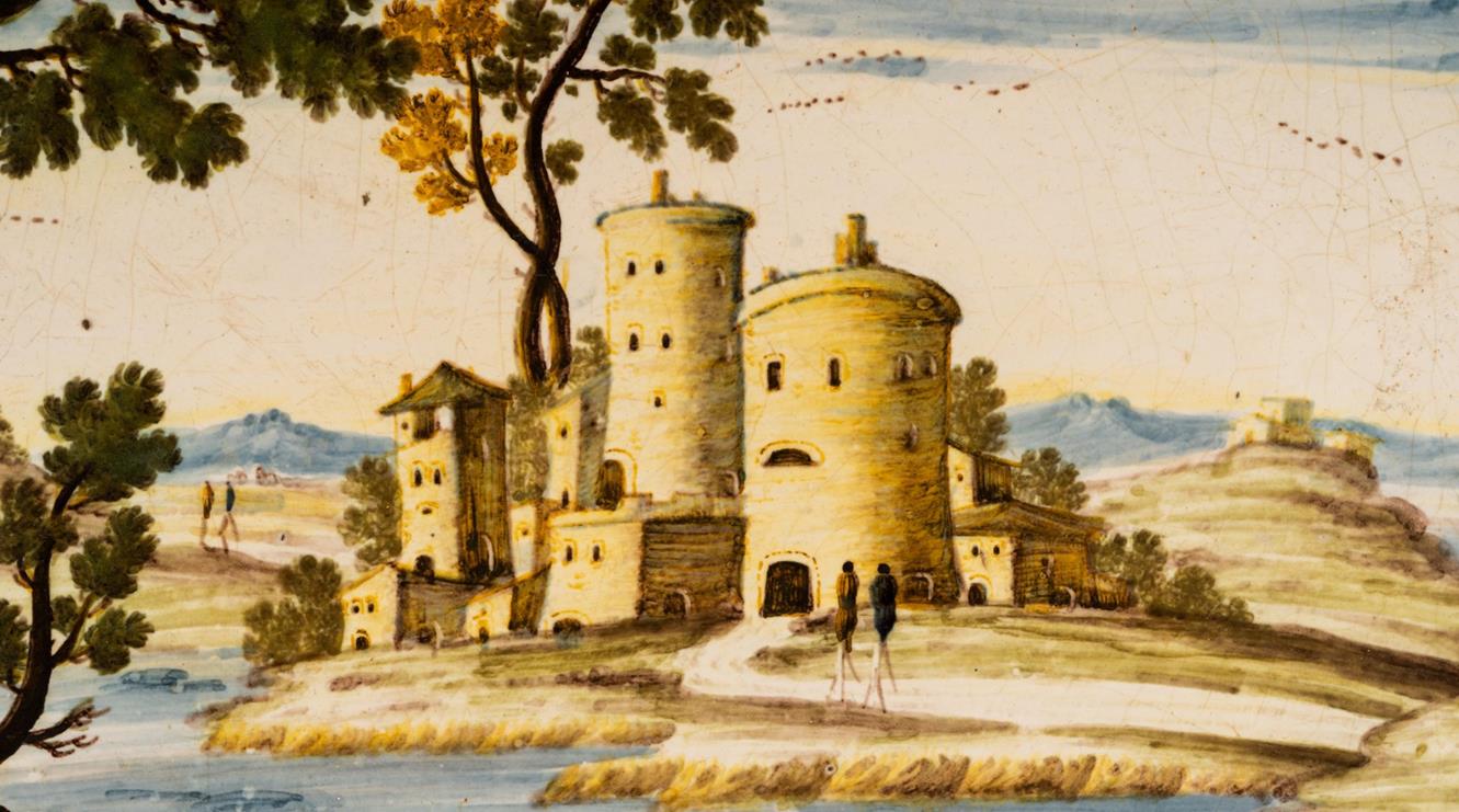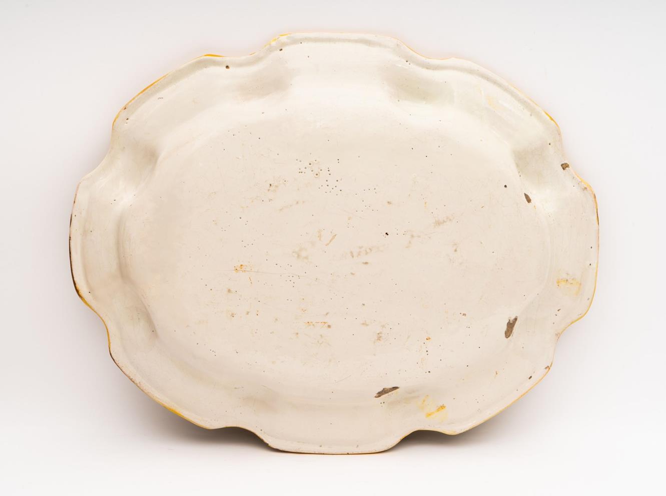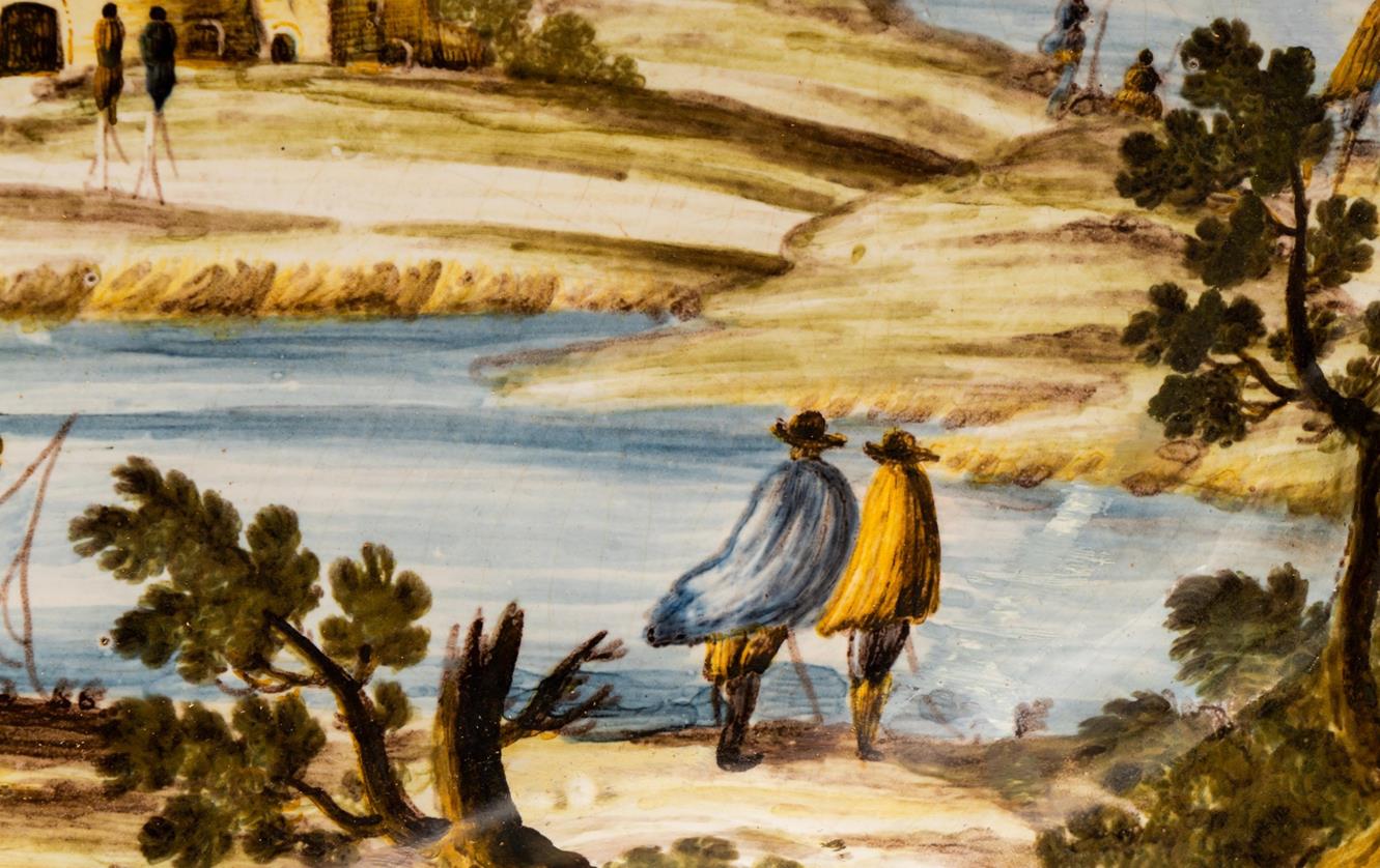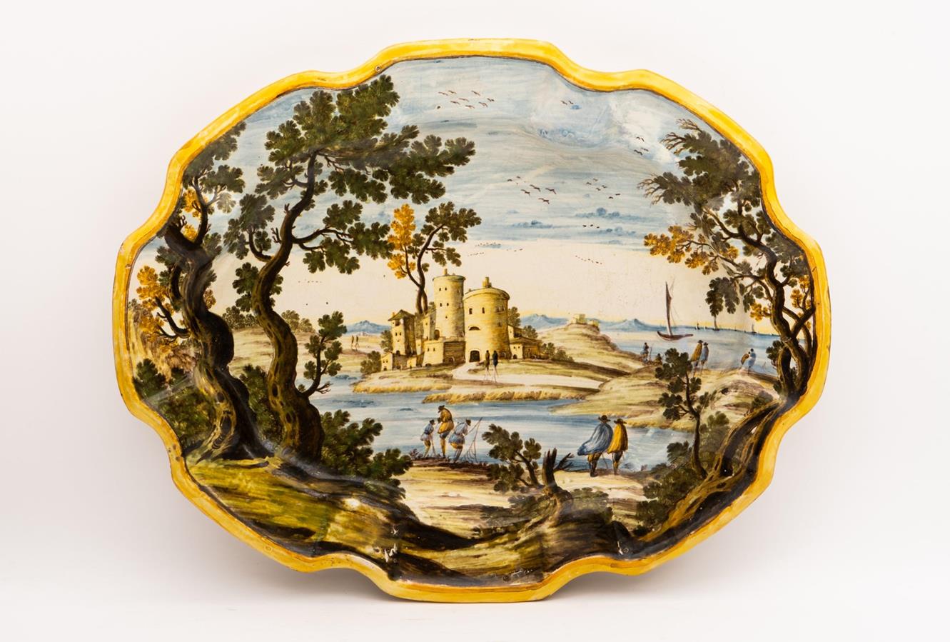 Vassoio ovale a bordo mistilineo con decoro ad ornato a paese e animato da figure di viandanti Nicola Grue il Giovane
