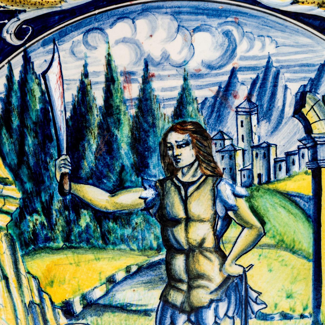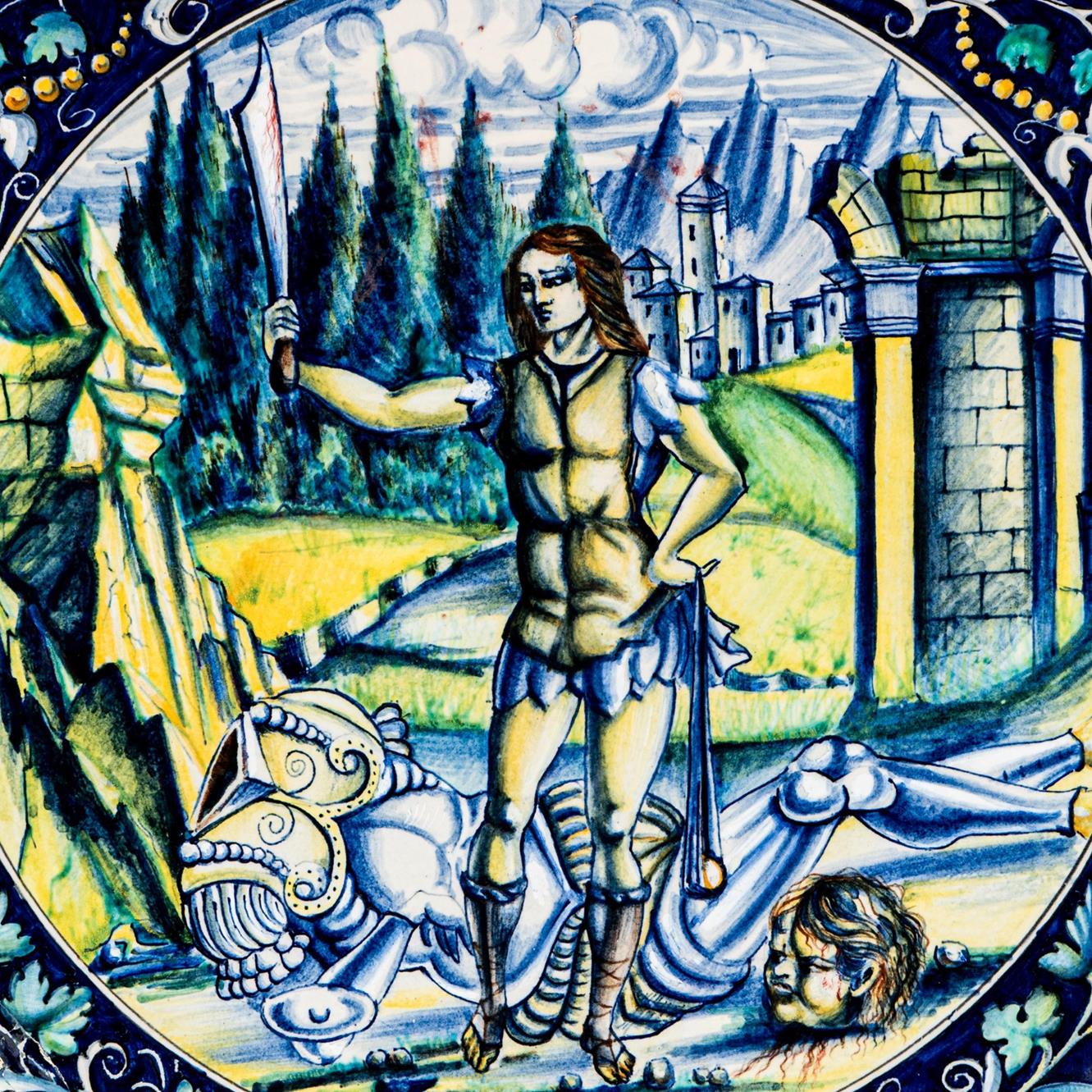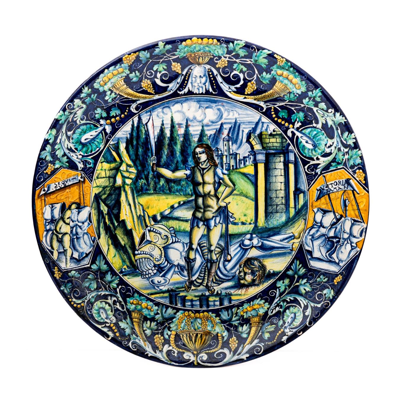 Grande piatto da parata realizzato da Vitali Orfeo, con cornucopie, mascherone e girali fogliati di gusto neorinascimentale sulla tesa. Istoriato con scena di Davide che taglia la testa a Golia nel cavo.
