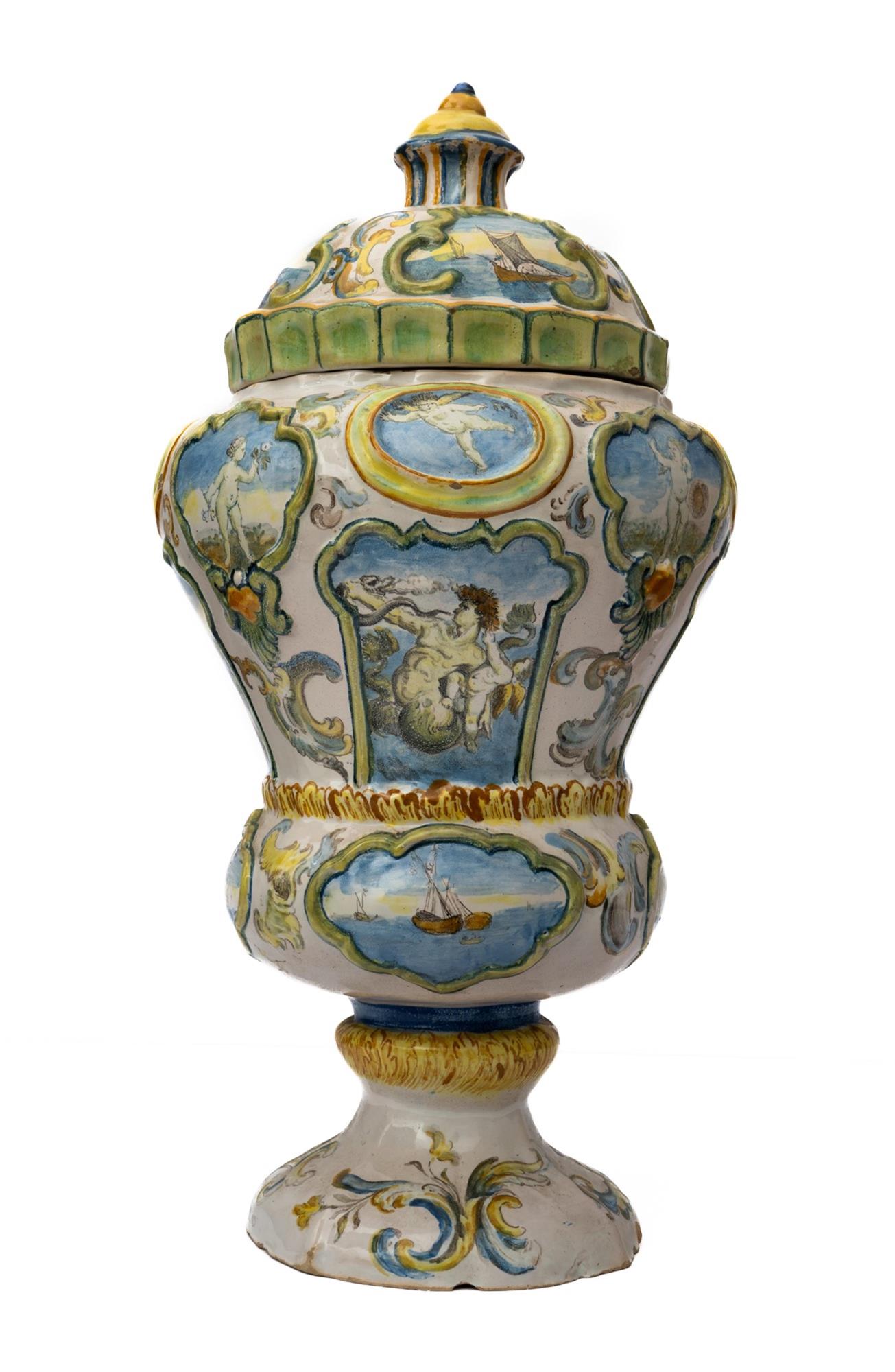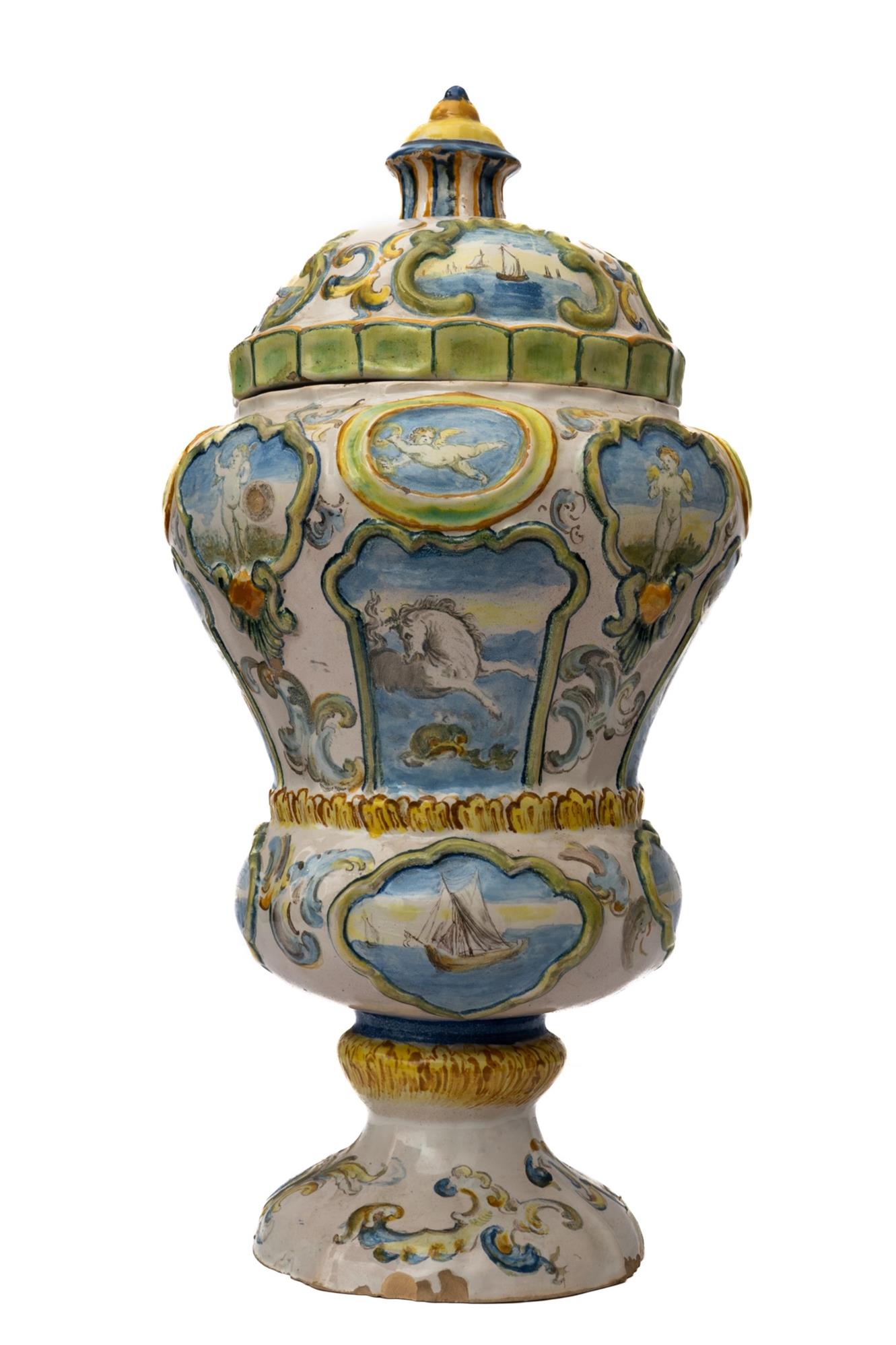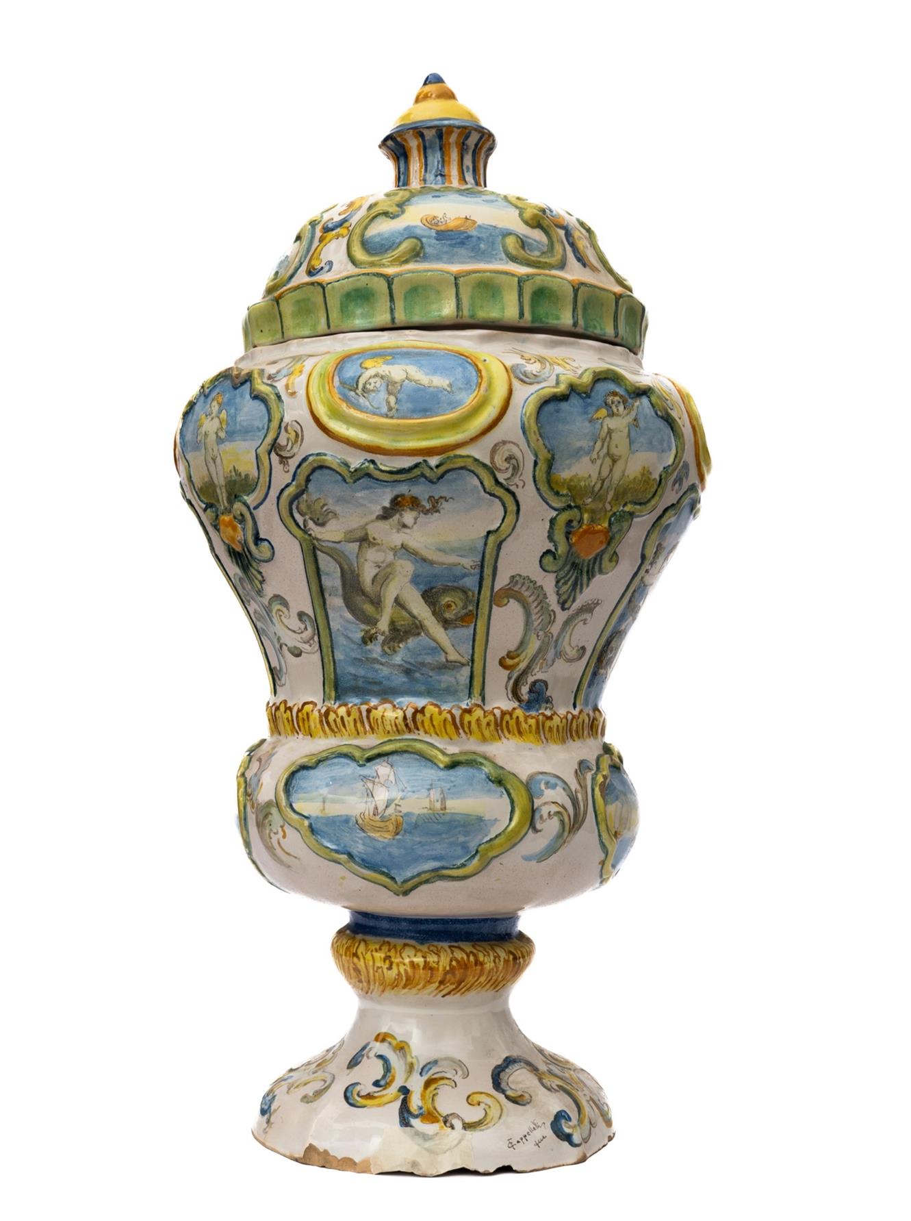 maiolica dipinta altezza cm 60 1919 Pregevole opera di Fedele Cappelletti, principale esponente della tradizione ceramista abruzzese, il grande vaso poggia su piede decorato a cartigli e presenta, entro varie campiture, personaggi mitologici marini, Nereide e Tritone, velieri e putti.