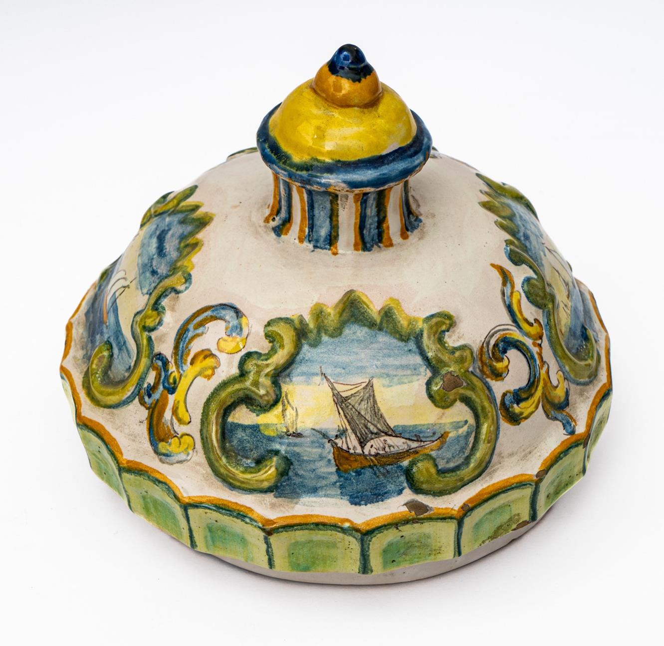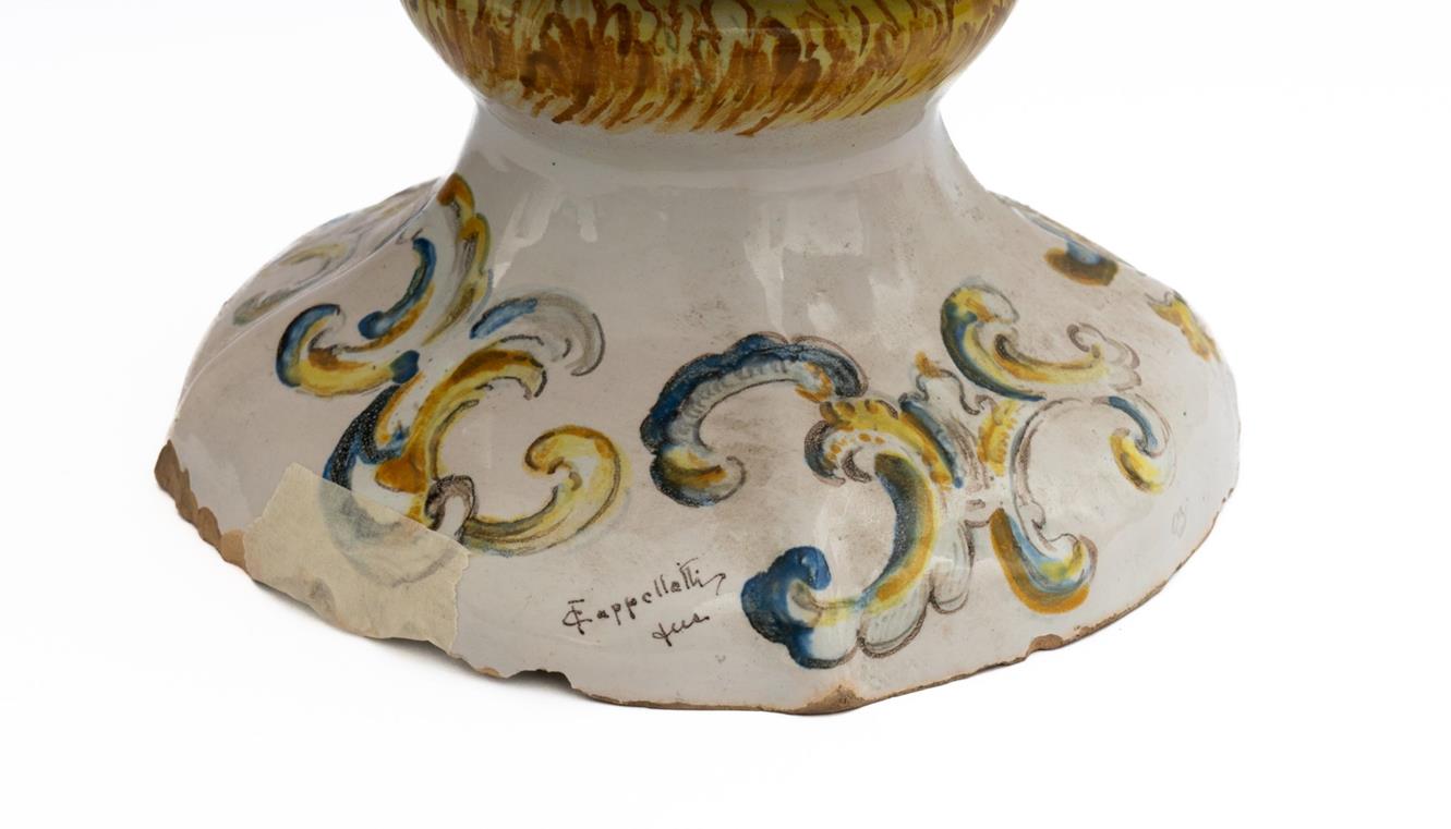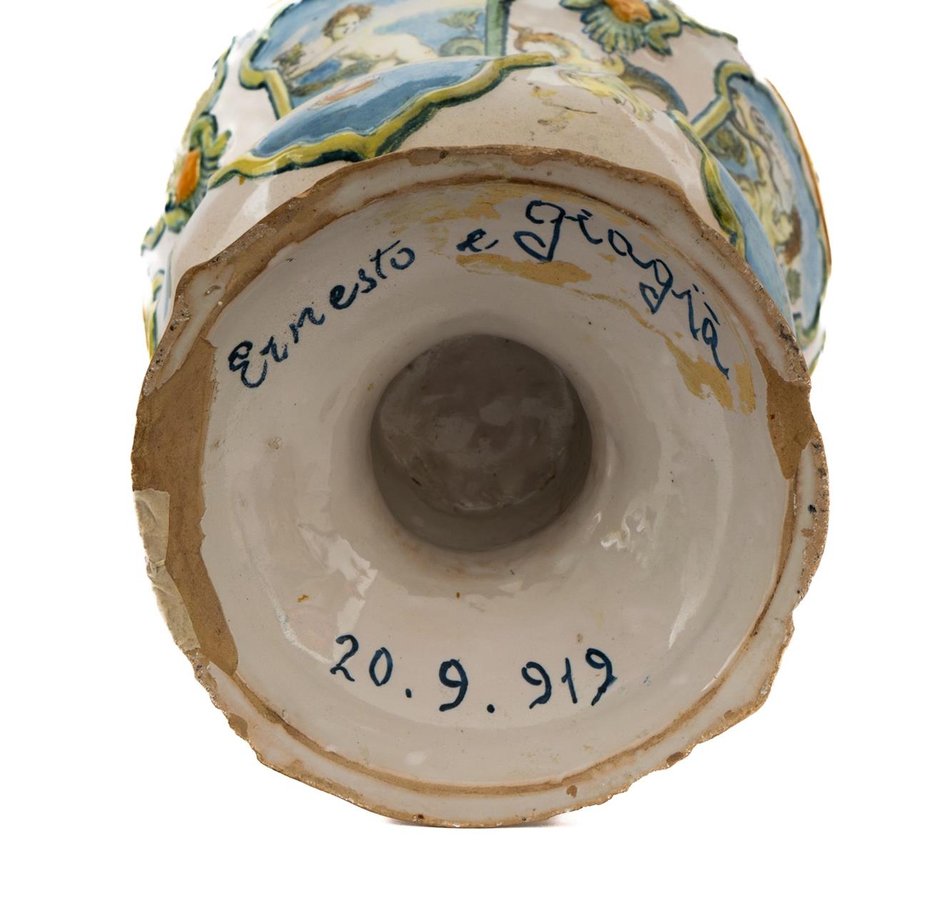 maiolica dipinta altezza cm 60 1919 Pregevole opera di Fedele Cappelletti, principale esponente della tradizione ceramista abruzzese, il grande vaso poggia su piede decorato a cartigli e presenta, entro varie campiture, personaggi mitologici marini, Nereide e Tritone, velieri e putti.