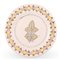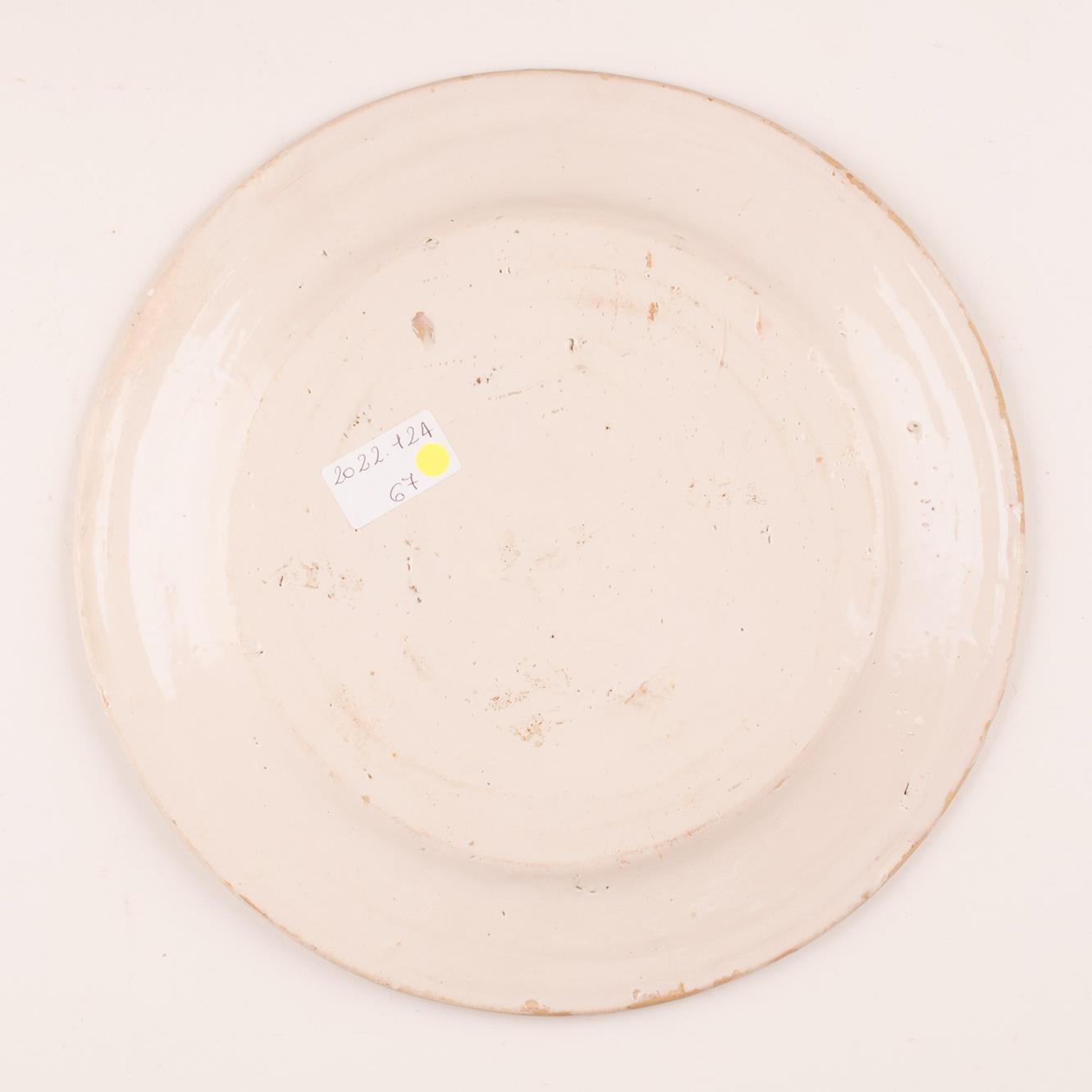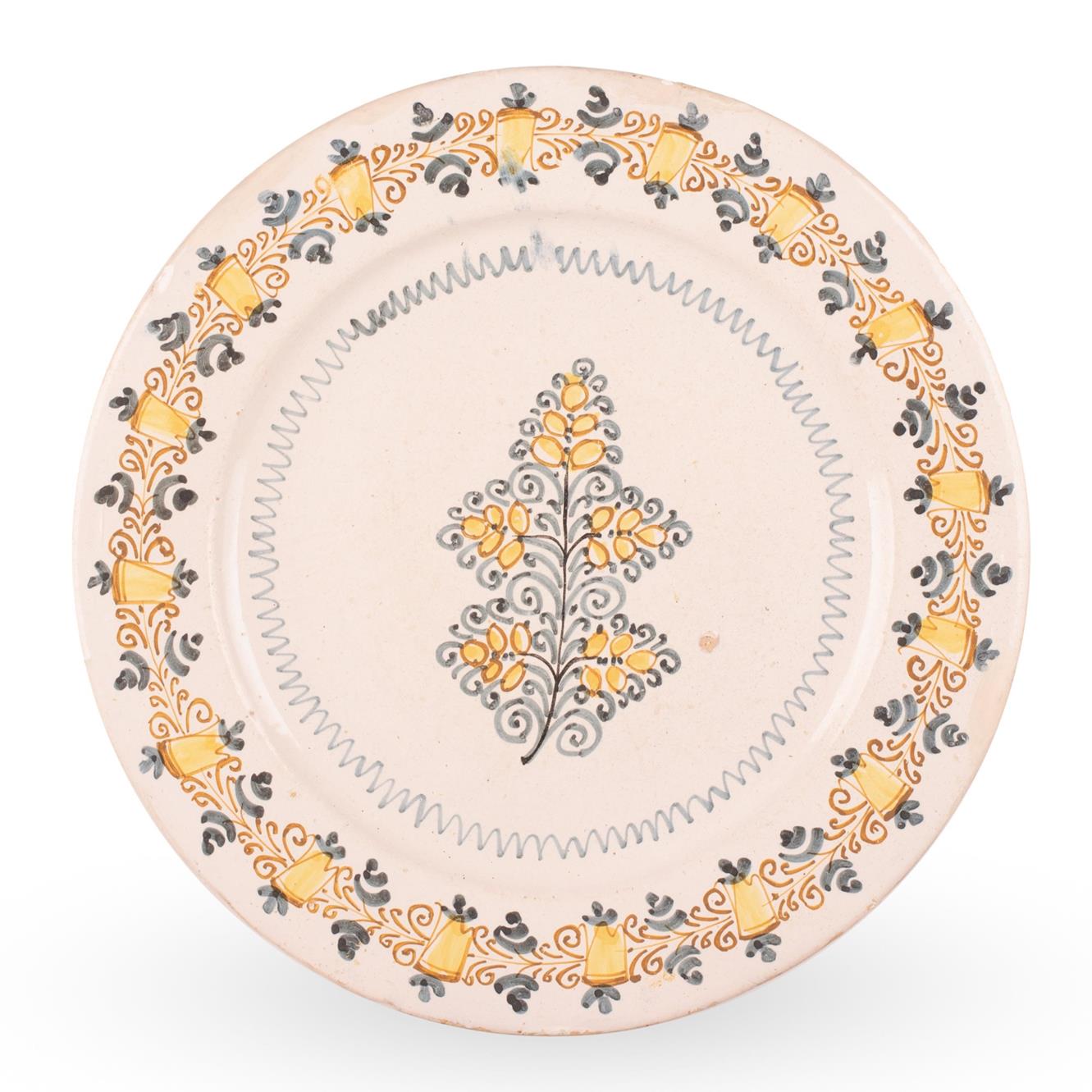 Piatto in maiolica decorato nello stile compendiario nei toni del giallo e del blu. Nel cavetto è rappresentato un grande racemo vegetale.