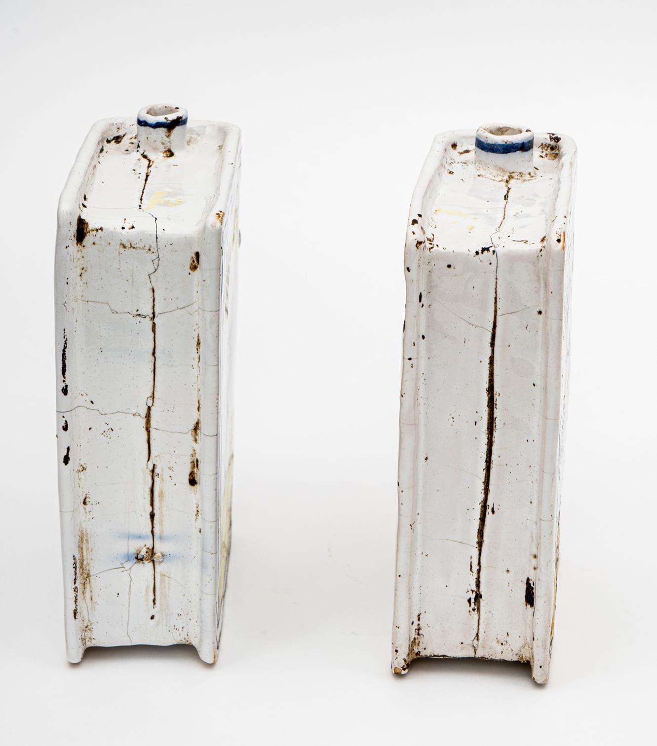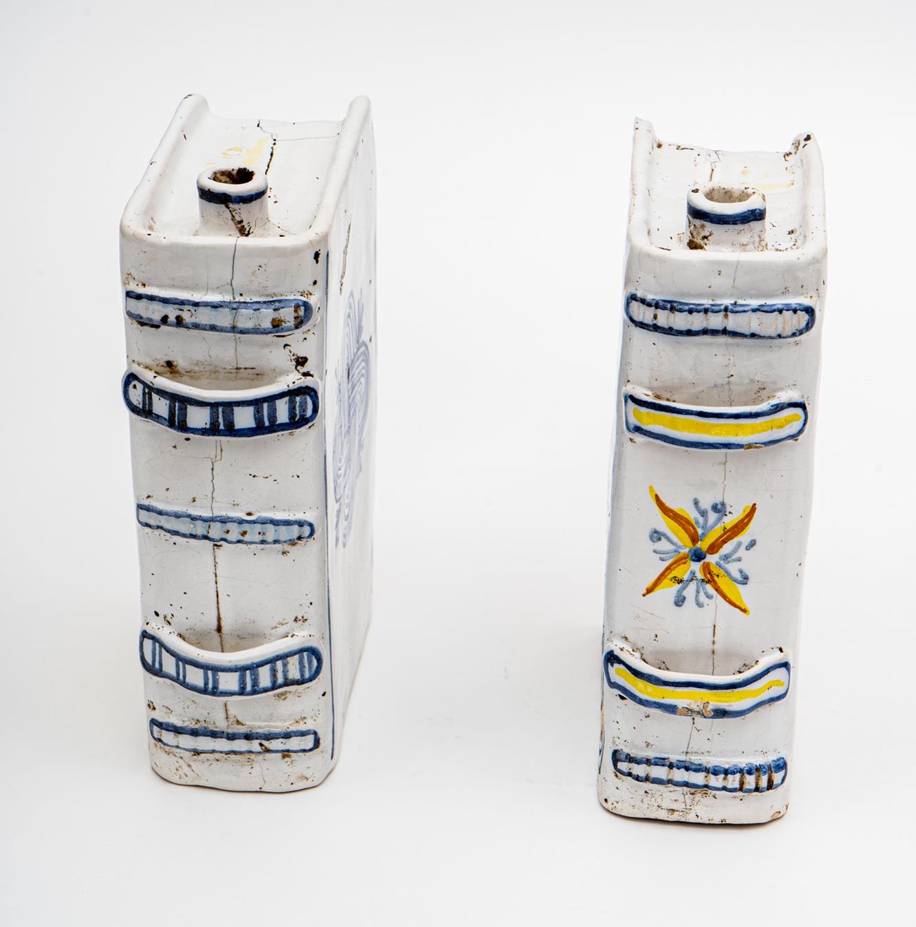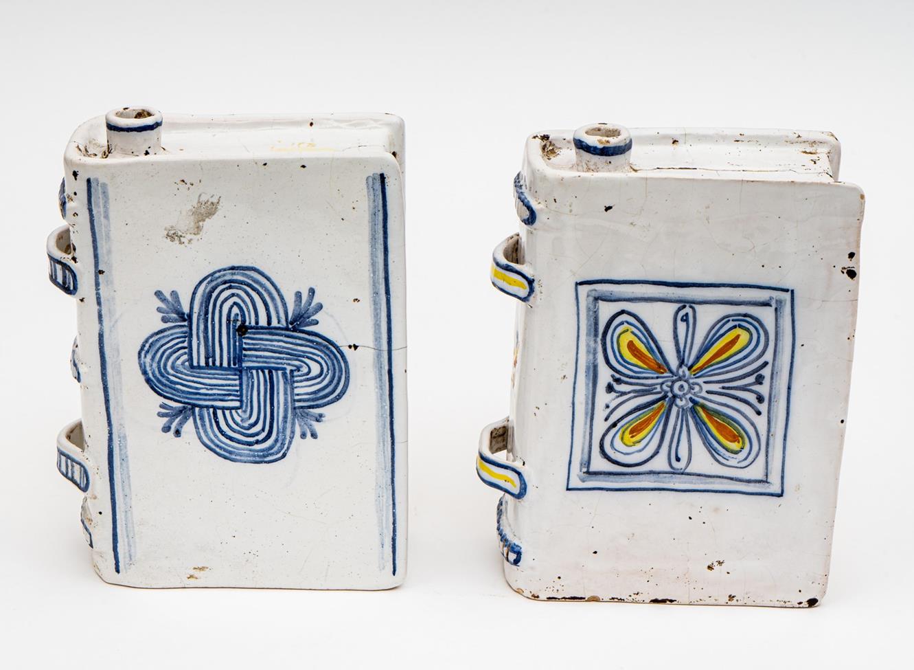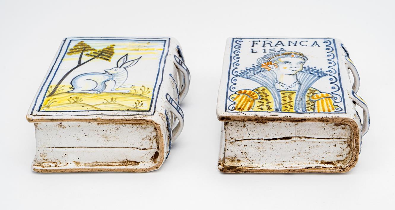 Coppia di porta liquori - scaldamani a foggia di libro decorati al fronte con figura muliebre e scritta "Franca Lisa" e figura di coniglio Manifattura di Castelli della fine del XIX secolo