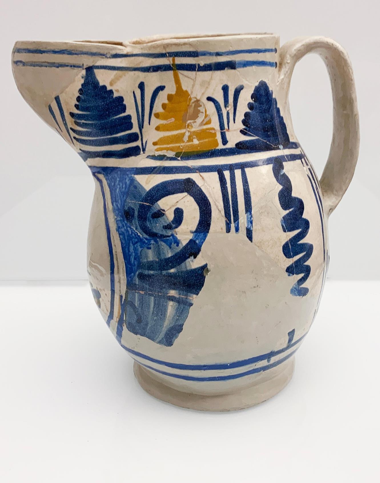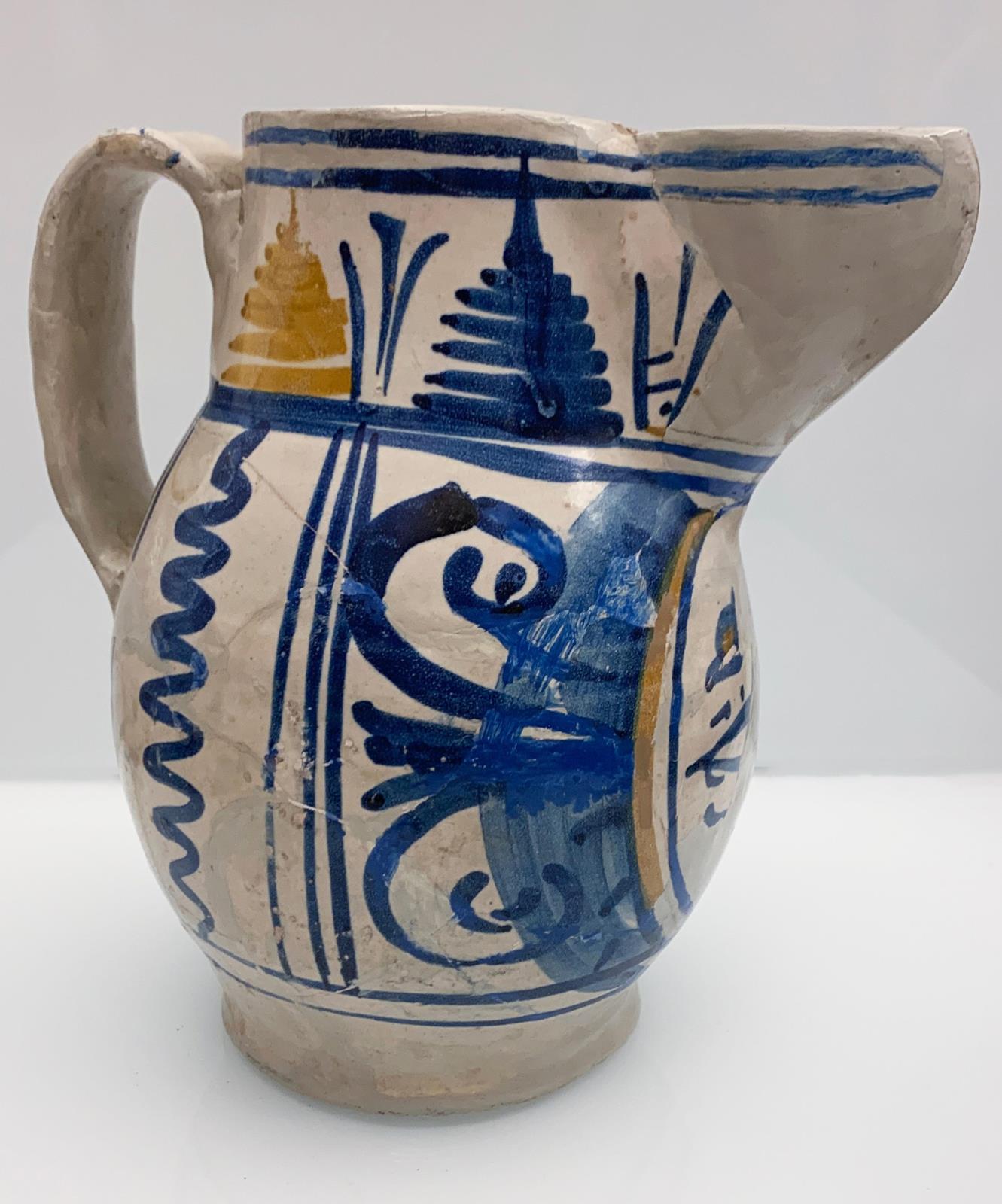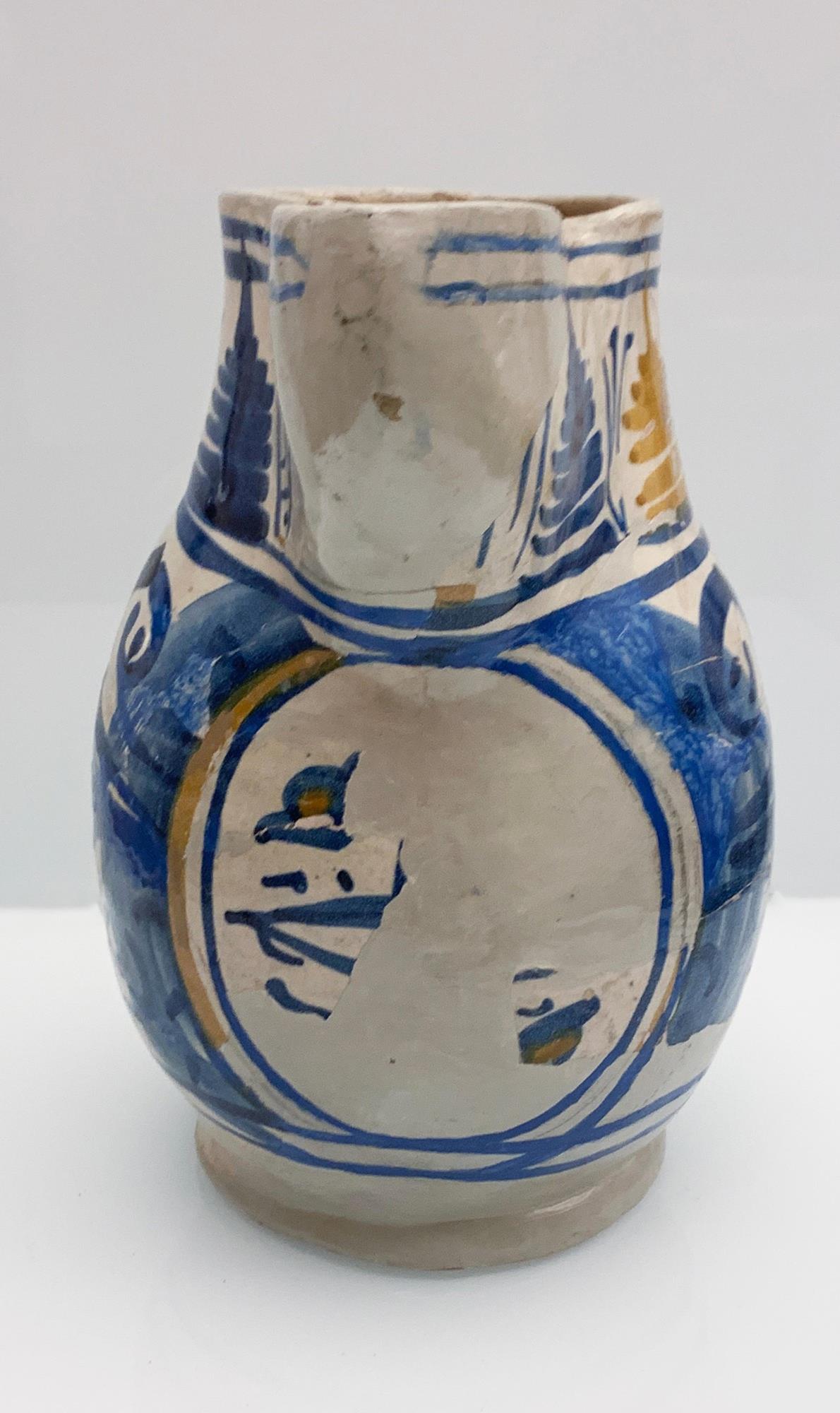 Boccale trilobato con corpo panciuto ovoidale. Ansa a nastro che dal collo arriva fino a metà del boccale.Manifattura di Viterbo del XVII secolo