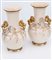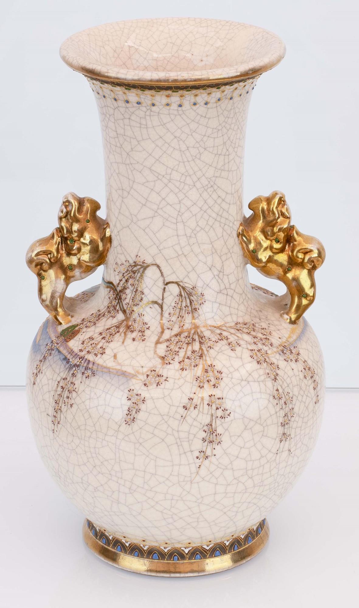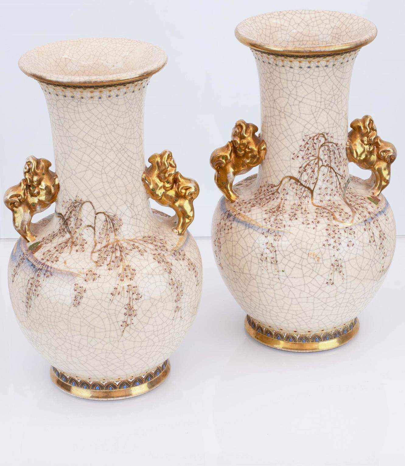 Coppia di vasi Satsuma riccamente decorati. Anse plastiche con cani di pho dorati.