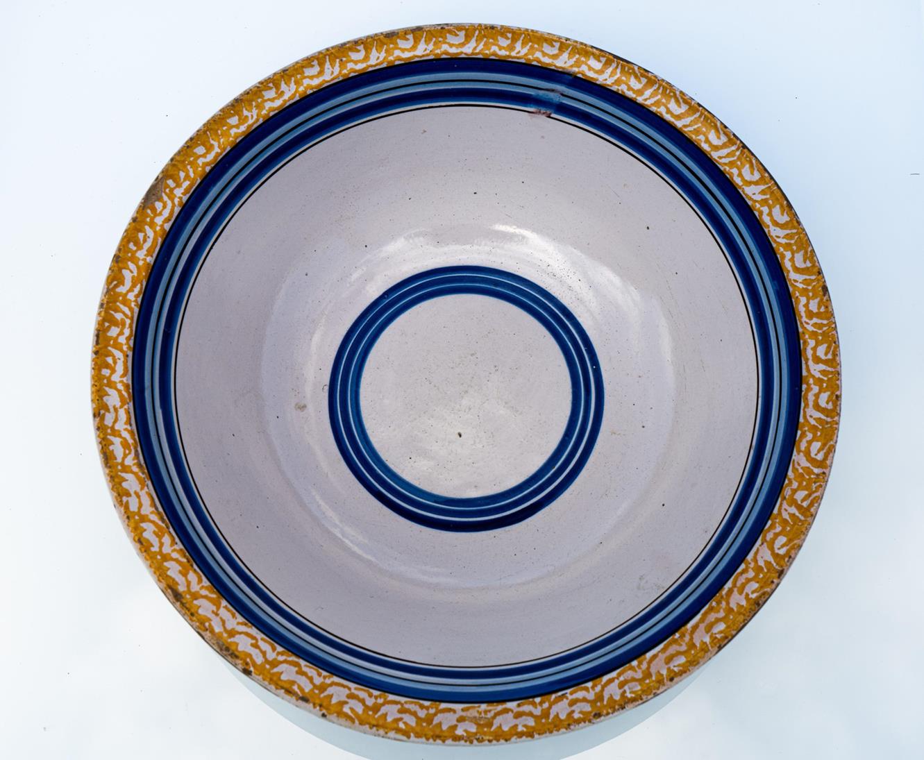Grande bacile Fabrica d'Emilio con decoro a filettatura concentriche in azzurro e sul bordo della tesa a stampino giallo e arancio