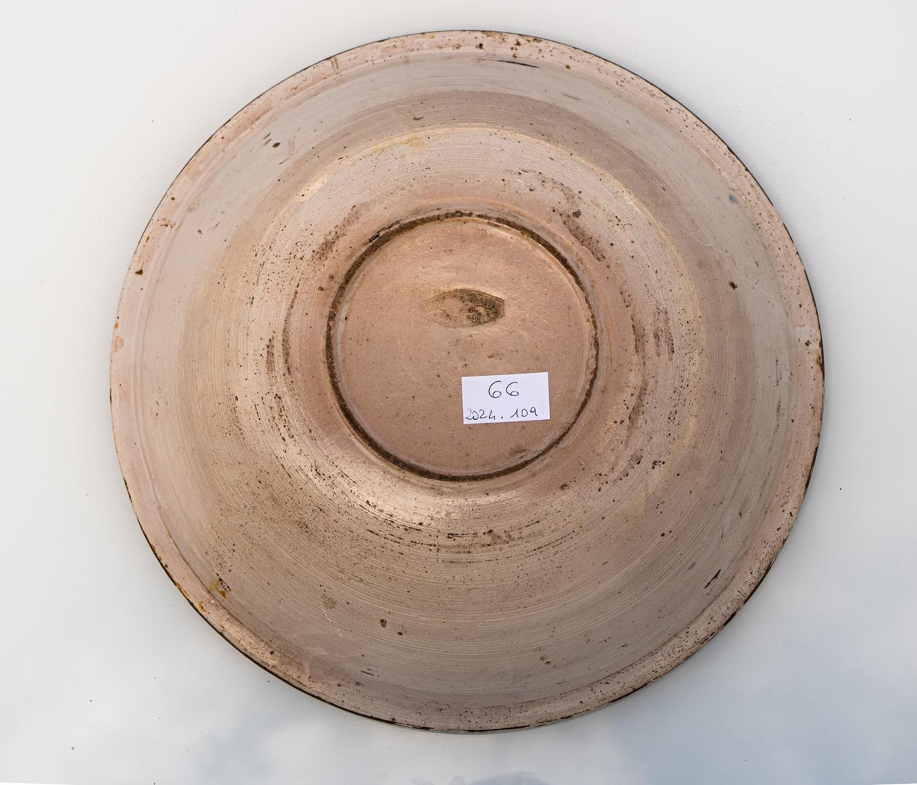 Grande bacile Fabrica d'Emilio con decoro a filettatura concentriche in azzurro e sul bordo della tesa a stampino giallo e arancio Manifattura di Palena del XX secolo