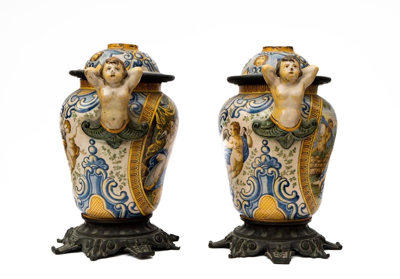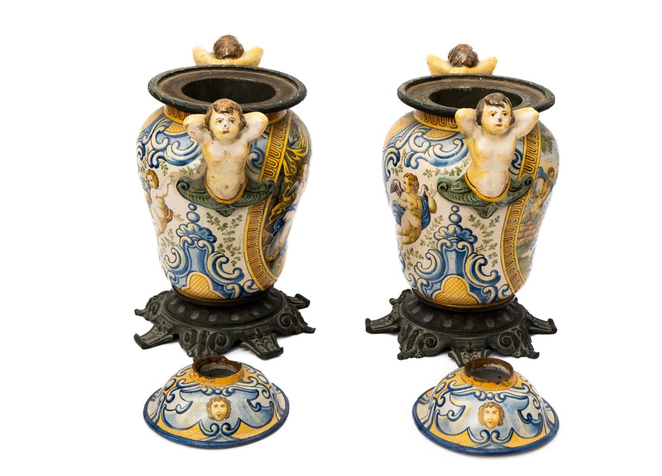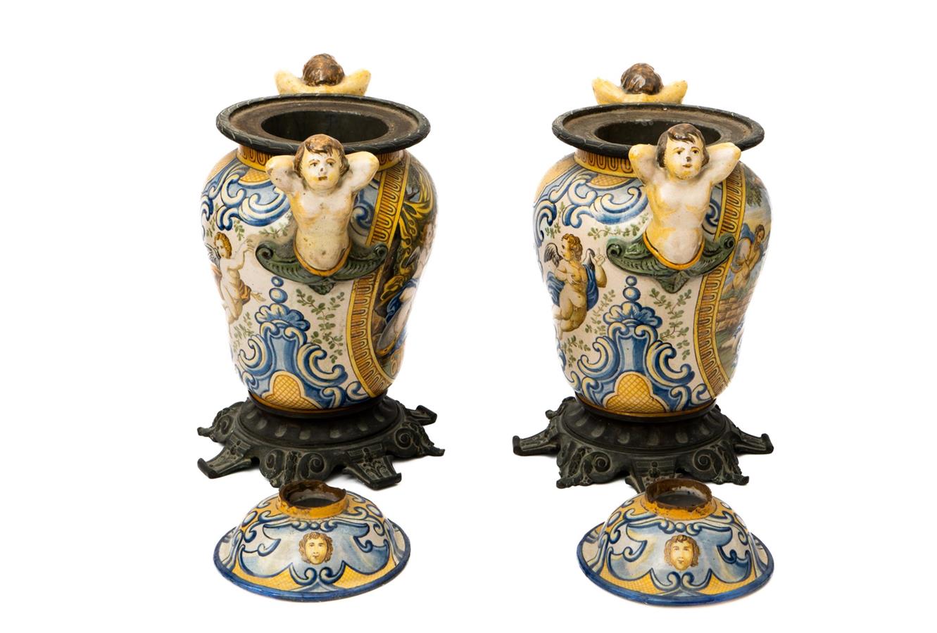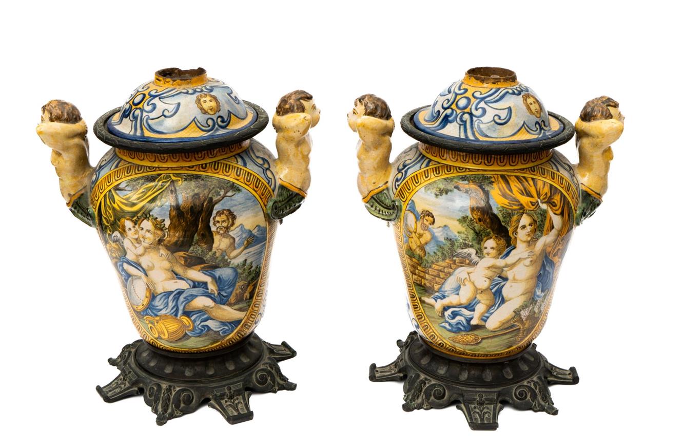 maiolica dipinta, bronzo altezza 33 cm, larghezza 27 cm. fine XIX secolo I due vasi raffigurano sul recto, entro cornicette geometriche, scene mitologiche amorose con donna, putto e figura maschile in secondo piano inseriti in un ambiente boschivo, sul retro e sui coperchi puttini librati in volo. I due oggetti hanno le basi e gli orli in bronzo perché adattati a lumi. Pregevole produzione di Gaetano Battaglia del suo ultimo periodo.