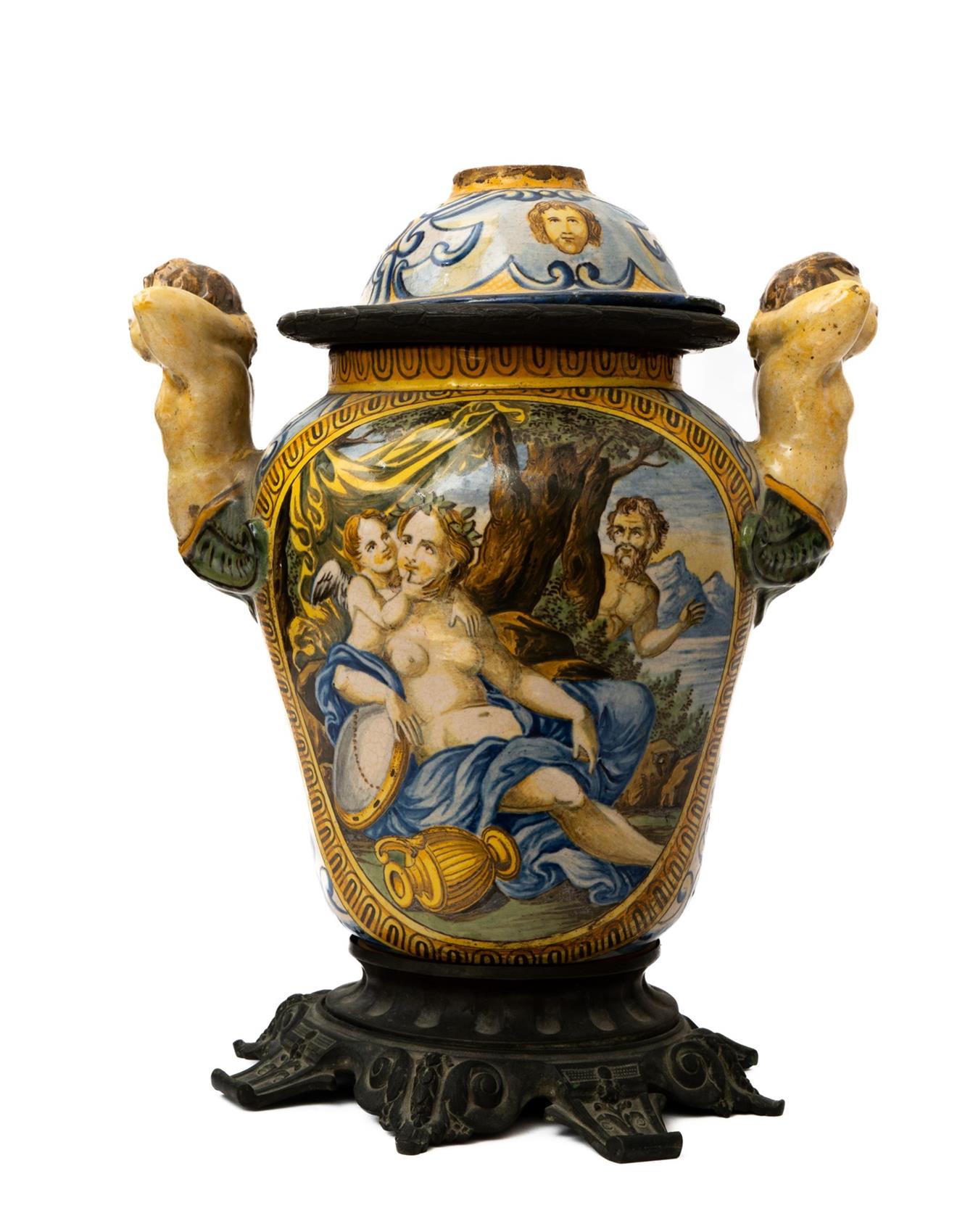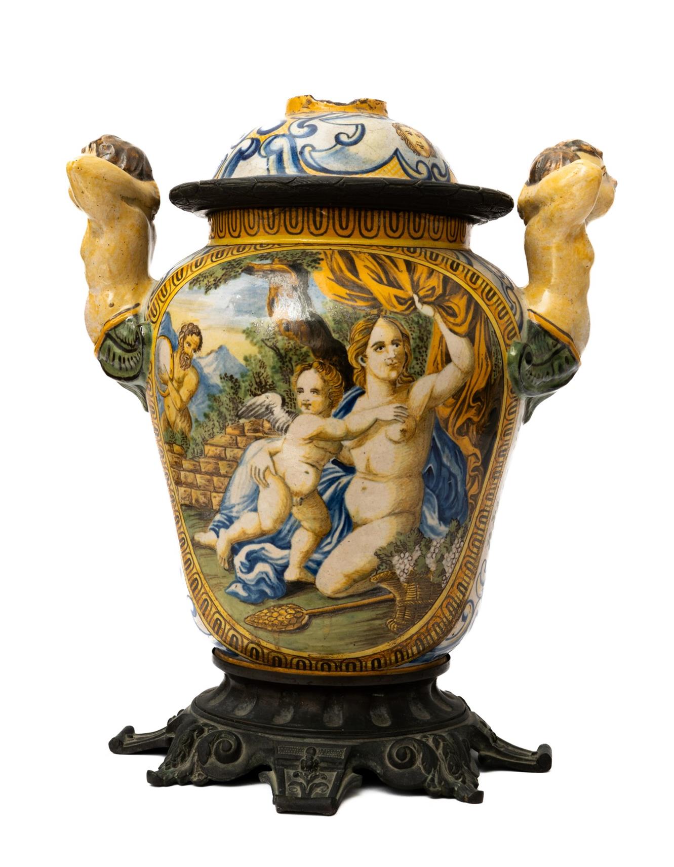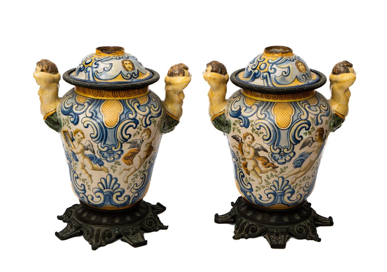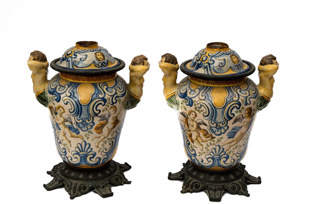 maiolica dipinta, bronzo altezza 33 cm, larghezza 27 cm. fine XIX secolo I due vasi raffigurano sul recto, entro cornicette geometriche, scene mitologiche amorose con donna, putto e figura maschile in secondo piano inseriti in un ambiente boschivo, sul retro e sui coperchi puttini librati in volo. I due oggetti hanno le basi e gli orli in bronzo perché adattati a lumi. Pregevole produzione di Gaetano Battaglia del suo ultimo periodo.