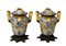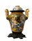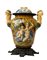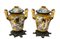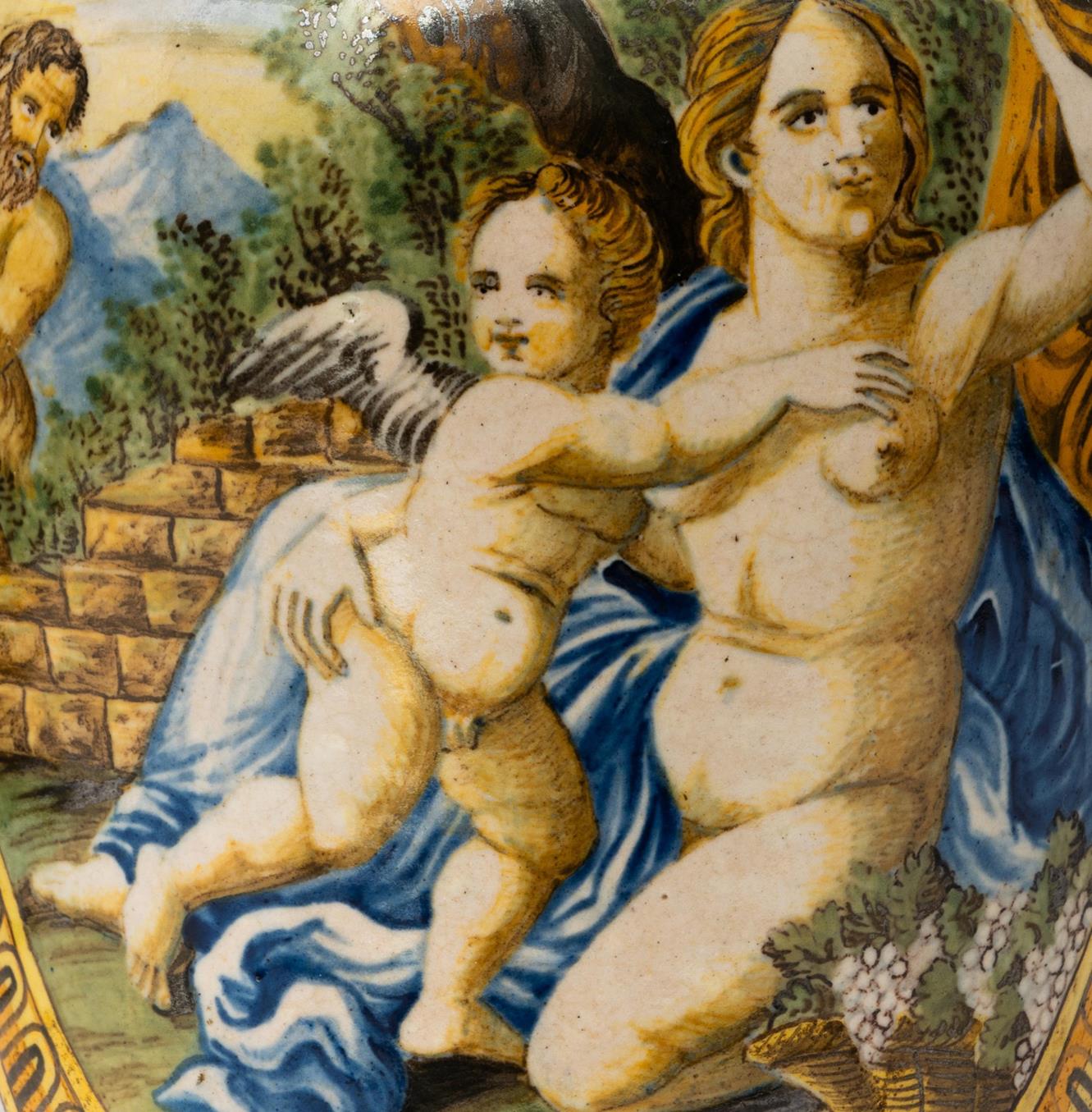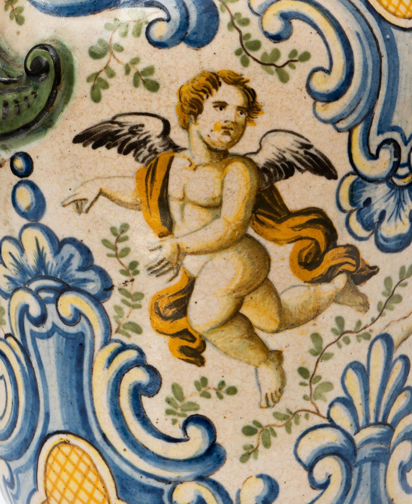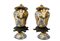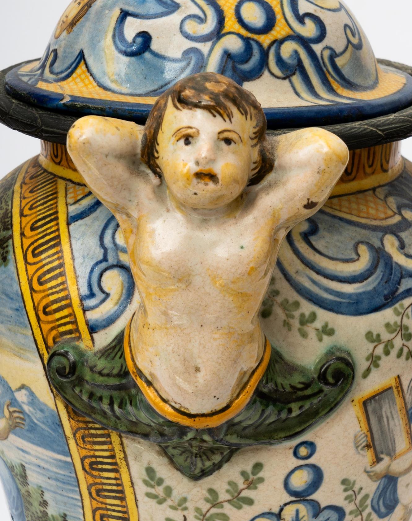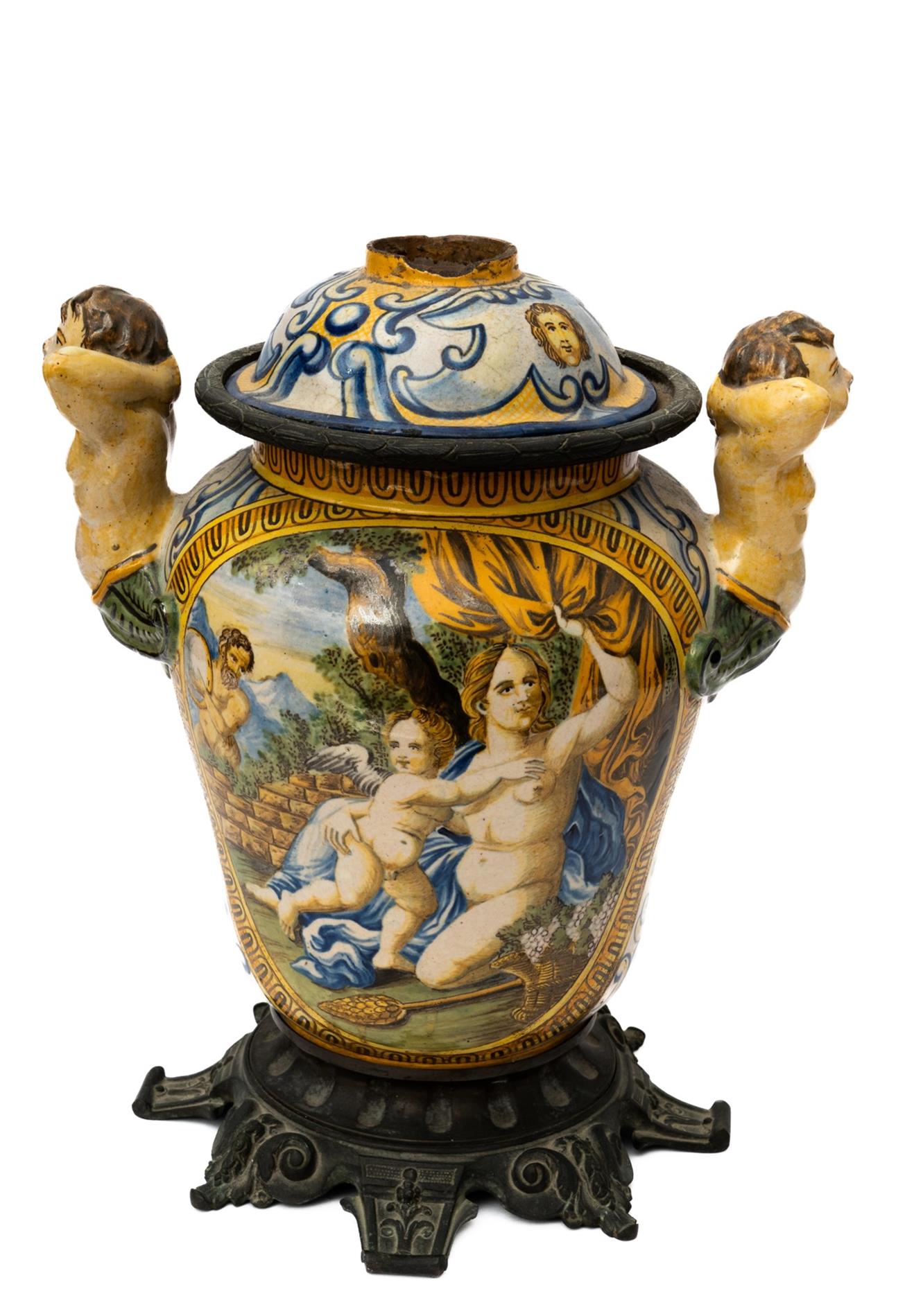 maiolica dipinta, bronzo altezza 33 cm, larghezza 27 cm. fine XIX secolo I due vasi raffigurano sul recto, entro cornicette geometriche, scene mitologiche amorose con donna, putto e figura maschile in secondo piano inseriti in un ambiente boschivo, sul retro e sui coperchi puttini librati in volo. I due oggetti hanno le basi e gli orli in bronzo perché adattati a lumi. Pregevole produzione di Gaetano Battaglia del suo ultimo periodo.