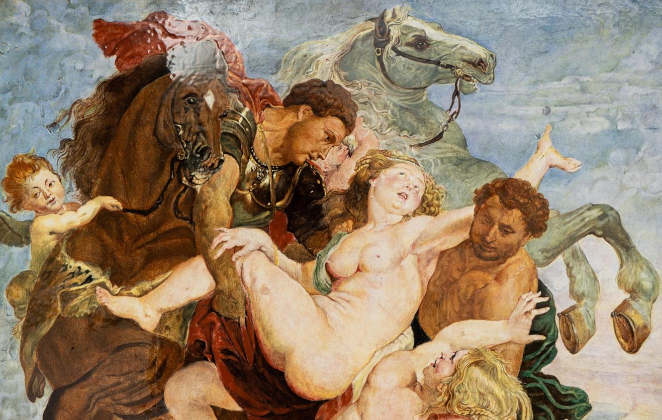 Grande mattonella in maiolica raffigurante il rapimento delle figlie di Leucippo.