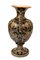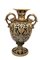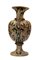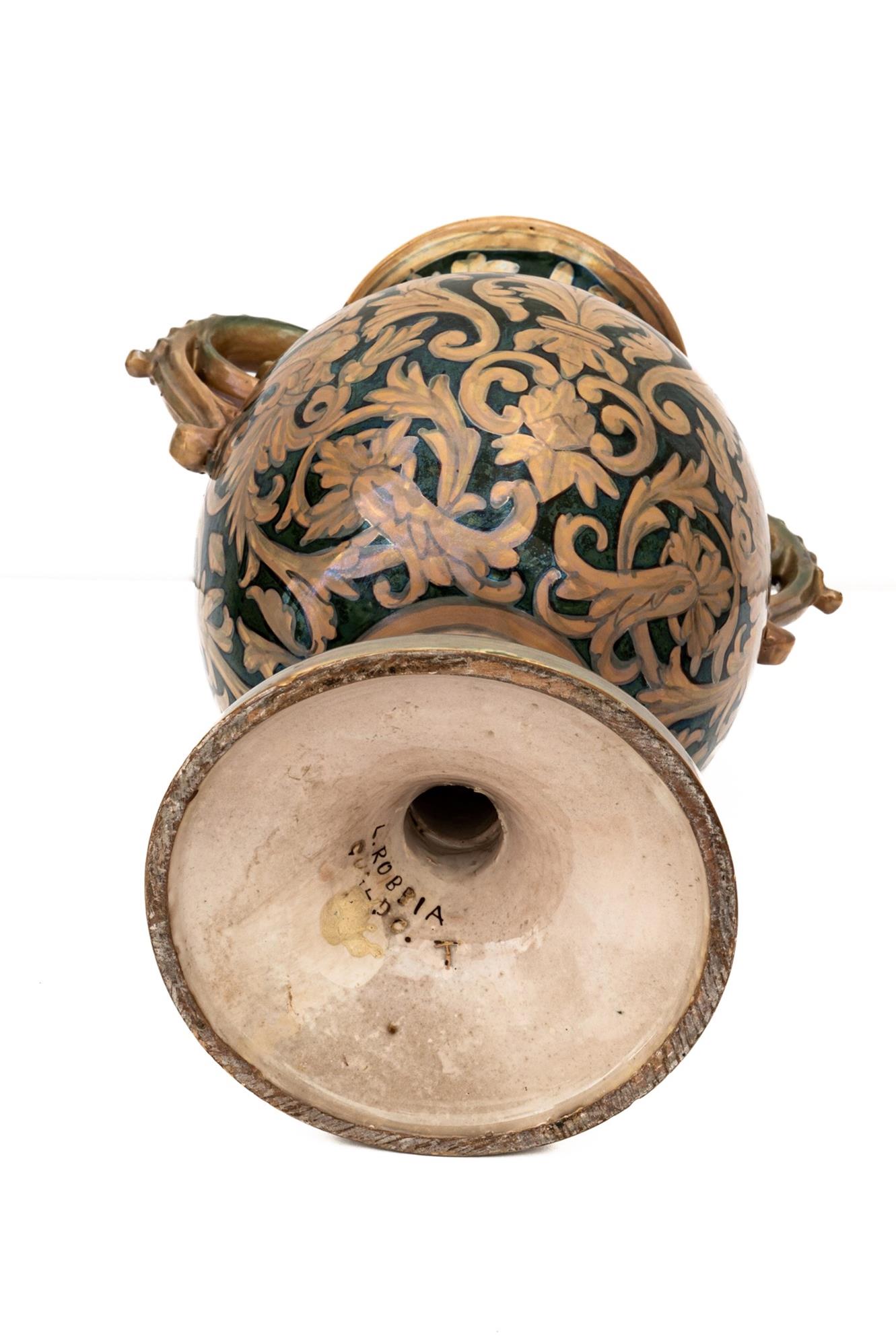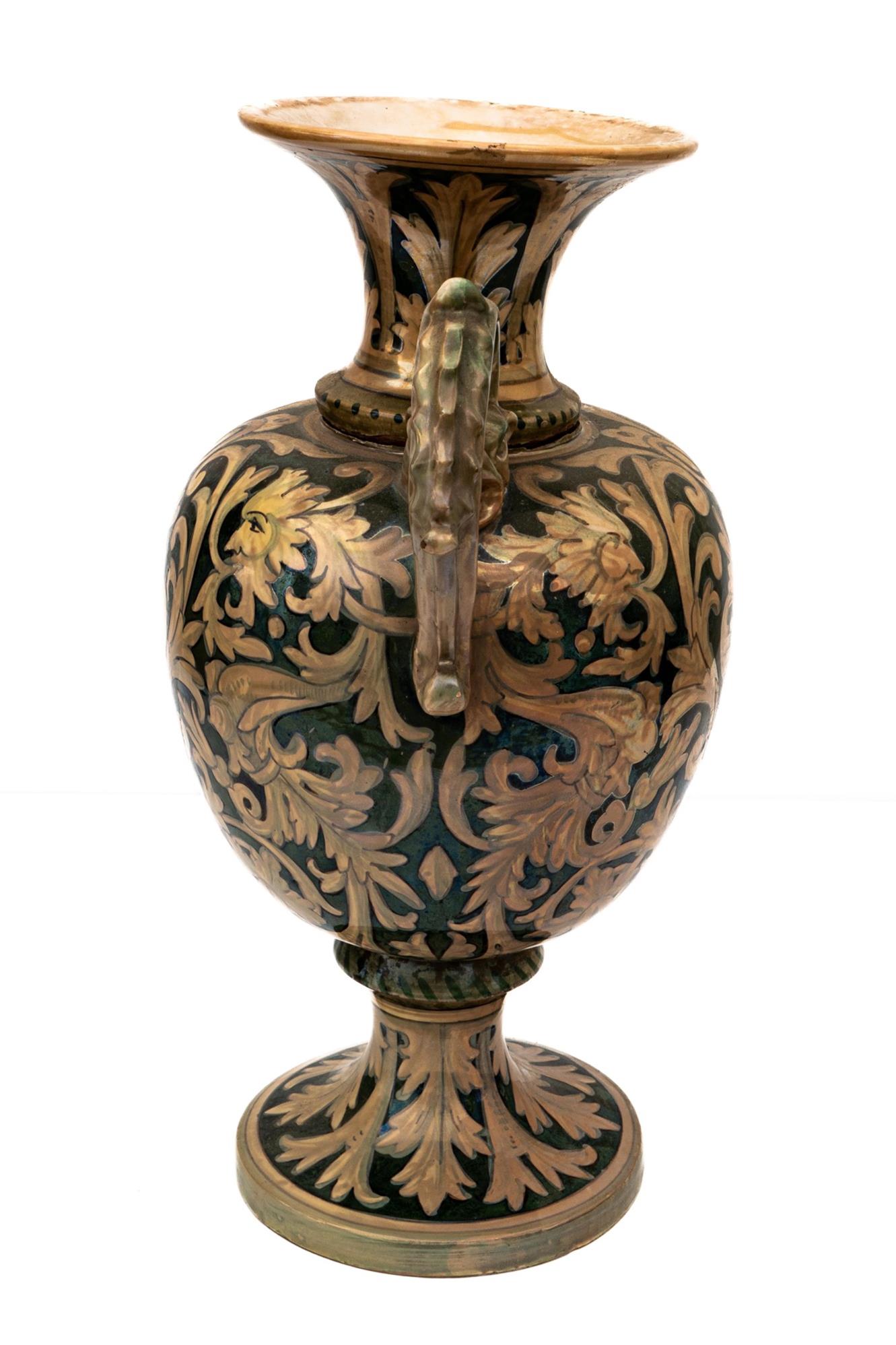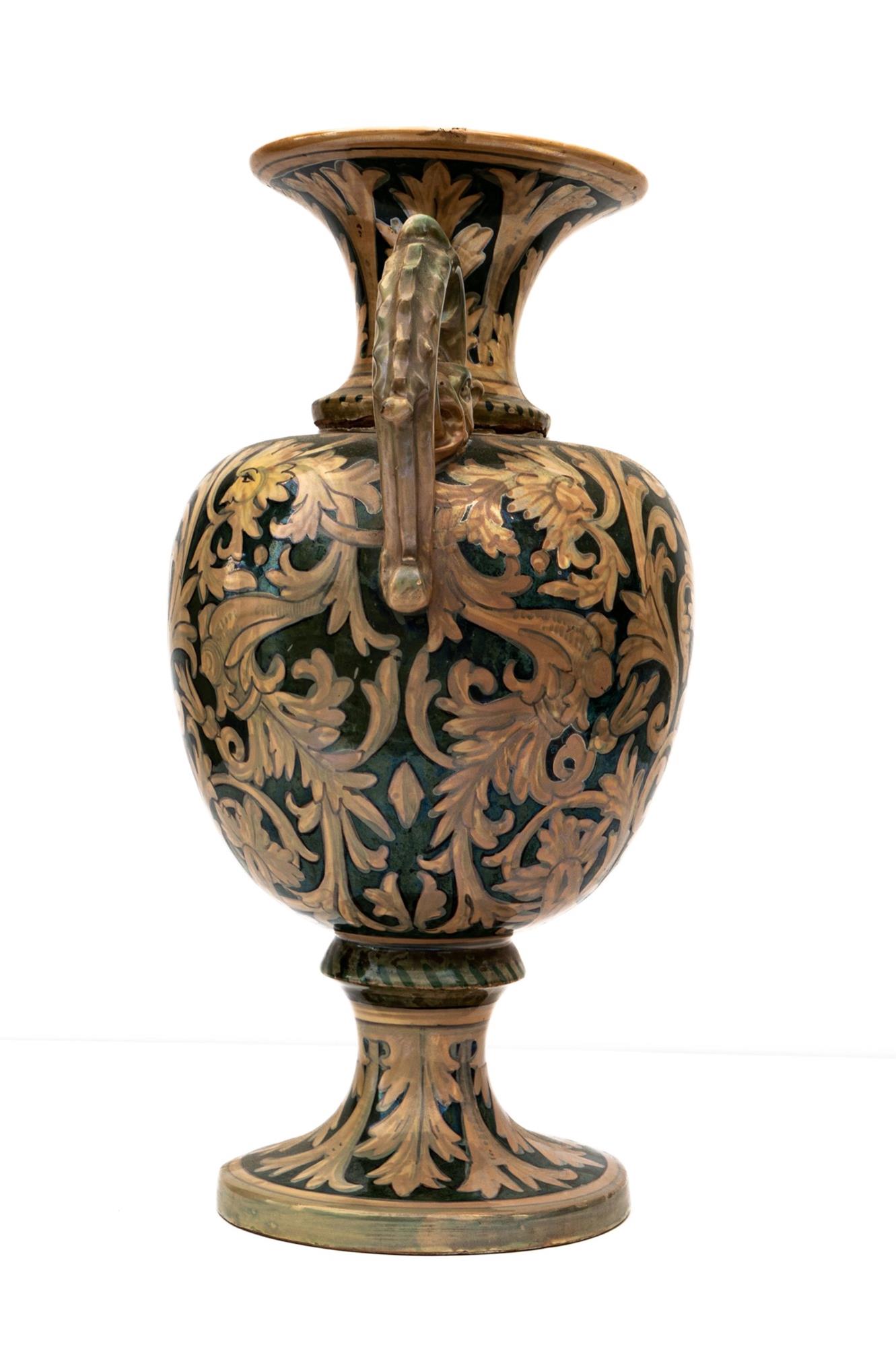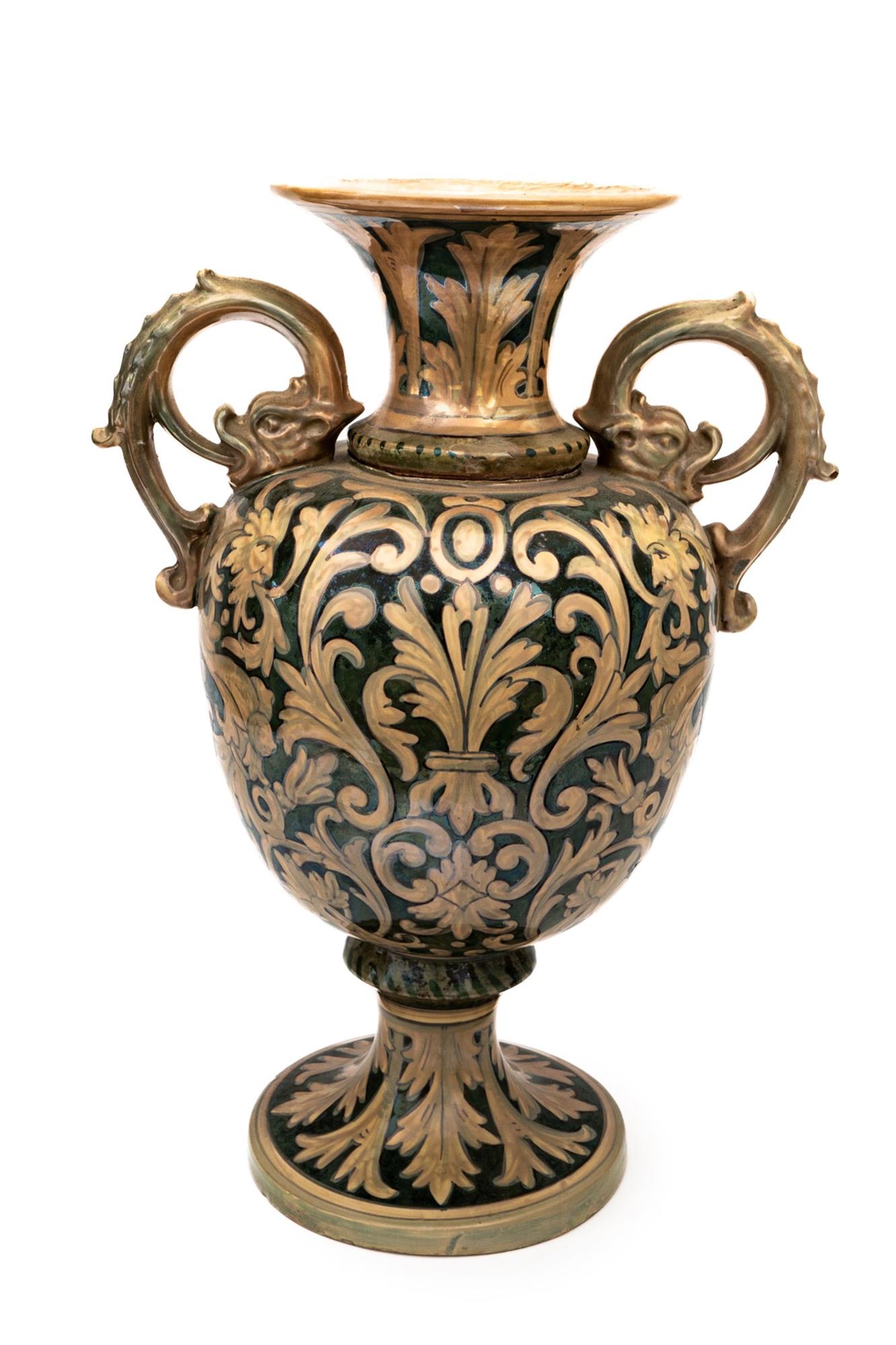 Vaso ad anfora biansato con prese a delfini, a lustro metallico verde decorato a mascheroni e girali fogliati