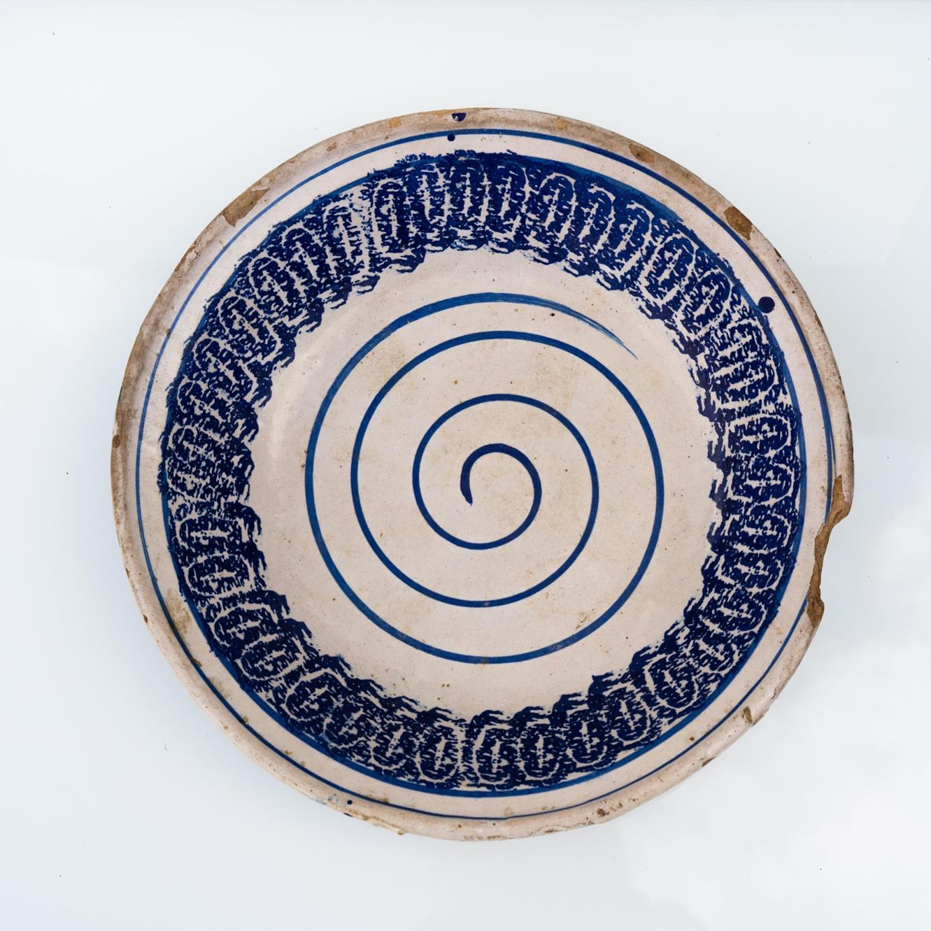 Piatto con decoro a stampino nella tesa e a spirale nel cavetto.