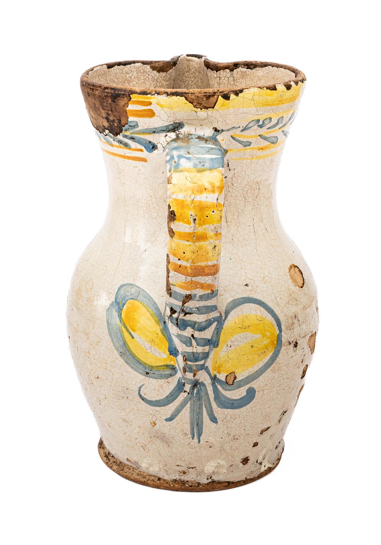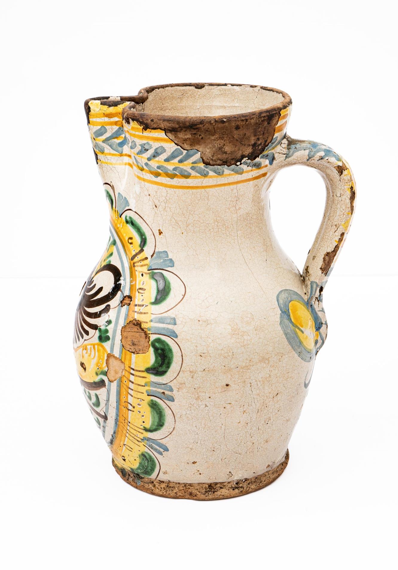 Boccale in maiolica con becco carenato decorato con ampia riserva centrale centrata da uno scudo con al centro un compasso e la figura di un'aquila stilizzata Manifattura campana del XVIII secolo