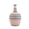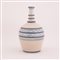 Bottiglia in maiolica a fondo bianco. Corpo ovoidale decorato nei toni del blu a righe. Sul collo anelli a rilievo blu.
