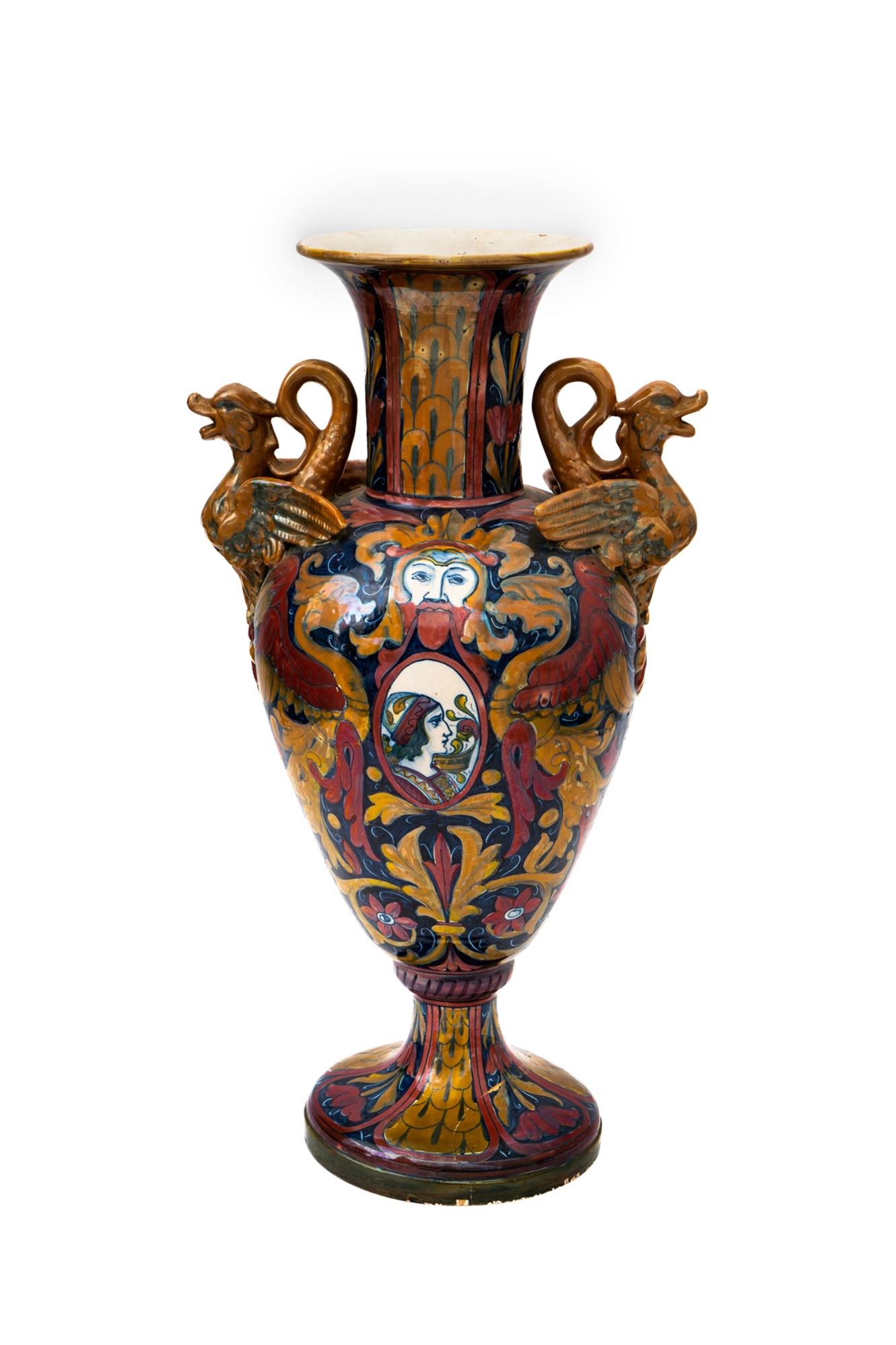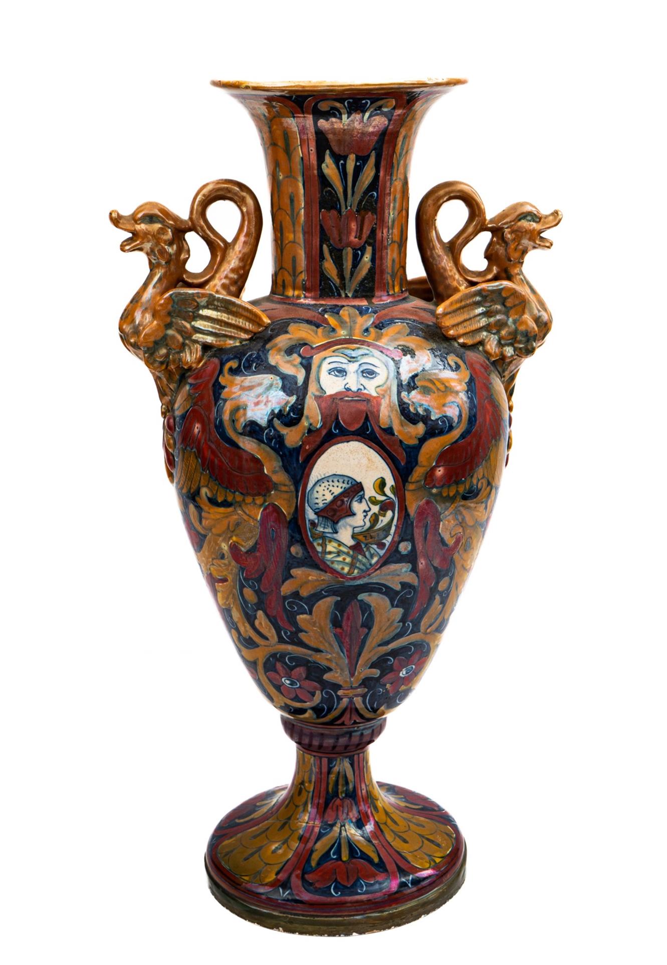 Anfora biansata a lustro rosso con draghi riserve con profili e mascheroni. S.C.M. Gualdo Tadino