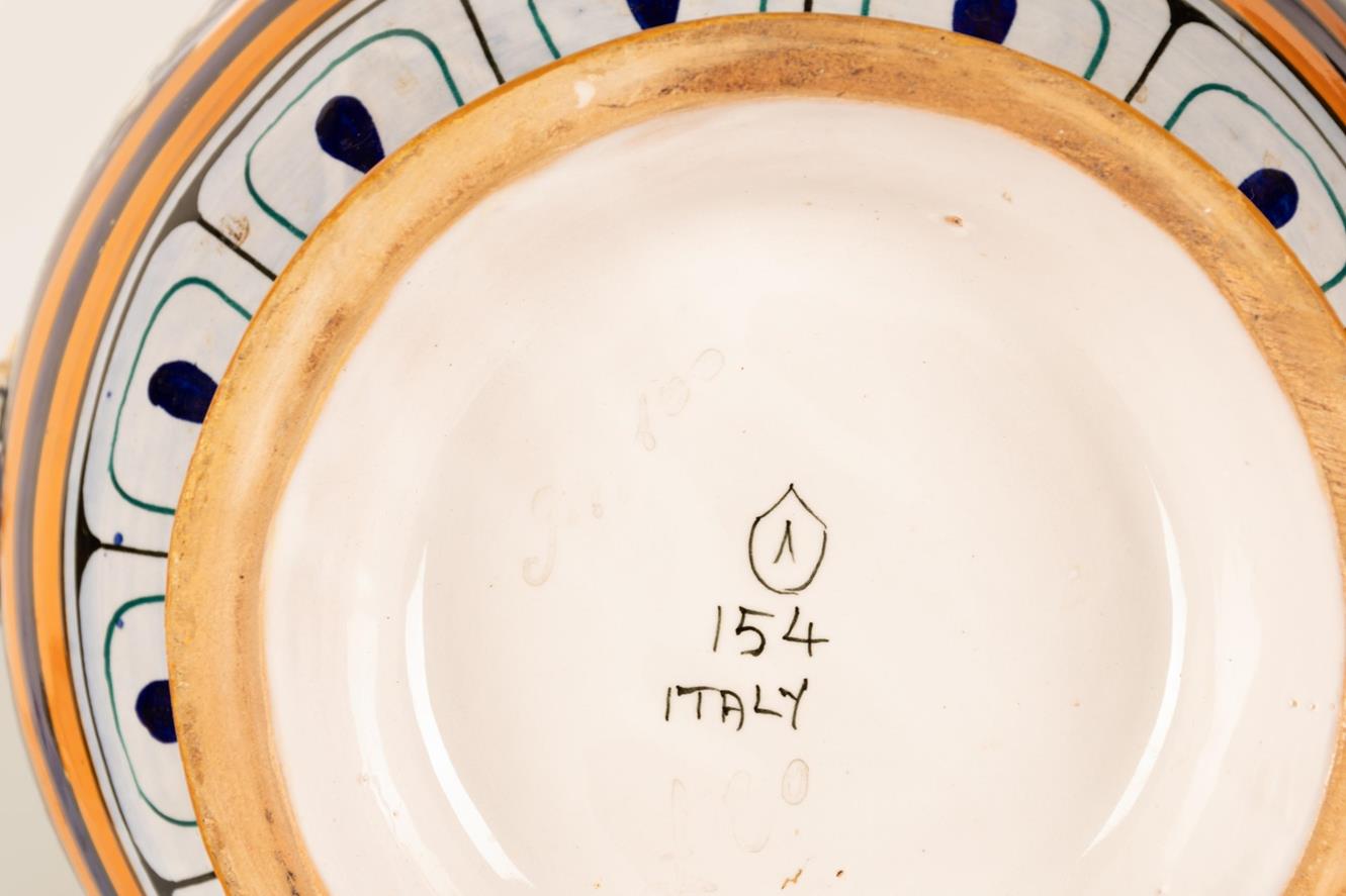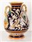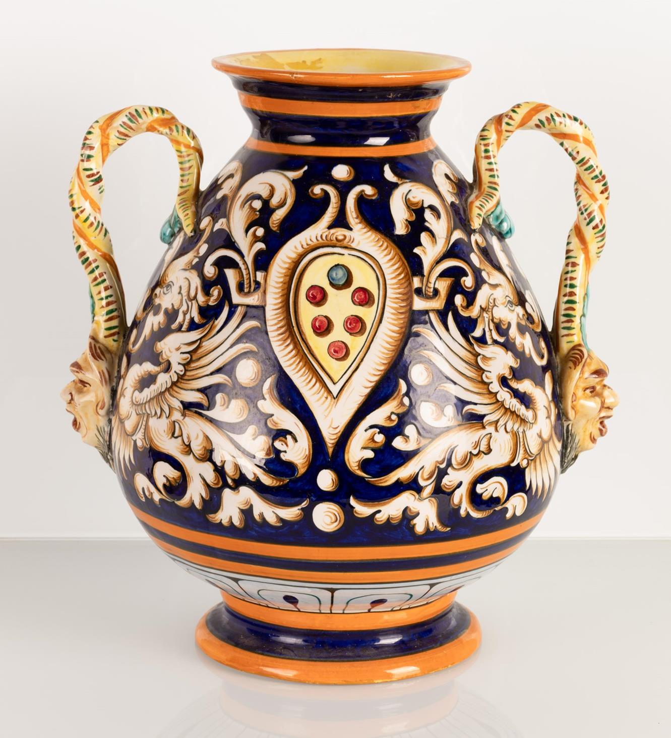 Vaso in maiolica biansato con anse ritorte terminanti a mascheroni antroomorfi. Manifattura Egisto Fantechi, inizi del XX secolo.