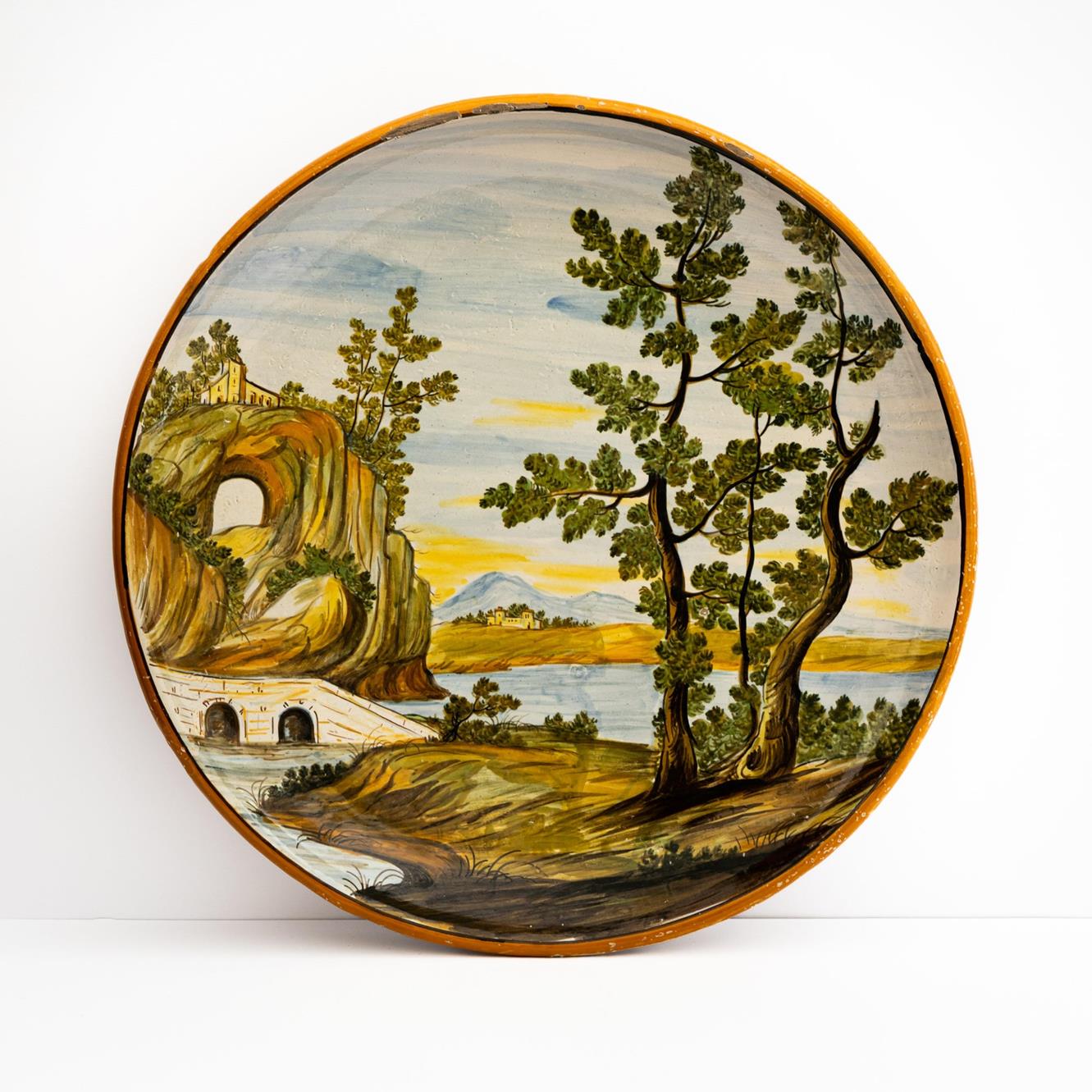 Grande piatto con decoro a paesaggio fluviale e ponte Manifattura di Castelli della metà del XX secolo