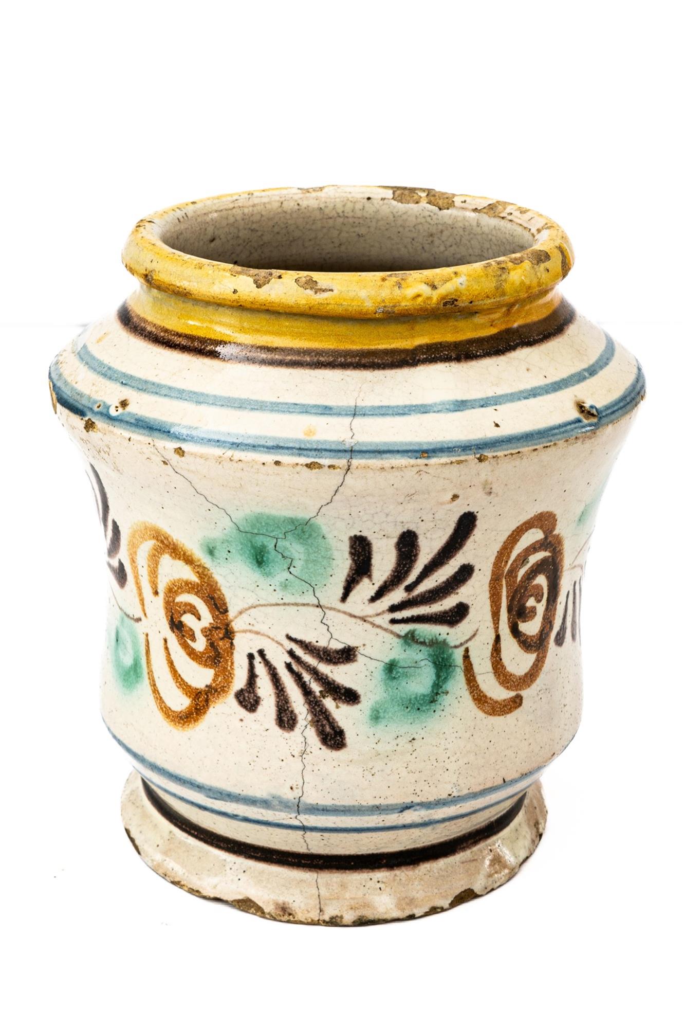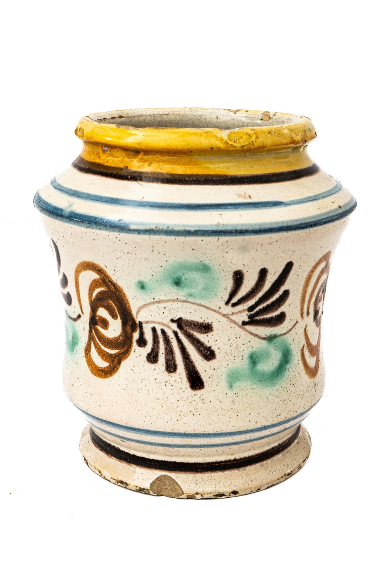 Albarello-pilloliere a corpo rastremato decorato a motivo floreale stilizzato Manifattura di Cerreto Sannita attiva nel XVIII secolo