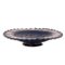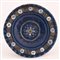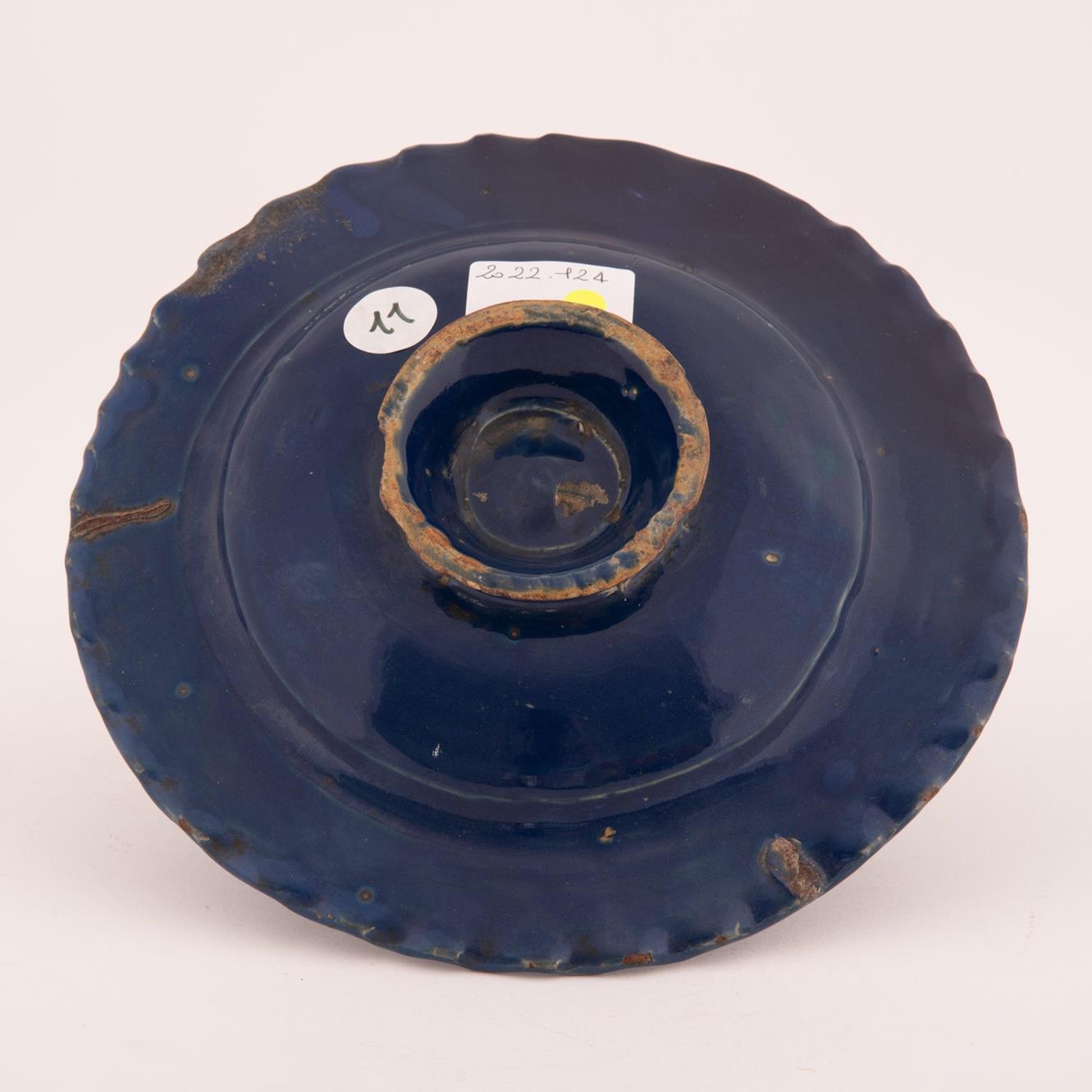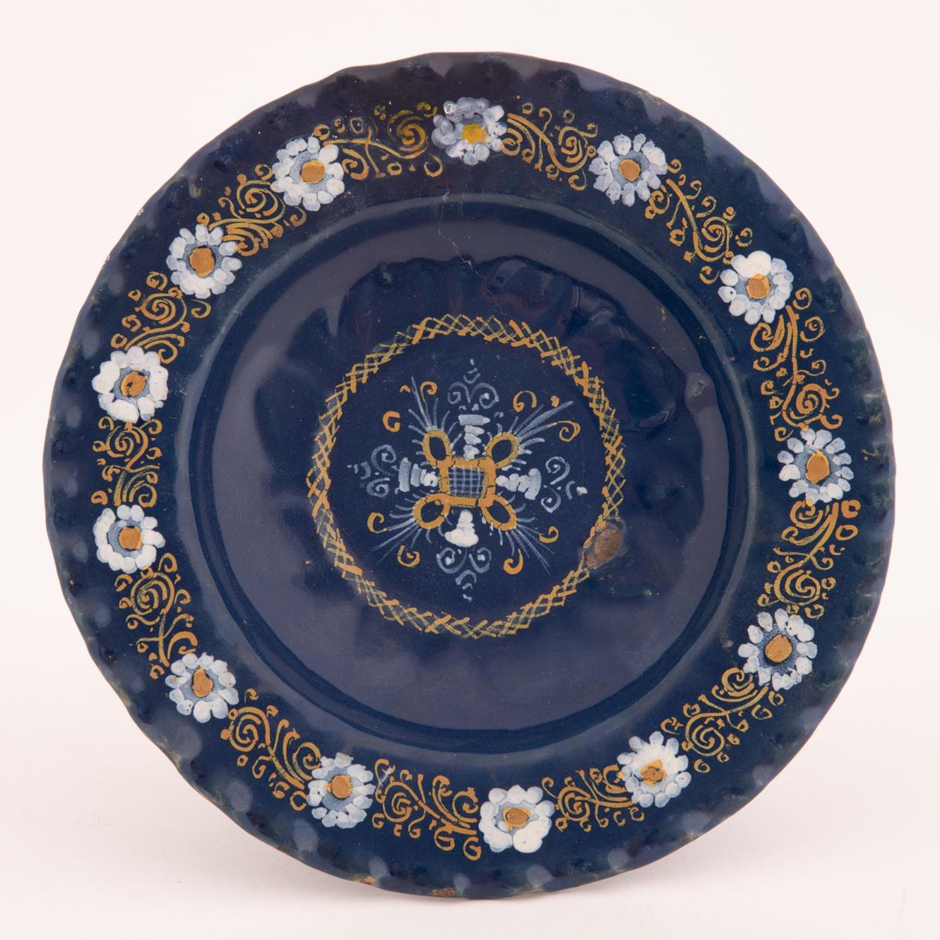 Corpo circolare a fondo blu, con tesa baccellata decorata con fiori bianchi e motivi floreali dorati. Al centro cavetto decorato con motivo floreale quadrilobato contenuto entro ghirlanda dorata.