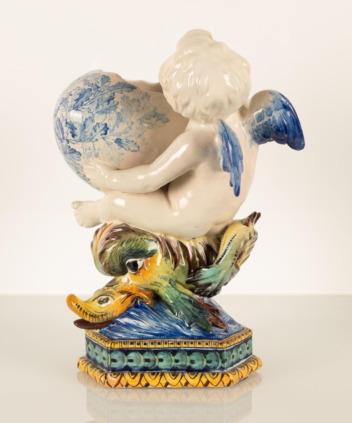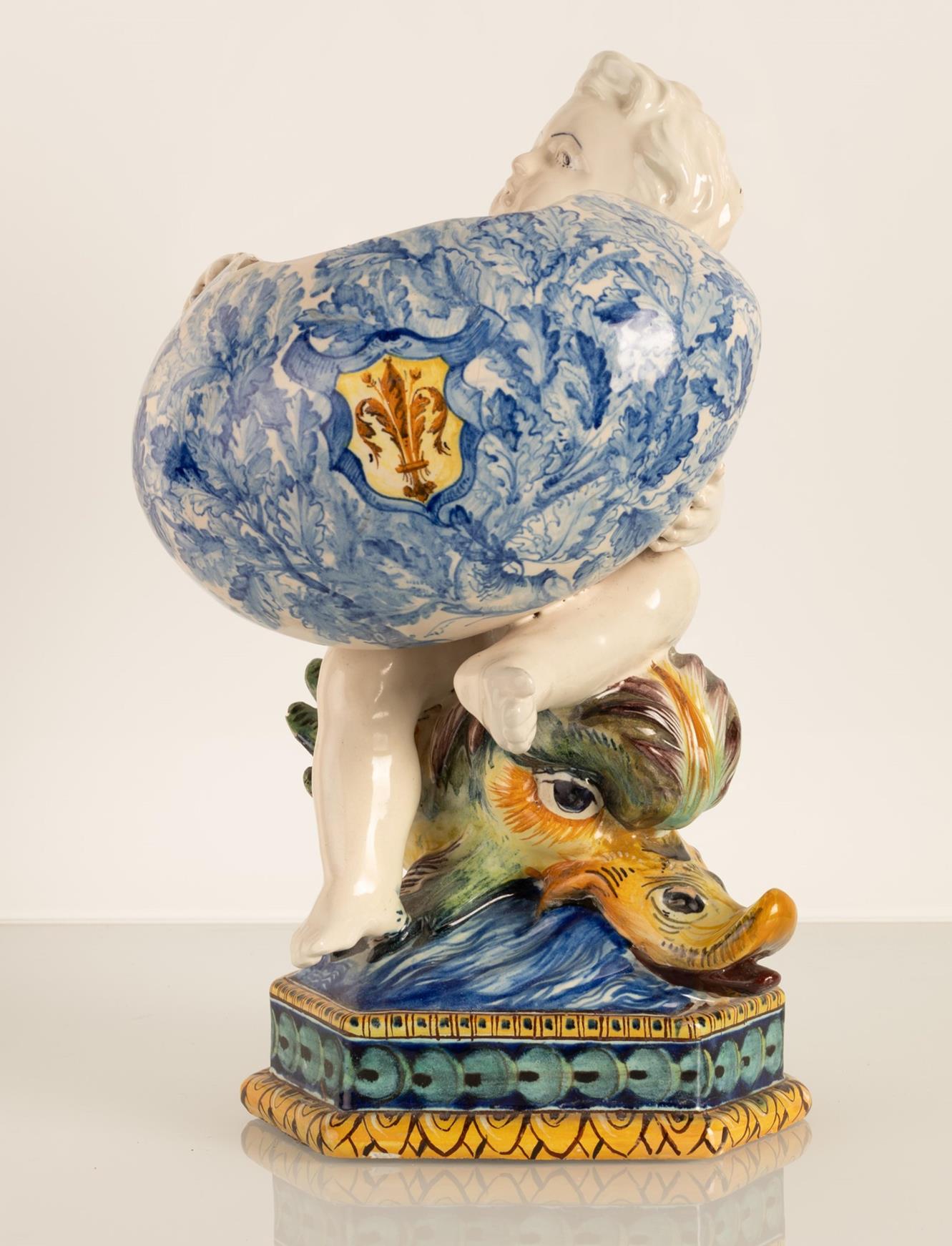 Soprammobile in maiolica portafiori con putto bianco modellato a tutto tondo. Manifattura Cantagalli, XX secolo