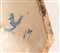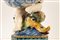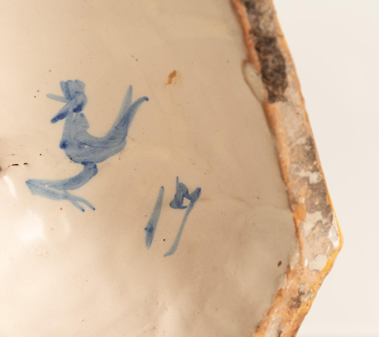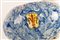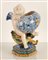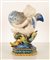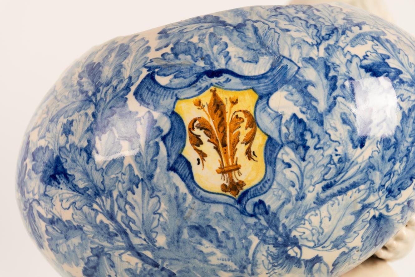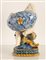 cm 26x19x13 La figura, assisa su un animale marino, stante a trattenere un uovo aperto nella parte superiore decorato con foglie di quercia blu e centrato in riserva giallo da un giglio di Firenze in manganese.