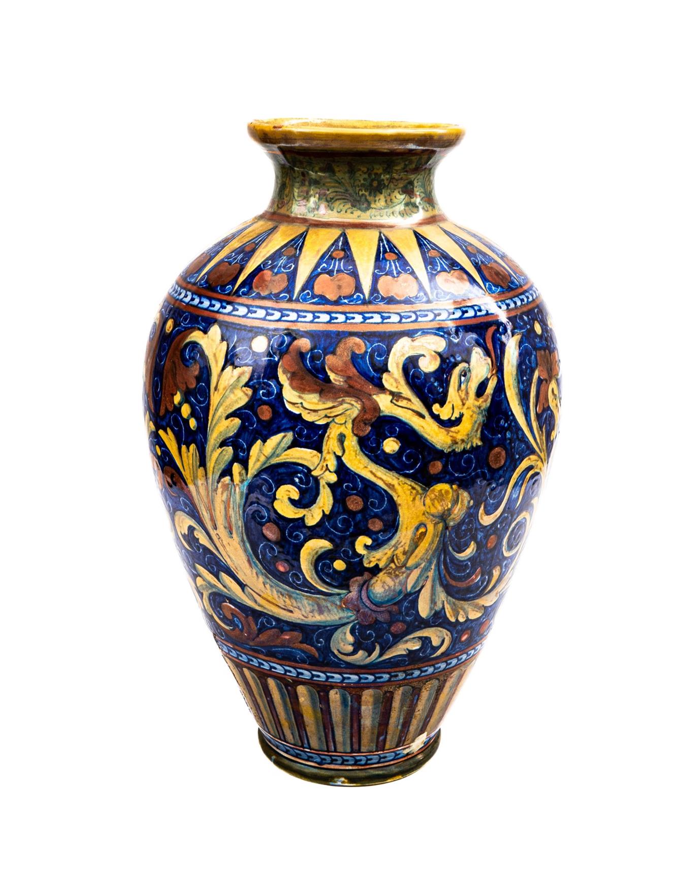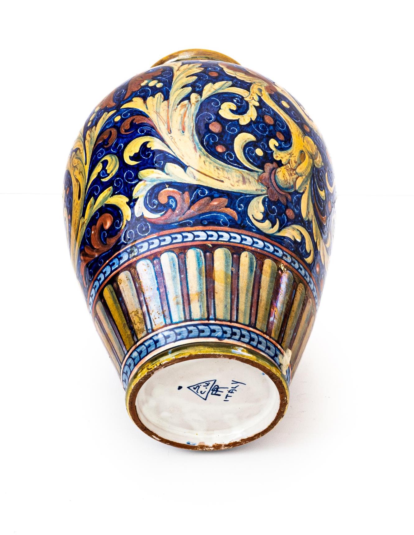 Vaso in maiolica decorata a lustro metallico con campo ovoidale decorato a grottesche stanti a racchiudere un medaglione centrale recante profilo di uomo con elmo e un fiore entro ghirlanda robbiana. S.C.U. (Società Ceramica Umbra)