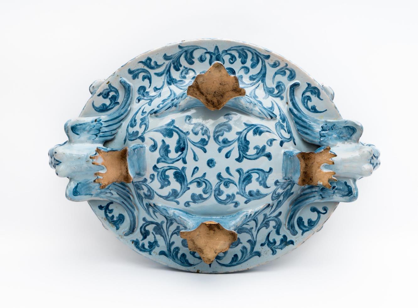 Centrotavola in maiolica nei toni dell'azzurro poggiante su quattro piedi a foggia di mascheroni urlanti. Manifattura dell'Italia Centrale della fine del XIX secolo