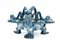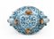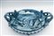 Centrotavola in maiolica nei toni dell'azzurro poggiante su quattro piedi a foggia di mascheroni urlanti. Manifattura dell'Italia Centrale della fine del XIX secolo