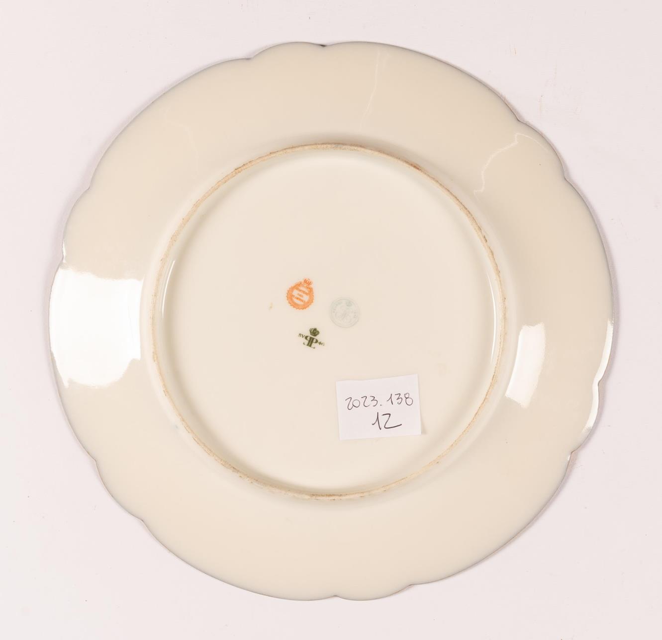 Piatto in porcellana Sevres con tesa a fondo blu e decoro in oro a volute e racemi. XIX secolo