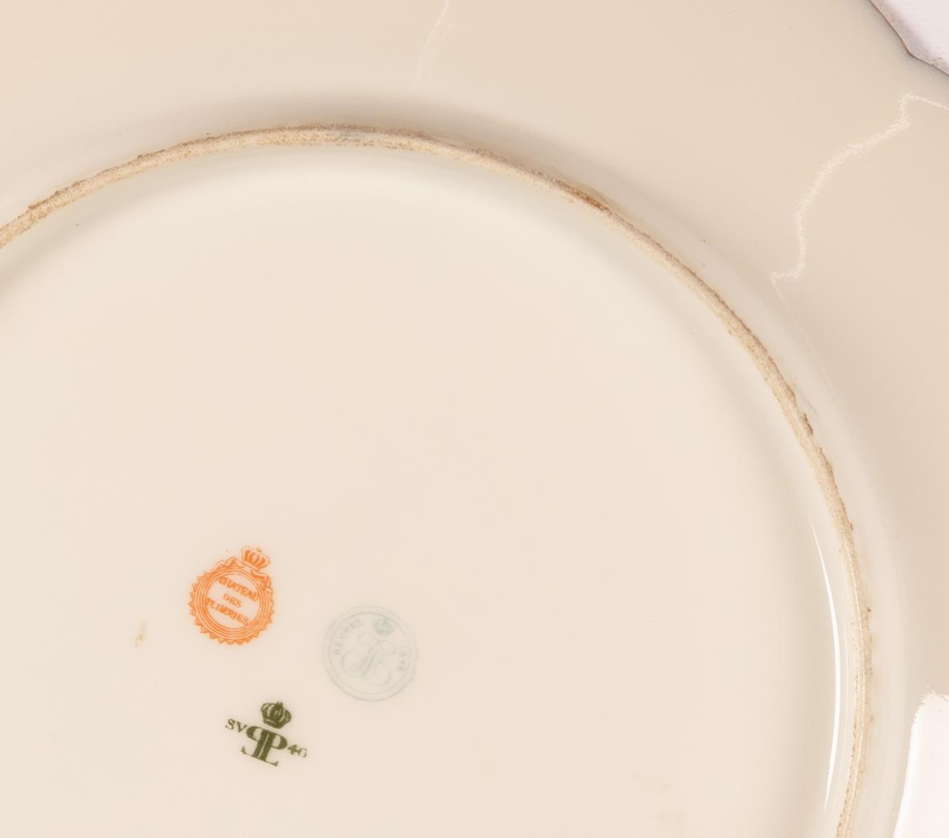 Piatto in porcellana Sevres con tesa a fondo blu e decoro in oro a volute e racemi.