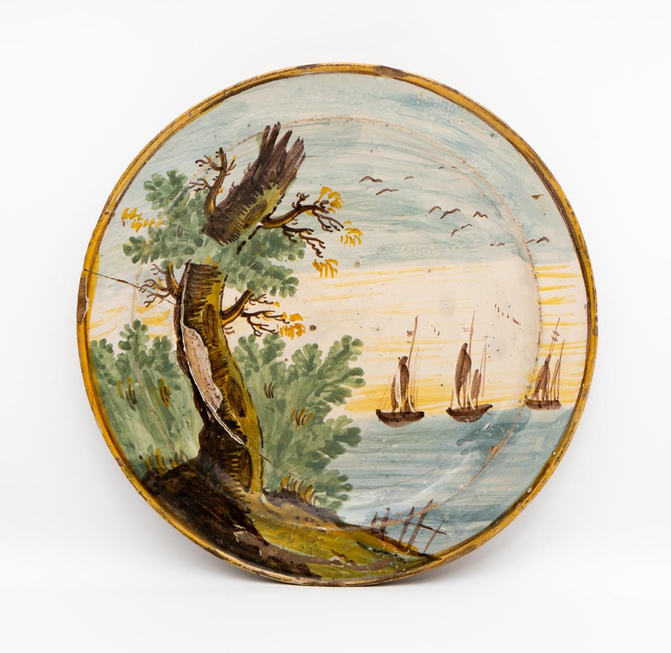 Grande piatto con decoro a paesaggio e barche sullo sfondo Manifattura di Torre de' Passeri della fine del XVIII secolo