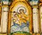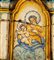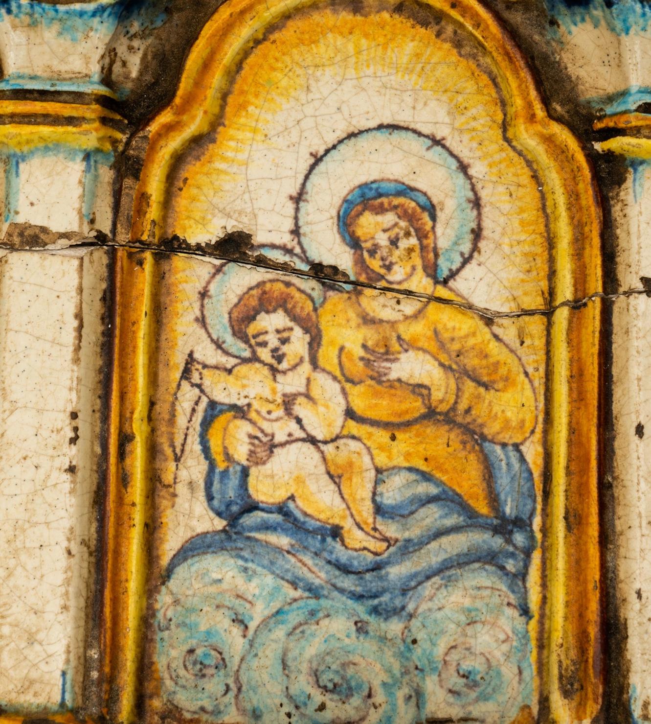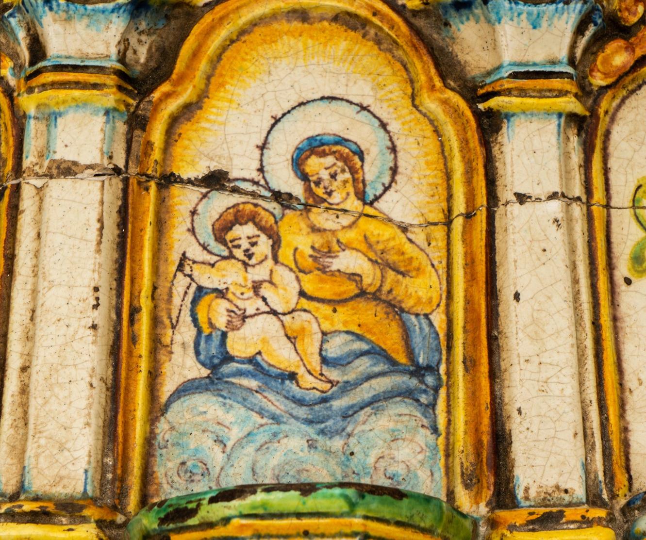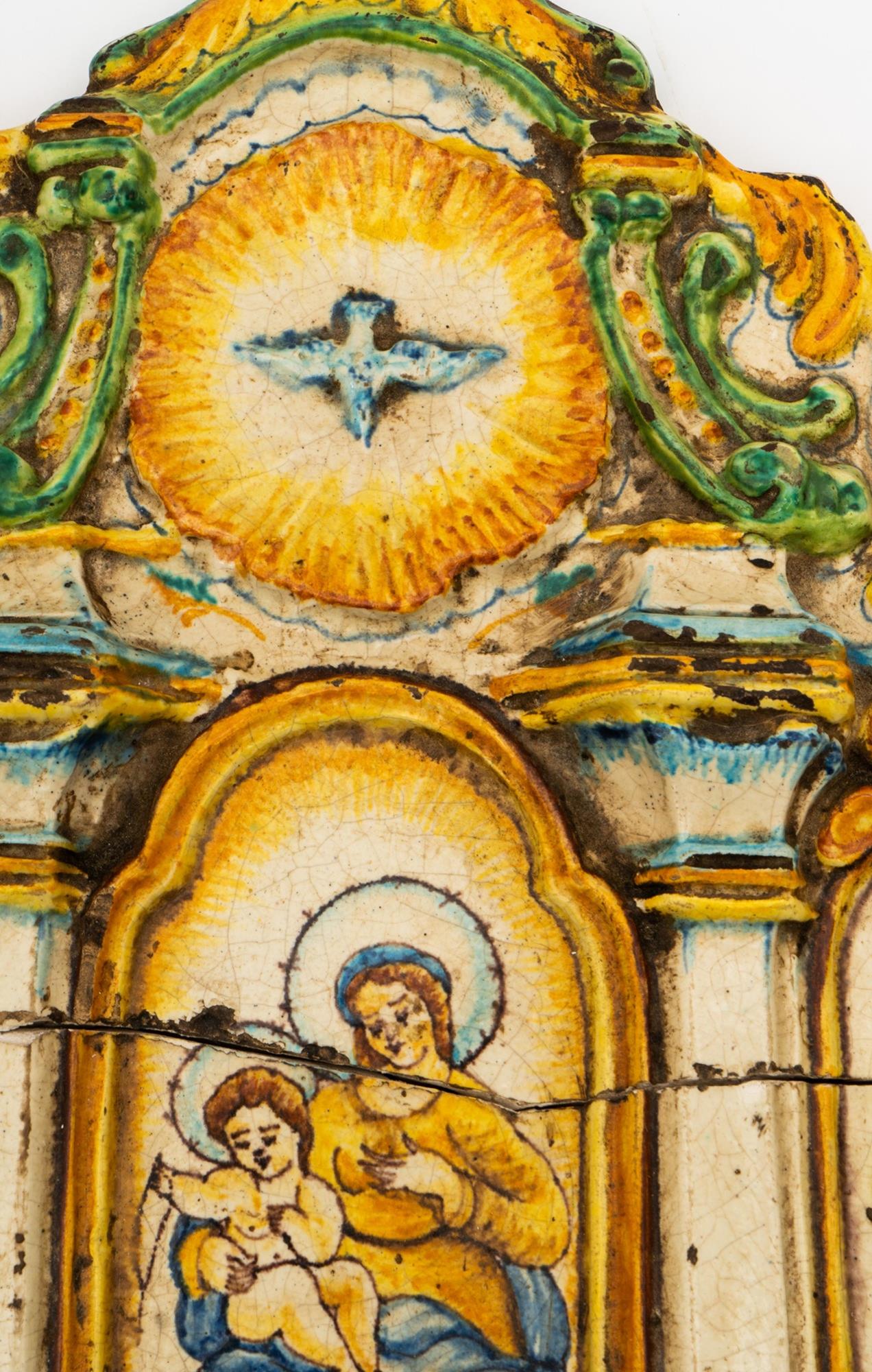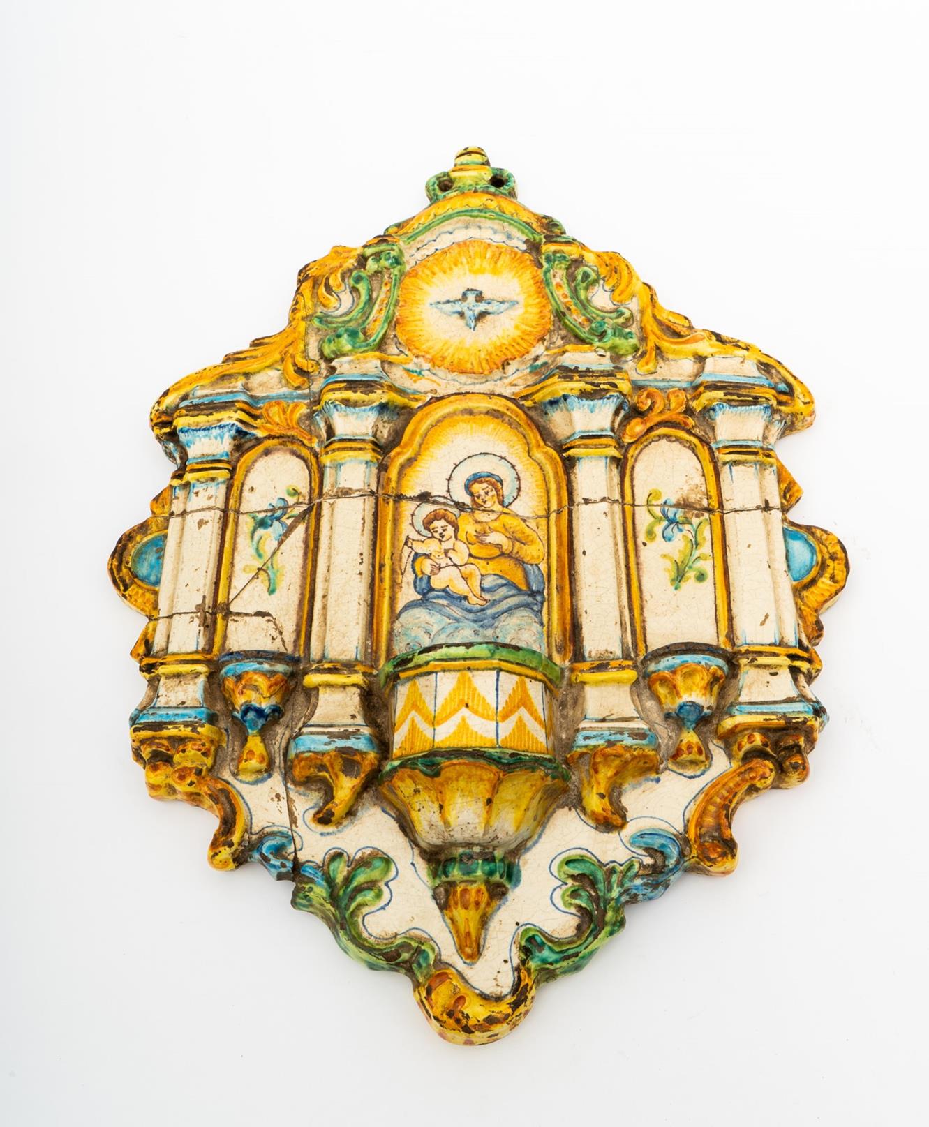 Grande acquasantiera del XIX secolo, manifattura di Ariano Irpino con effige della Madonna del Rosario che tiene in braccio Gesù Bambino